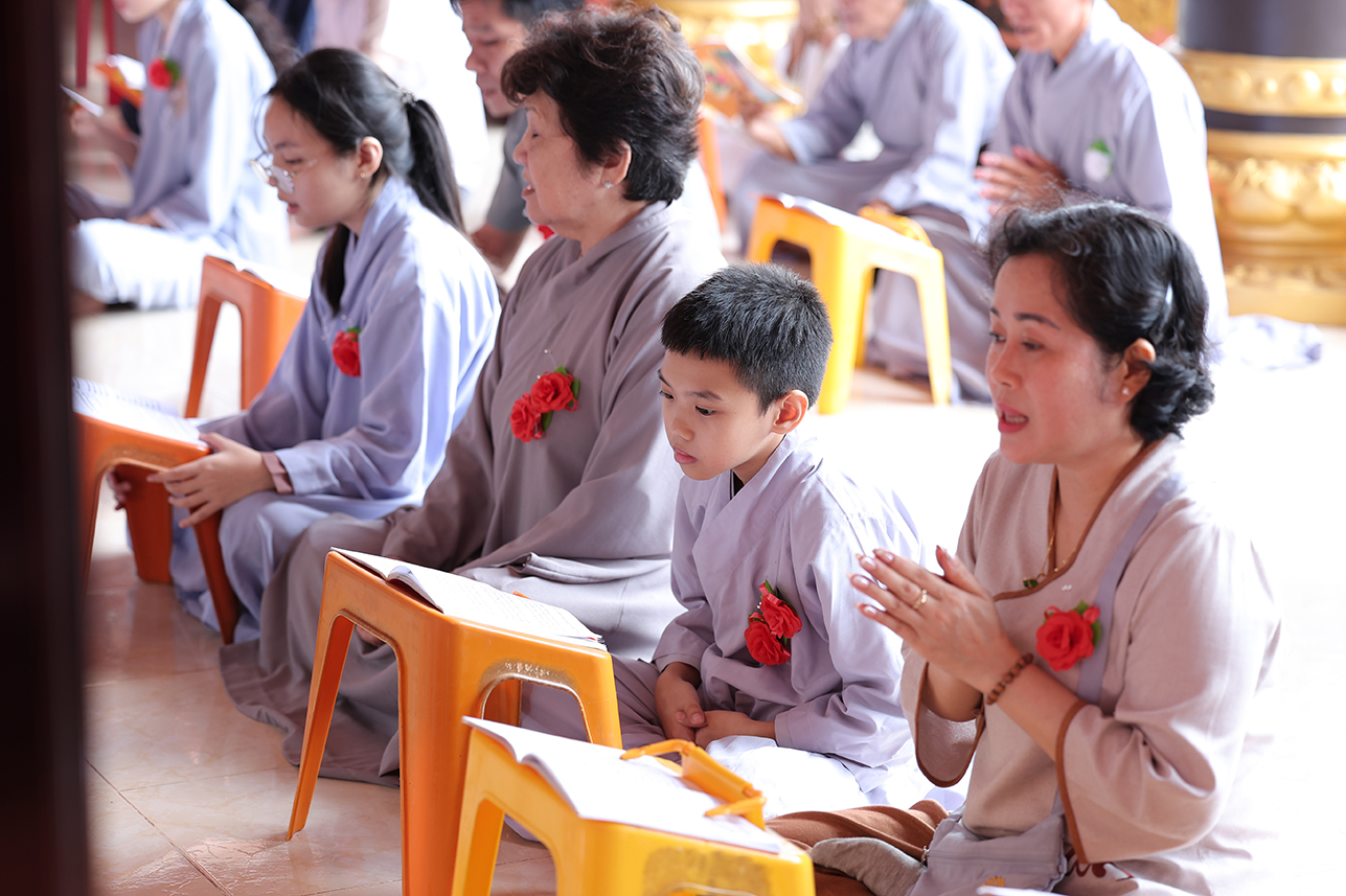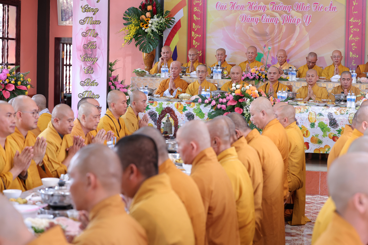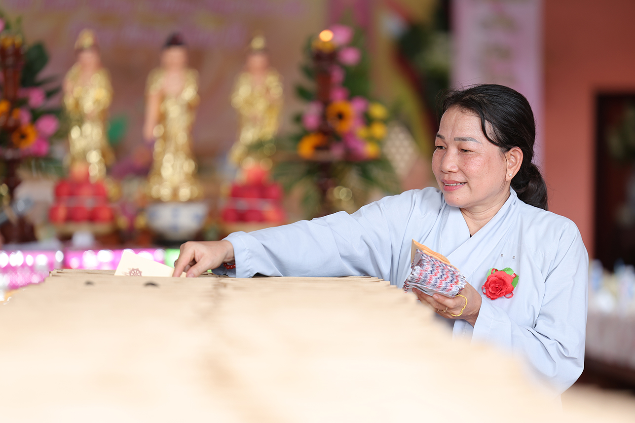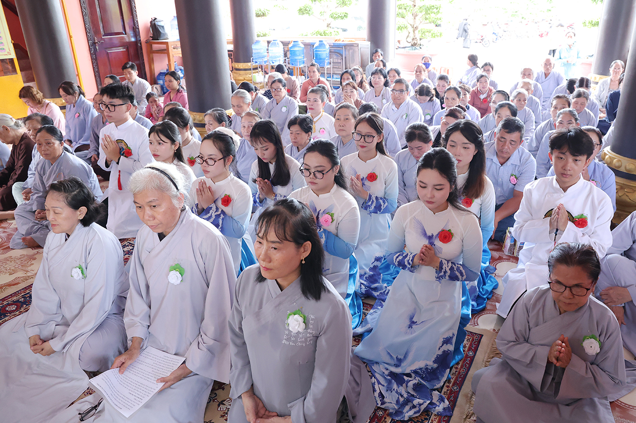Tại buổi lễ, đại chúng đã lắng lòng tri ân với nghi thức Cài hoa hồng tưởng nhớ Tứ Ân. Những đóa hoa hồng được cài lên ngực áo như một biểu tượng nhắc nhở mỗi người con về công ơn sinh thành dưỡng dục của cha mẹ, cũng như lòng tri ân sâu sắc đối với Tam bảo, đối với quốc gia dân tộc và ân thí chủ đàn na.