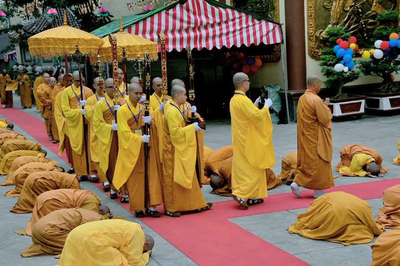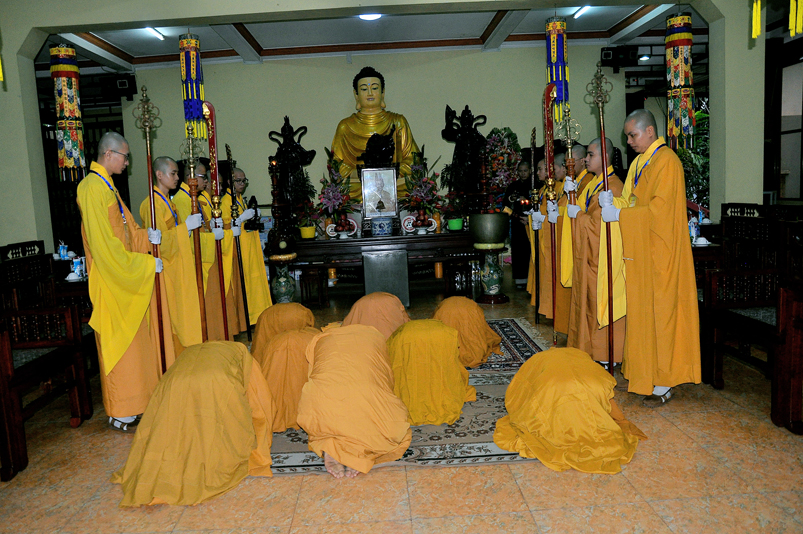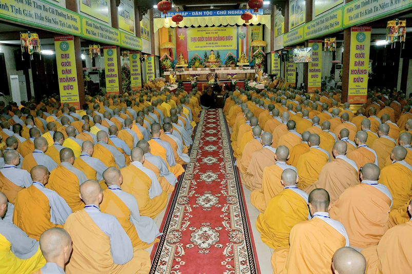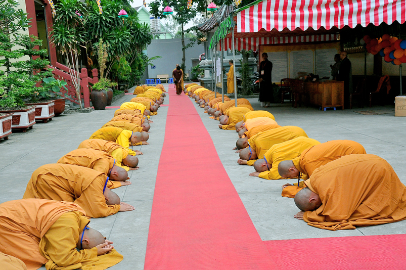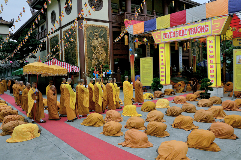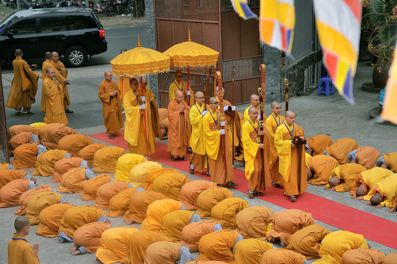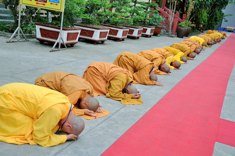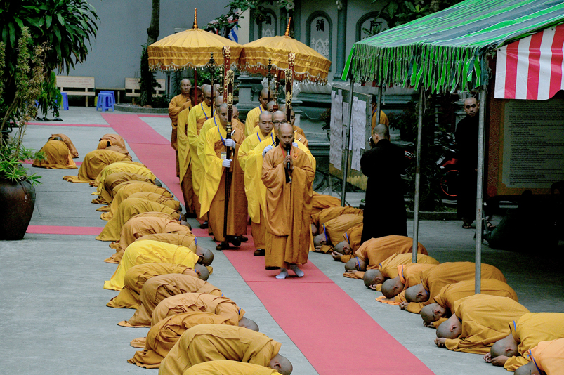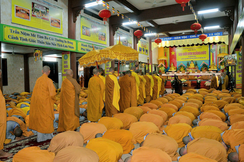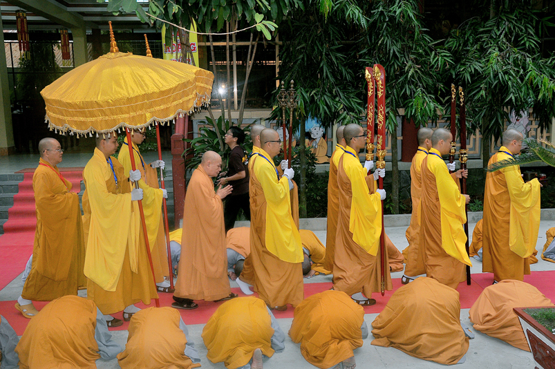 Đúng 6g50, Ban Tổ chức thành kính bạch thỉnh cung nghinh Trưởng lão Hòa thượng đăng lâm Giới trường thăm hỏi vấn an Ban Kiến Đàn và. Hơn 800 Giới tử tại hai trú xứ Giới trường đồng trang nghiêm phủ phục năm vóc cung nghinh.