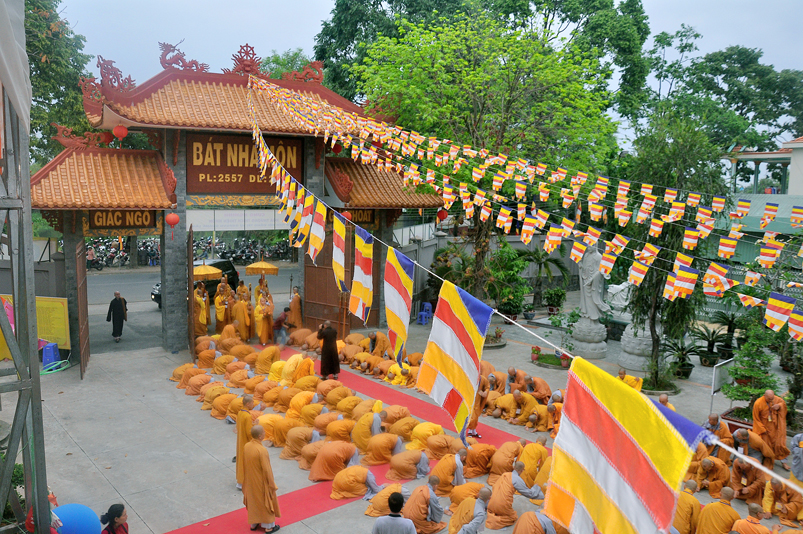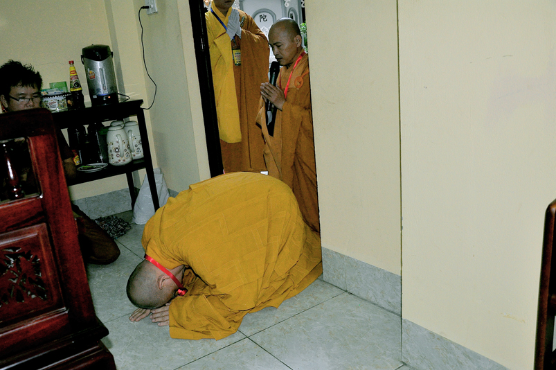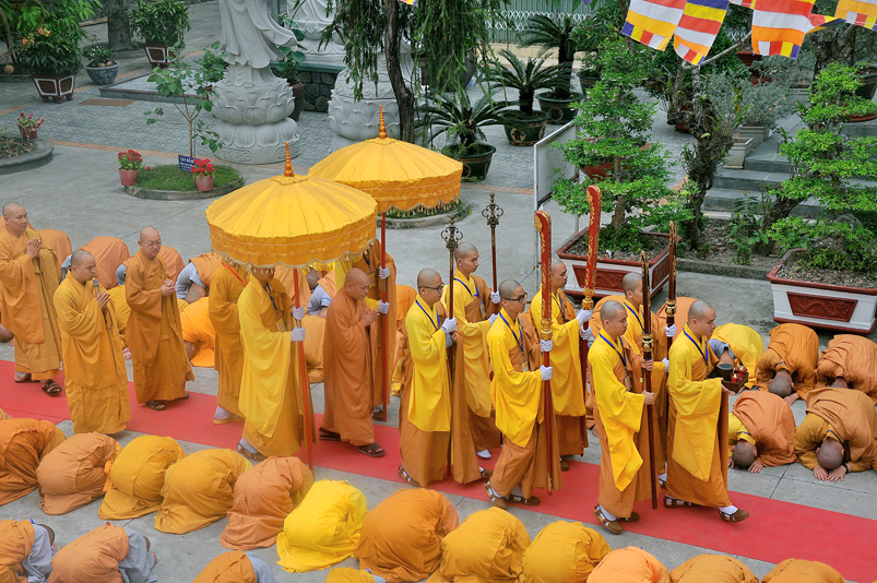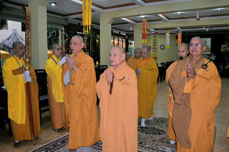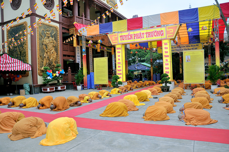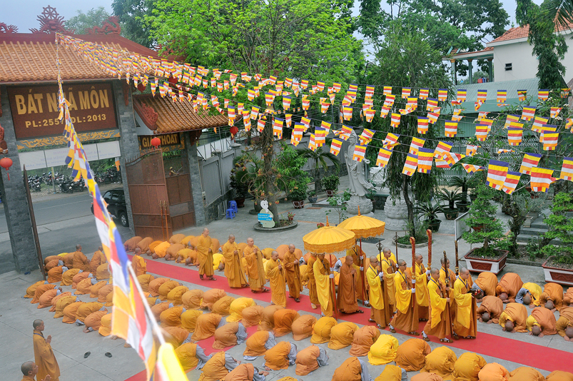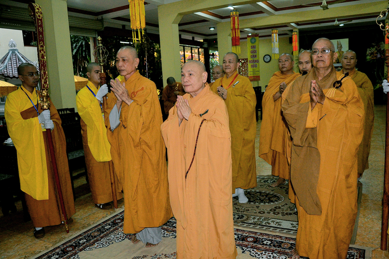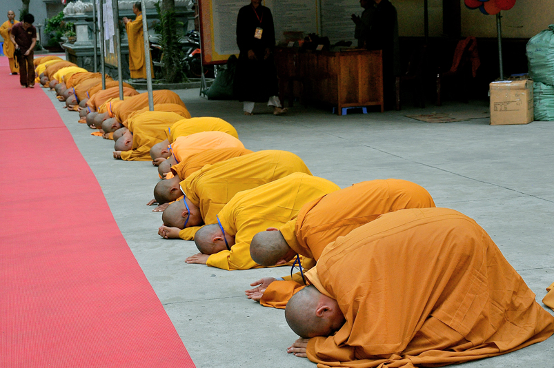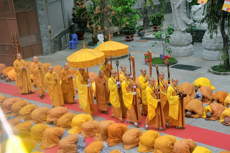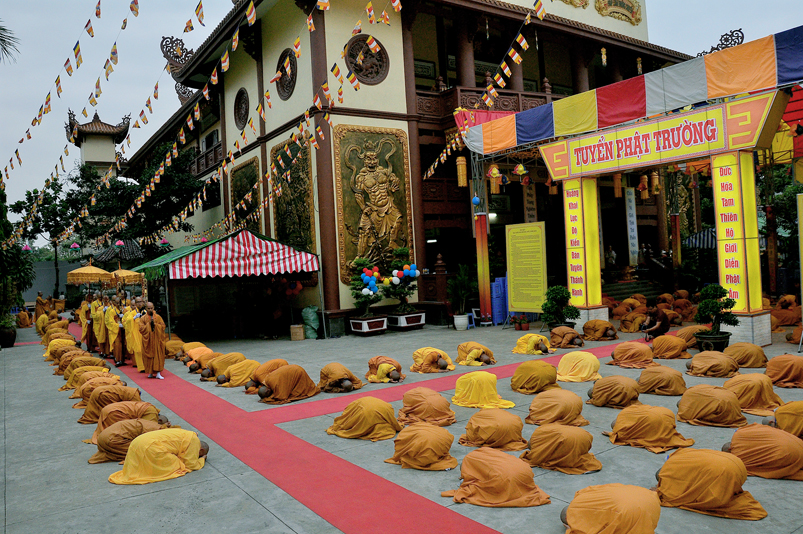 Đúng 6g50, Ban Tổ chức thành kính bạch thỉnh cung nghinh Trưởng lão Hòa thượng đăng lâm Giới trường thăm hỏi vấn an Ban Kiến Đàn và. Hơn 800 Giới tử tại hai trú xứ Giới trường đồng trang nghiêm phủ phục năm vóc cung nghinh.