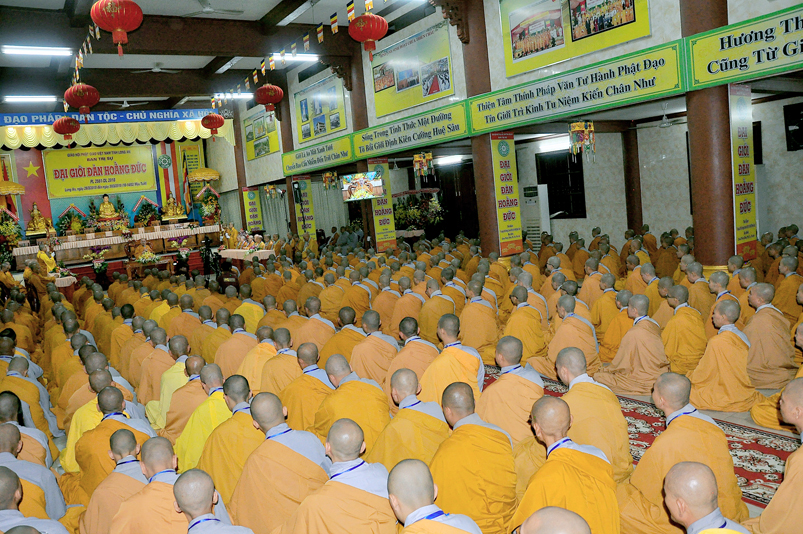Ngày 30/3/2018 (14/2/Mậu Tuất), trước giờ Bế mạc, Ban Kiến đàn Đại Giới Đàn Hoằng long trọng cung tiếp Trưởng lão Hòa thượng đạo hiệu Thích Thiện Nhơn -Chủ tịch HĐ TSTW quang lâm Giới trường, ban lời giáo giới.