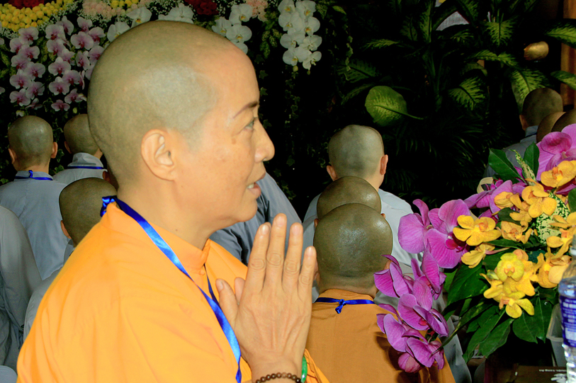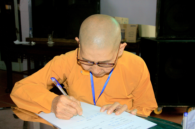 Sau phần khai mạc, Hòa thượng đích thân trao đề thi cho NT. Tuệ Đăng -Phó chánh chủ khảo Đại giới đàn.