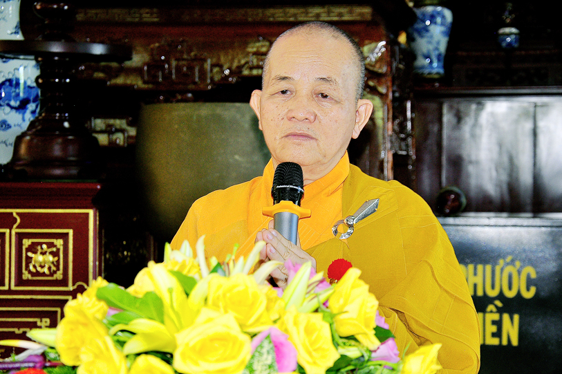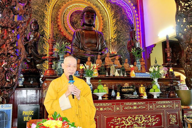 Chứng minh buổi lễ, HT. Thích Minh Thiện ân cần ban đạo từ. Trước hết, Ngài chú ý nhắc nhở bối cảnh tình hình xã hội hiện tại “dịch bệnh” vẫn còn đang tiềm ẩn, mong mỏi mọi người tuân thủ đúng theo luật định, cùng nhau tiếp sức ngăn chặn dịch bệnh, giúp nước nhà ổn dịnh phát triển nền kinh tế.