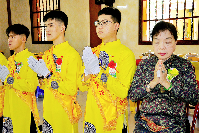 Giây phút thiêng liêng hoài vọng ân cha mẹ, không gian chùa Thiên Châu hòa trong tiếng nhạc trầm buồn da diết, dạt dào biết bao cảm xúc khi đoàn Phật tử hành lễ Cài hoa.