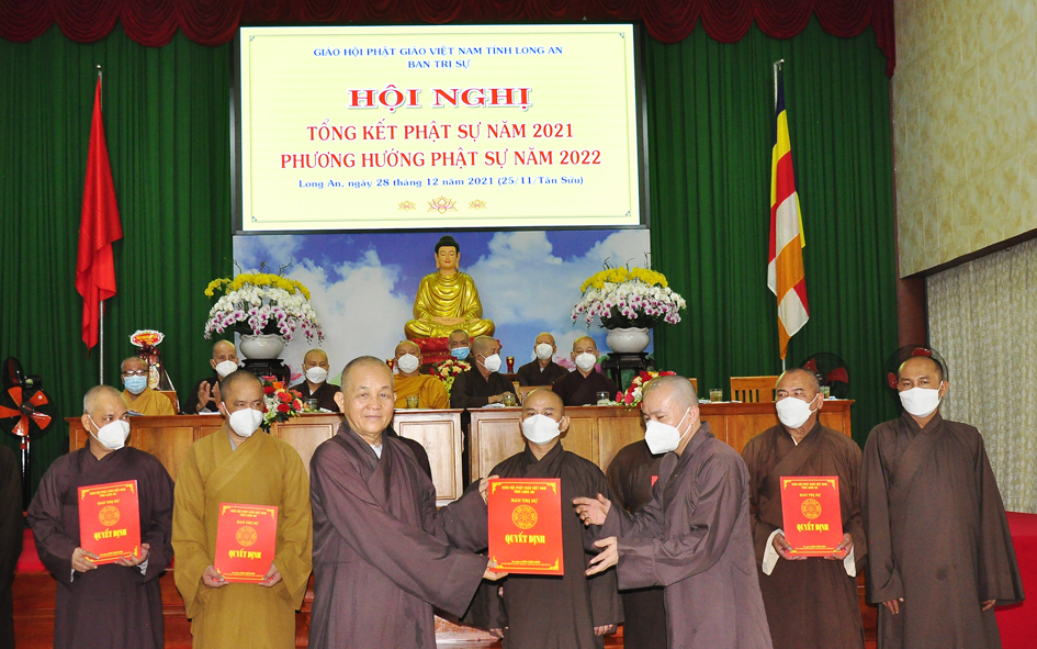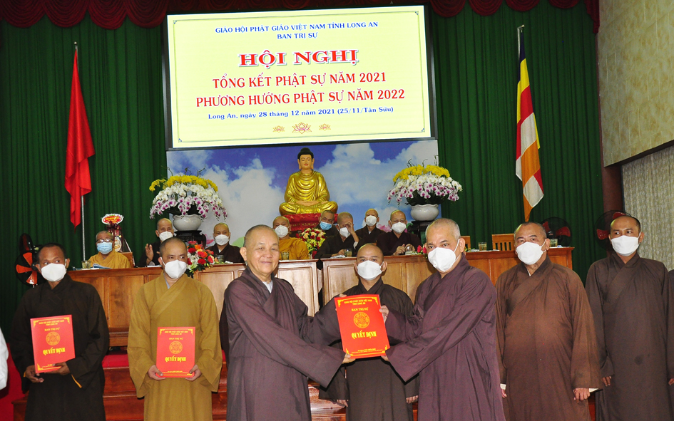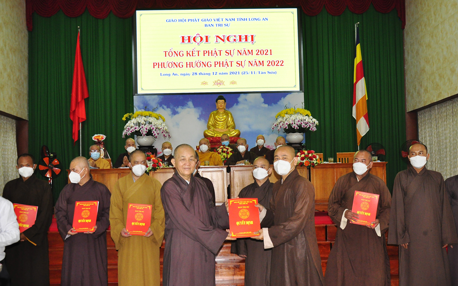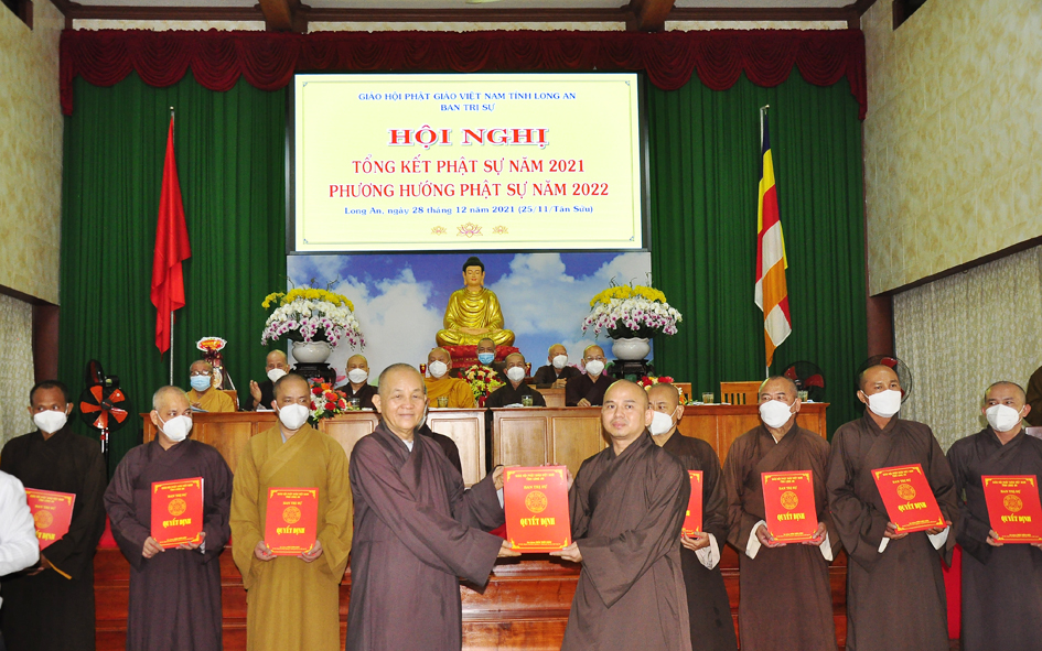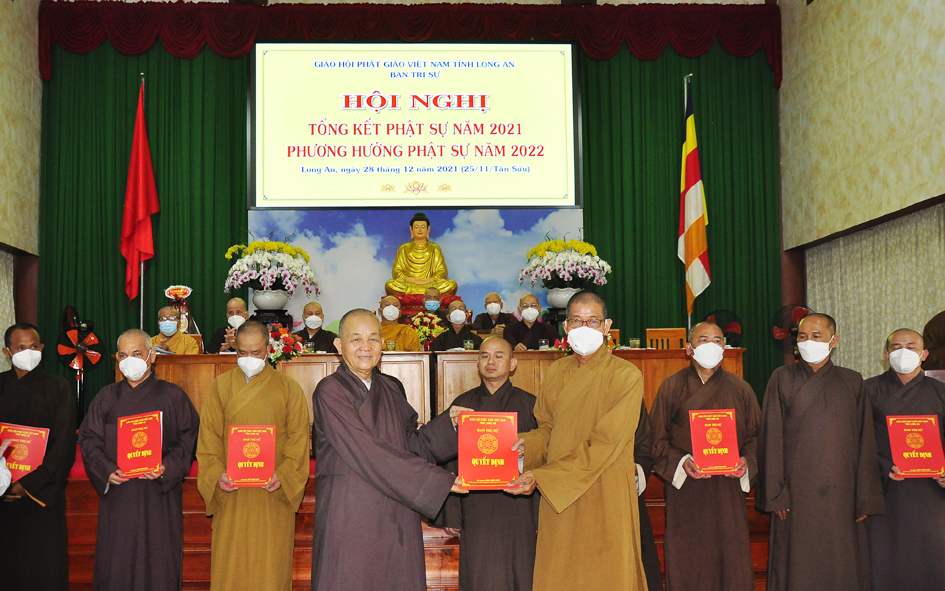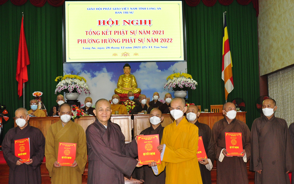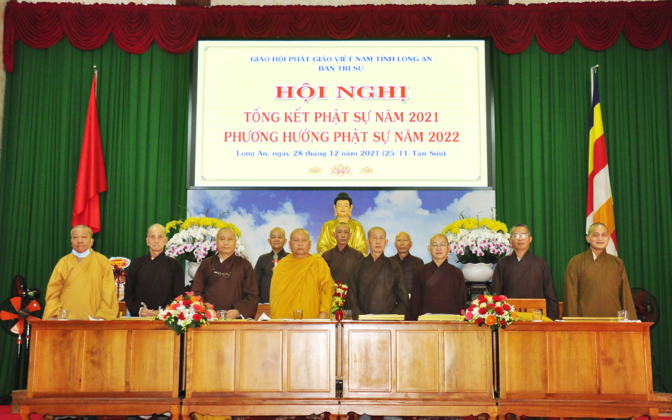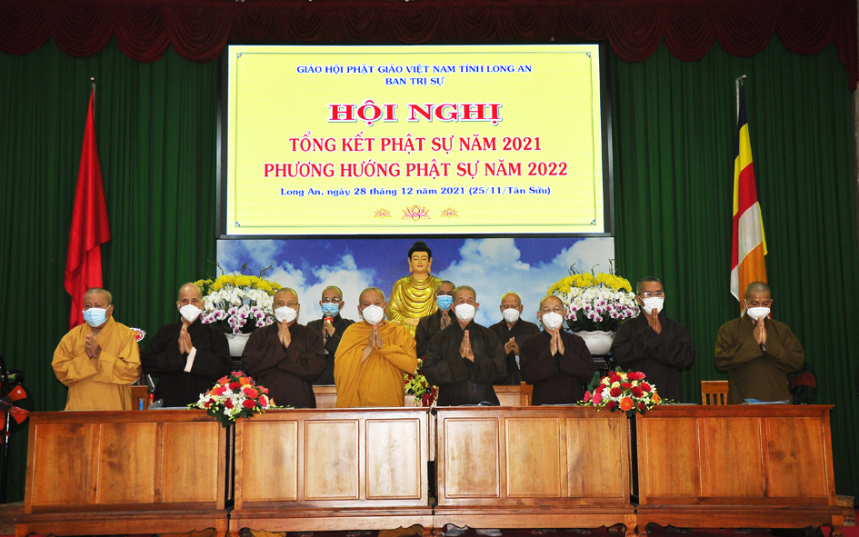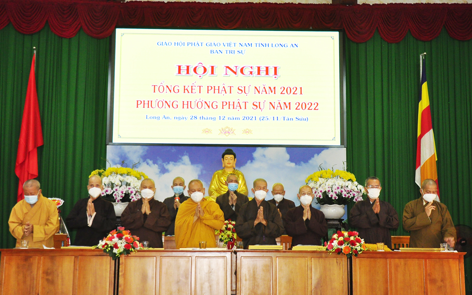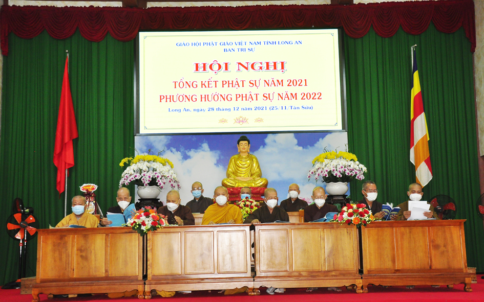 Sáng ngày 28 tháng 12 năm 2021, Ban Trị sự GHPGVN tỉnh Long An tổ chức hội nghị Tổ chức công tác Phật sự năm 2021 và triển khai phương hướng hoạt động năm 2022 tại Hội trường văn phòng Ban trị sự GHPGVN tỉnh Long An, (chùa Thiên Châu, Phường 3, Tp Tân An, tỉnh Long An).