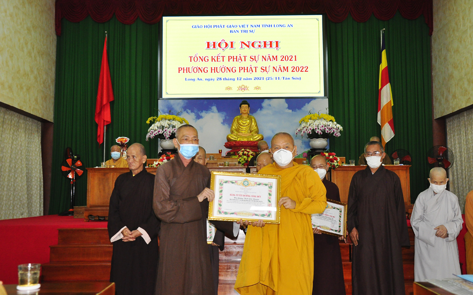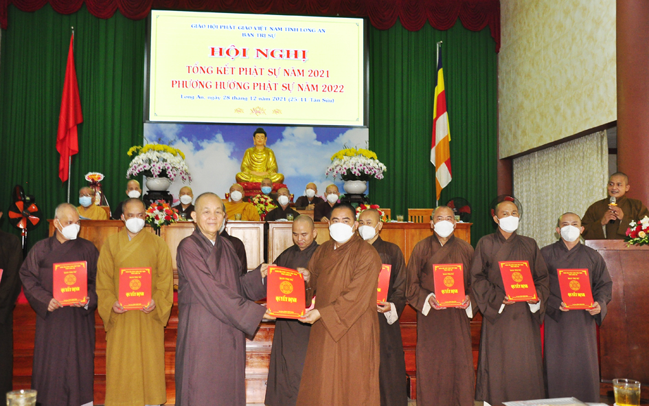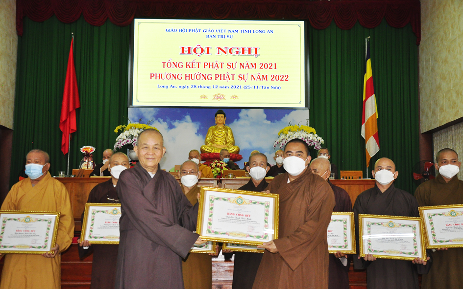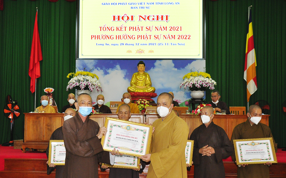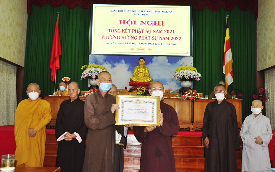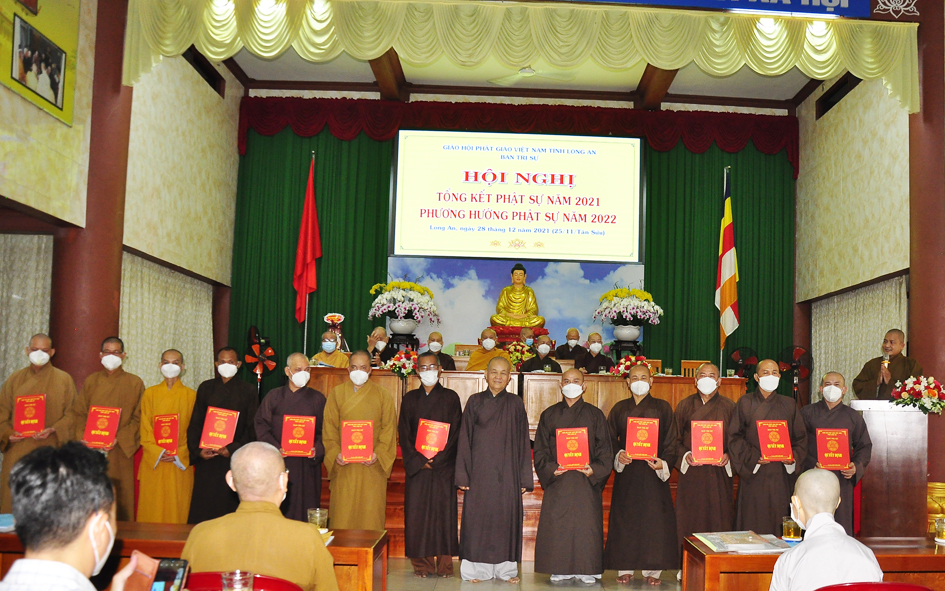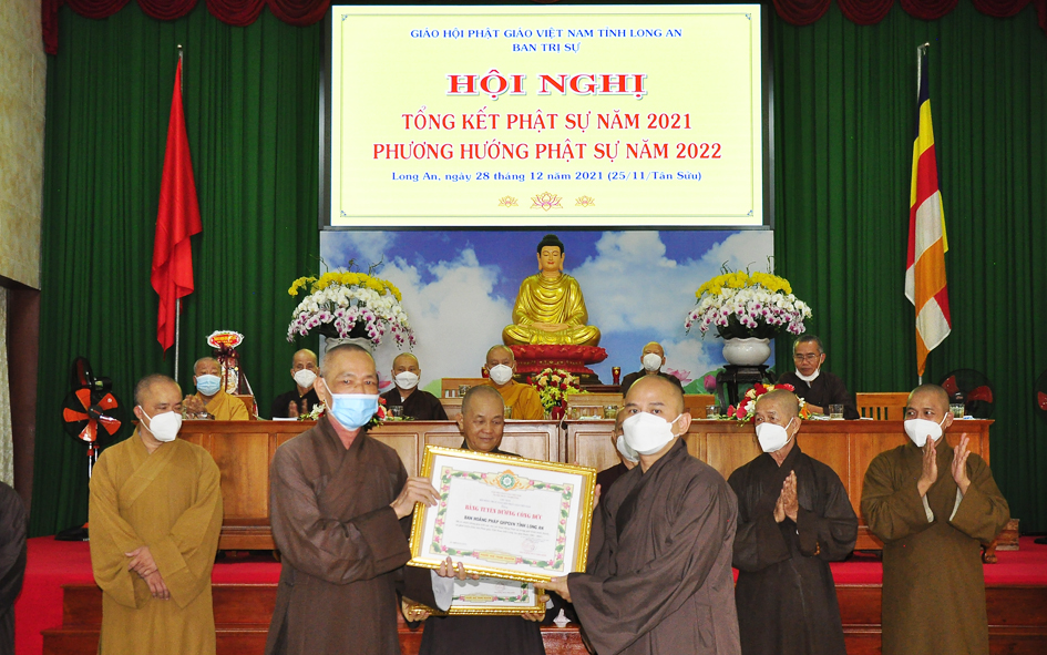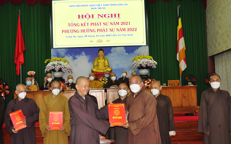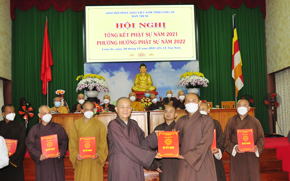 Sáng ngày 28 tháng 12 năm 2021, Ban Trị sự GHPGVN tỉnh Long An tổ chức hội nghị Tổ chức công tác Phật sự năm 2021 và triển khai phương hướng hoạt động năm 2022 tại Hội trường văn phòng Ban trị sự GHPGVN tỉnh Long An, (chùa Thiên Châu, Phường 3, Tp Tân An, tỉnh Long An).