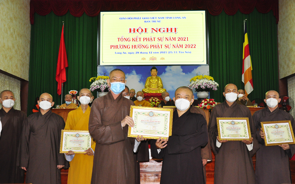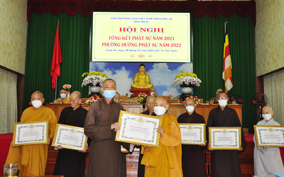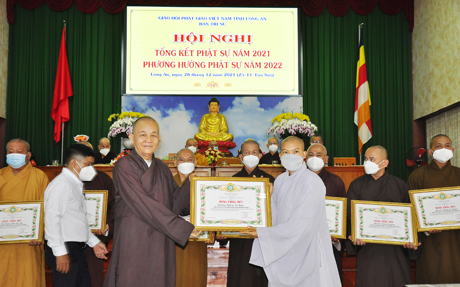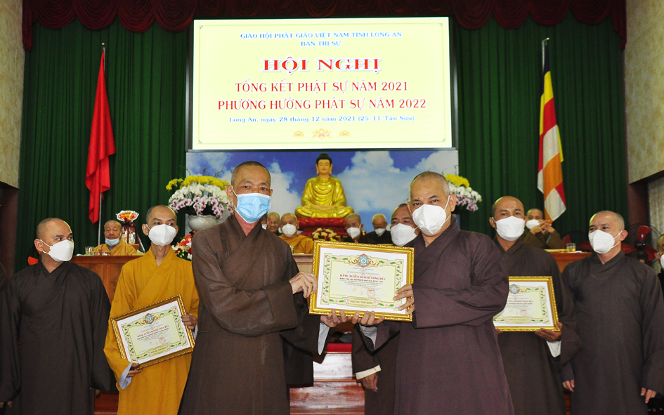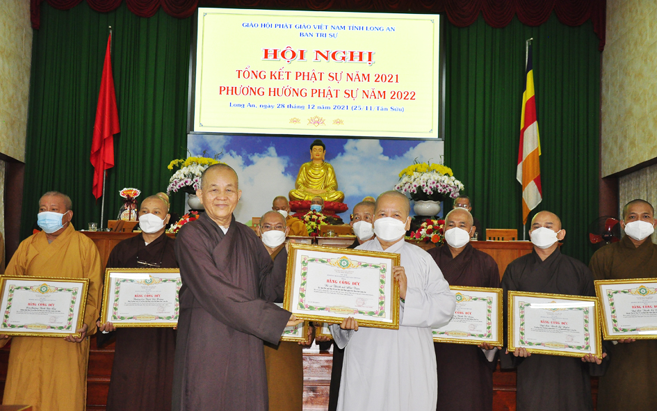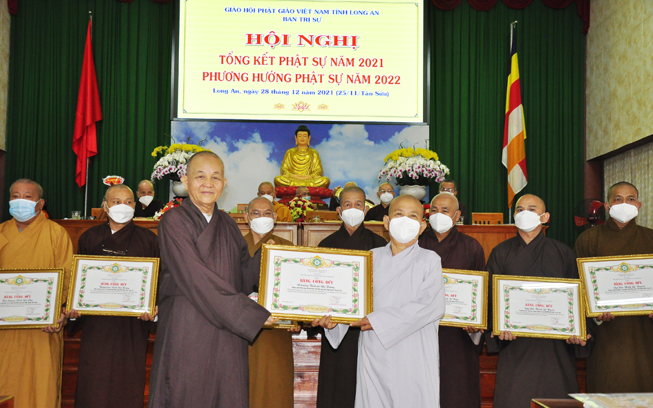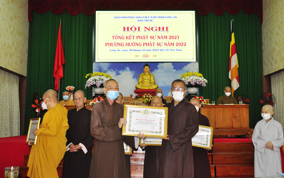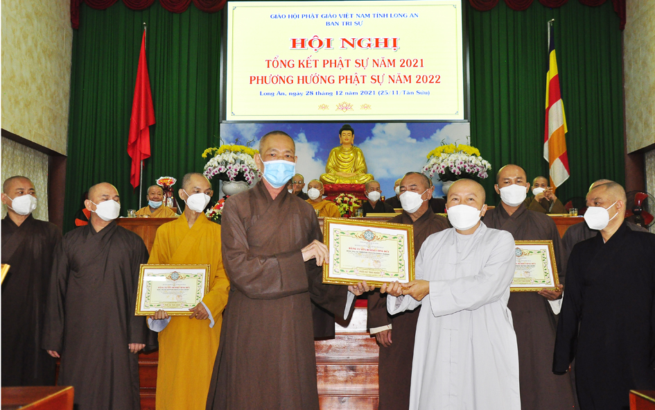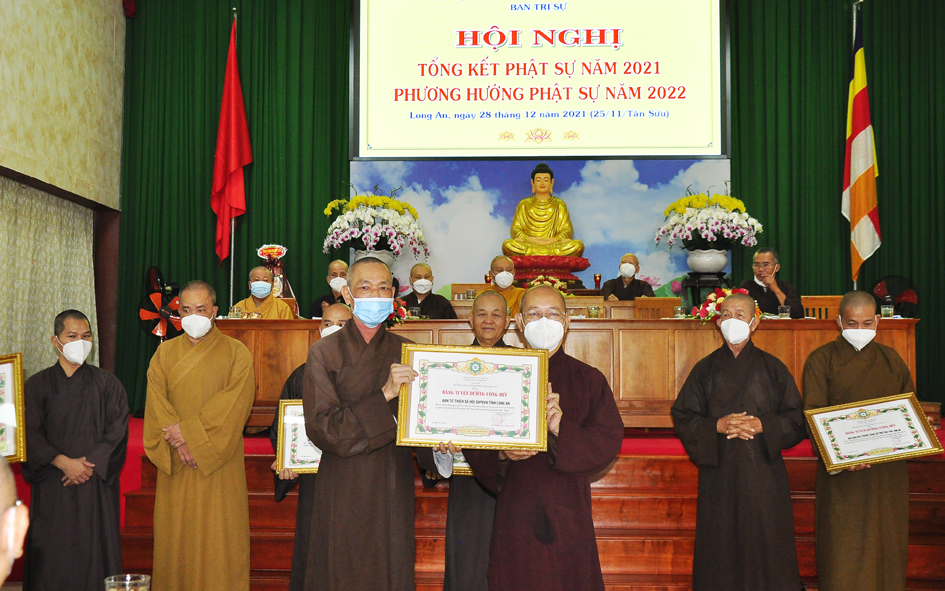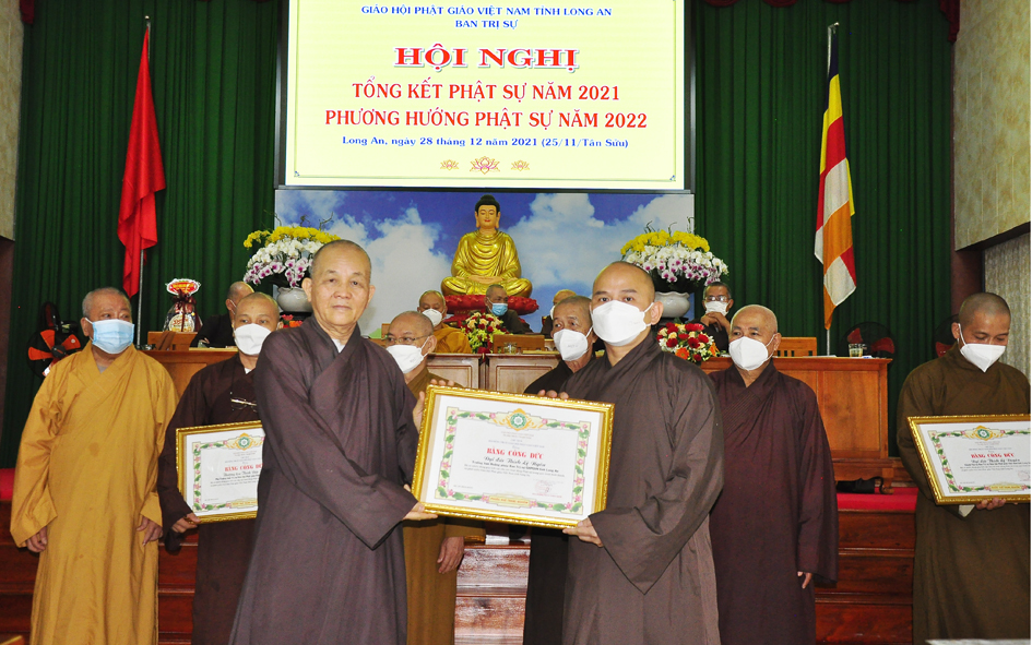 Sáng ngày 28 tháng 12 năm 2021, Ban Trị sự GHPGVN tỉnh Long An tổ chức hội nghị Tổ chức công tác Phật sự năm 2021 và triển khai phương hướng hoạt động năm 2022 tại Hội trường văn phòng Ban trị sự GHPGVN tỉnh Long An, (chùa Thiên Châu, Phường 3, Tp Tân An, tỉnh Long An).