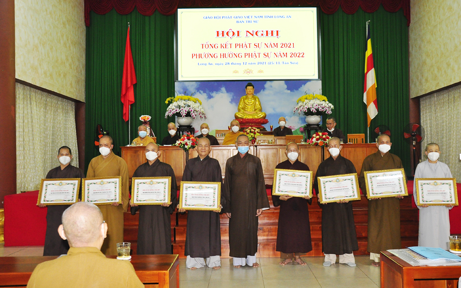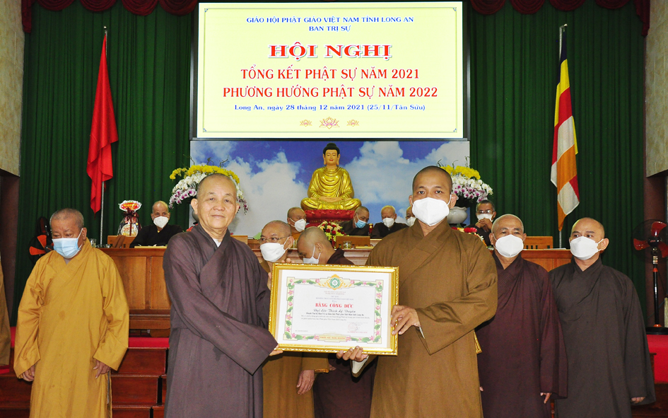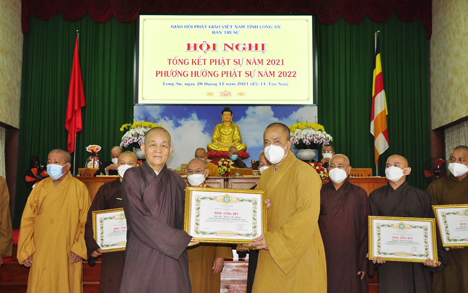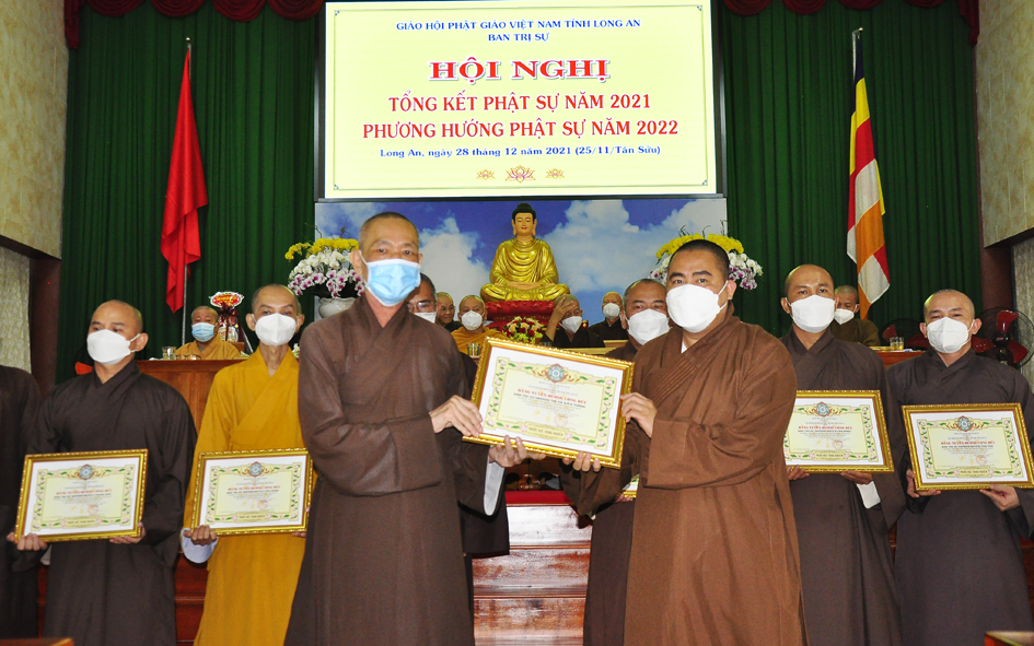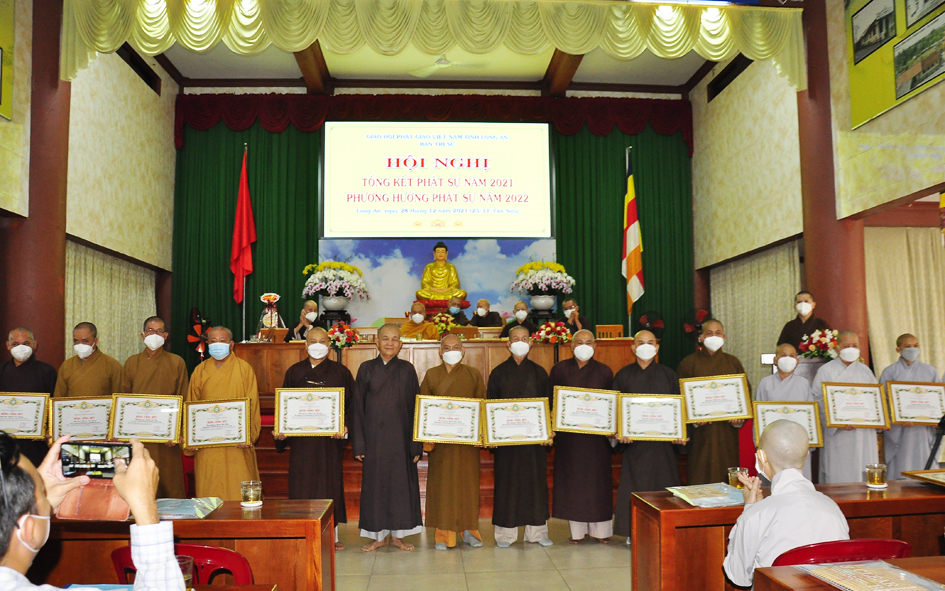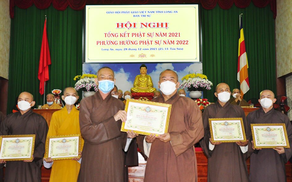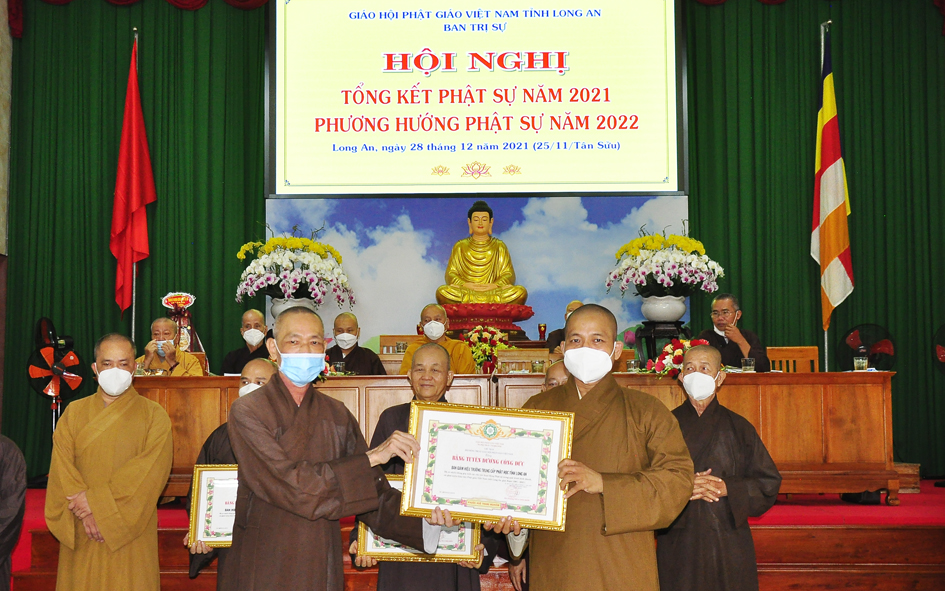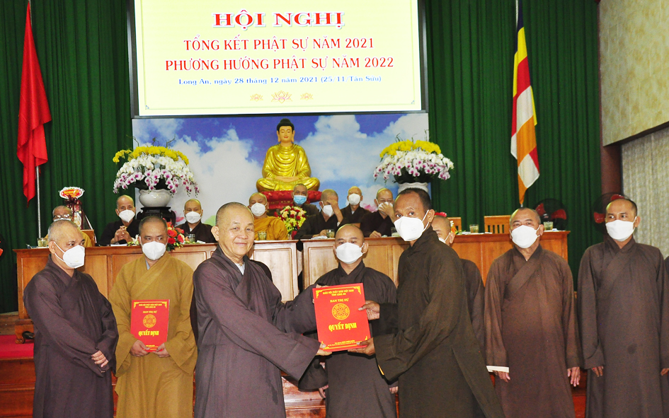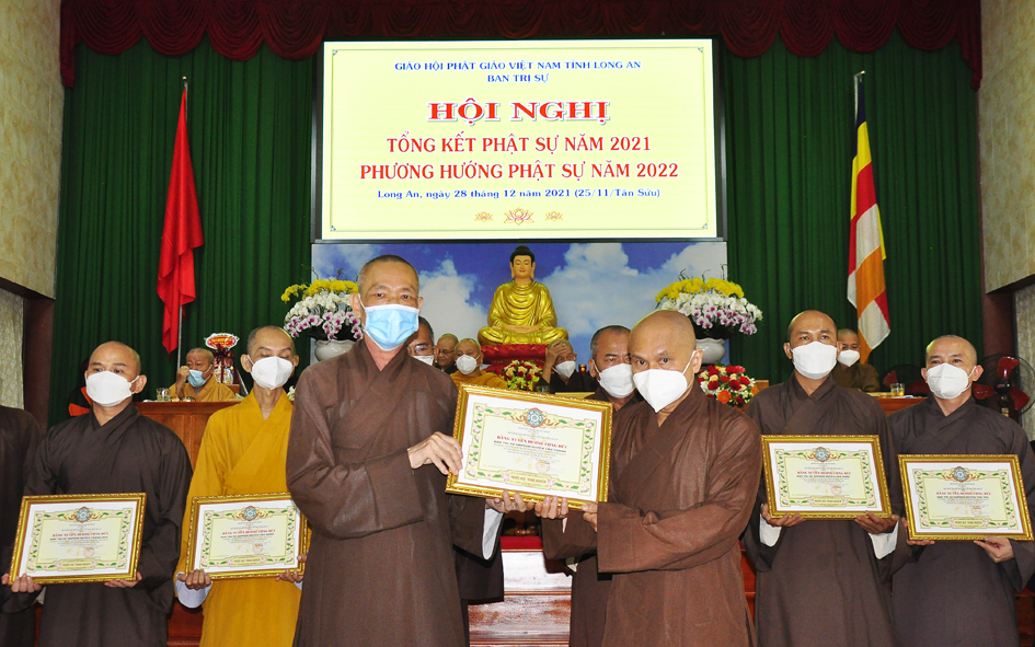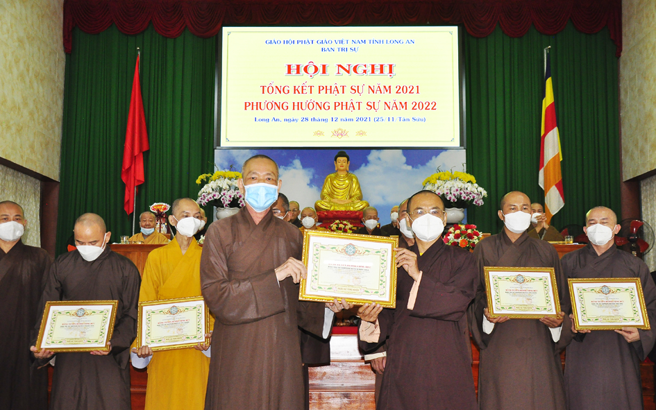 Sáng ngày 28 tháng 12 năm 2021, Ban Trị sự GHPGVN tỉnh Long An tổ chức hội nghị Tổ chức công tác Phật sự năm 2021 và triển khai phương hướng hoạt động năm 2022 tại Hội trường văn phòng Ban trị sự GHPGVN tỉnh Long An, (chùa Thiên Châu, Phường 3, Tp Tân An, tỉnh Long An).