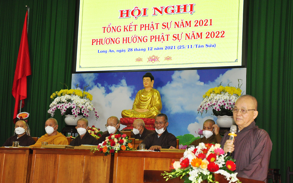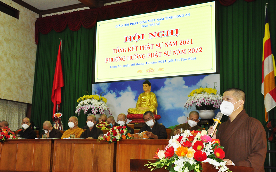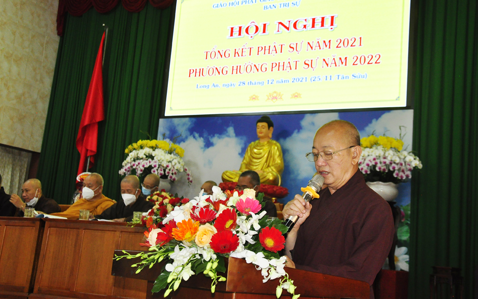 Thượng toạ Thích Quảng Tâm trình bày phương hướng hoạt động Phật sự năm 2022. Thượng tọa cho biết, trong năm 2022 những hoạt động Phật sự trọng tâm của Ban Trị sự là tổ chức Đại hội Đại biểu Phật giáo tỉnh Long An nhiệm kỳ 2022-2027 vào quý II năm 2021, tổ chức trọng thể Đại lễ Phật đản PL 2566 và 11 trú xứ ACKH, khóa bồi dưỡng trụ trì-hành chánh Giáo hội. Quan tâm duy trì và phát triển 300 đạo tràng tu học cho Phật tử hướng đến mở lớp Sơ cấp Phật học cho cư sĩ Phật tử.