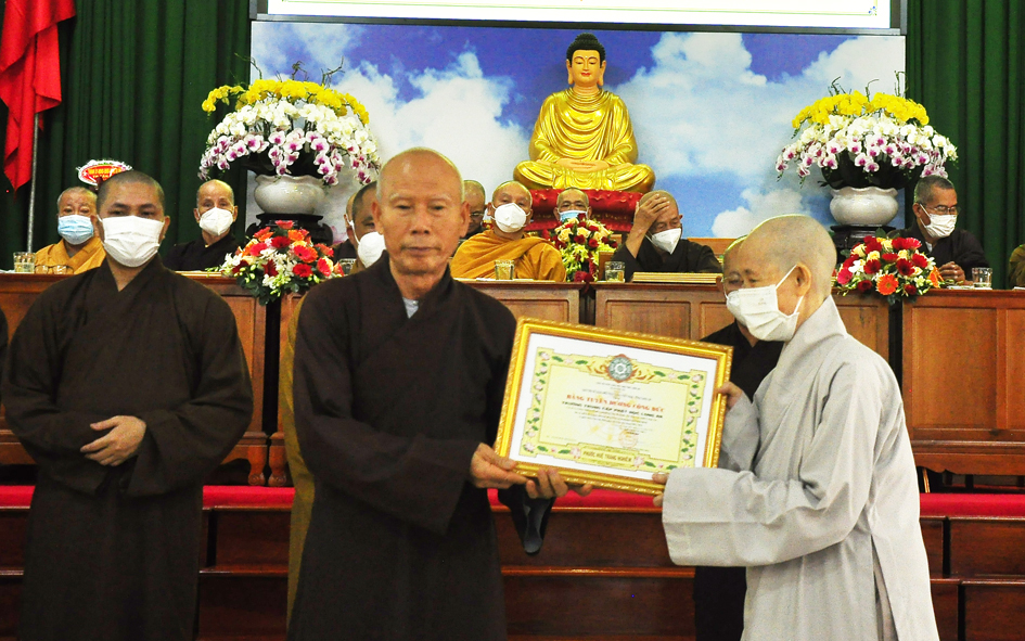 Hòa thượng Thích Thiện Huệ trao bằng Tuyên dương Công đức cho các tập thể và cá nhân đã có thành tích tốt trong hoạt động Phật sự tỉnh nhà.