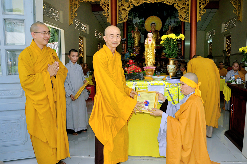 Trong giây phút thiêng liêng, HT. Thích Tắc Phi – UV HĐTS, Phó Ban Tăng Sự GHPGVN tỉnh Long An, Phó Tông trưởng Tông Thiên Thai Giáo Quán trang trọng trao bằng Quyết định Bổ nhiệm Trụ Trì cho Sư cô An Thi.