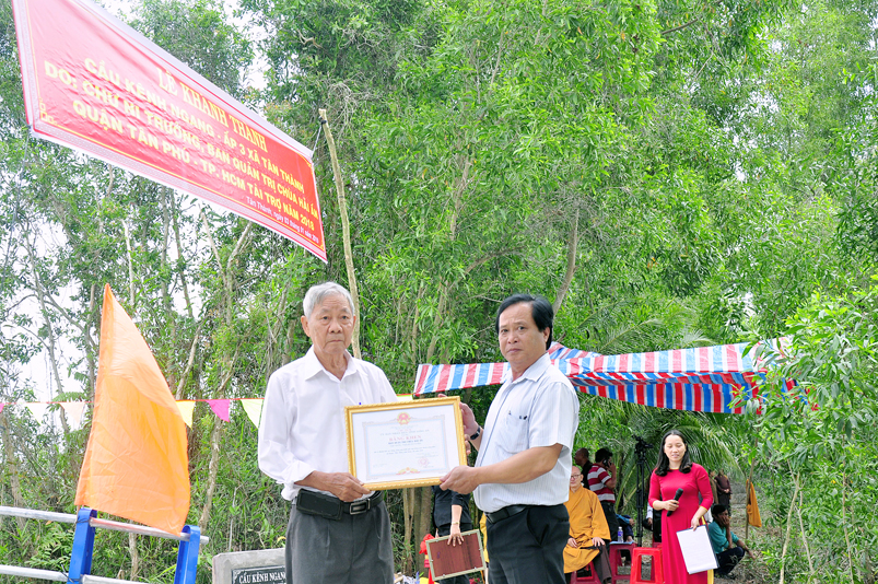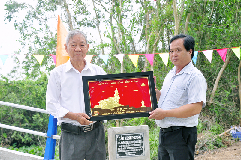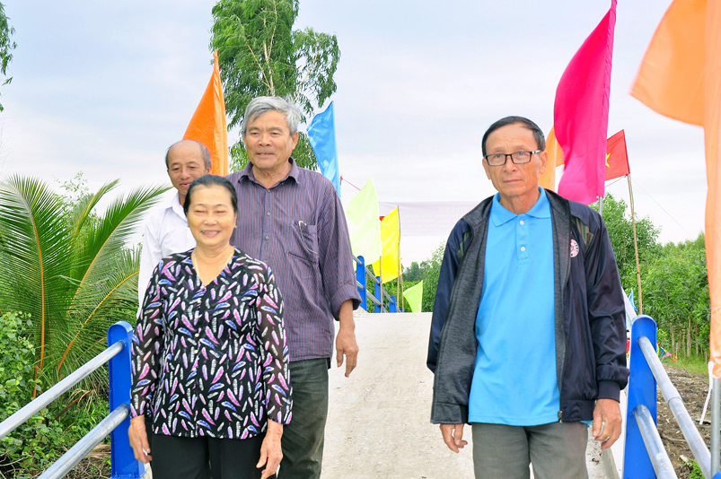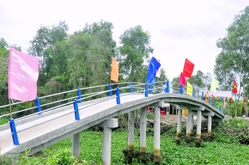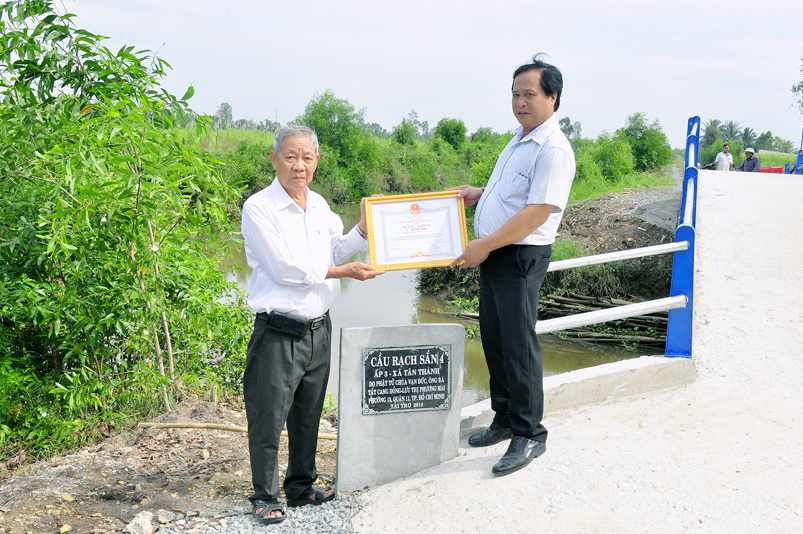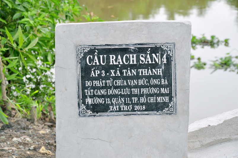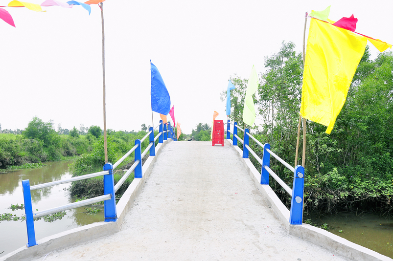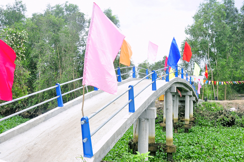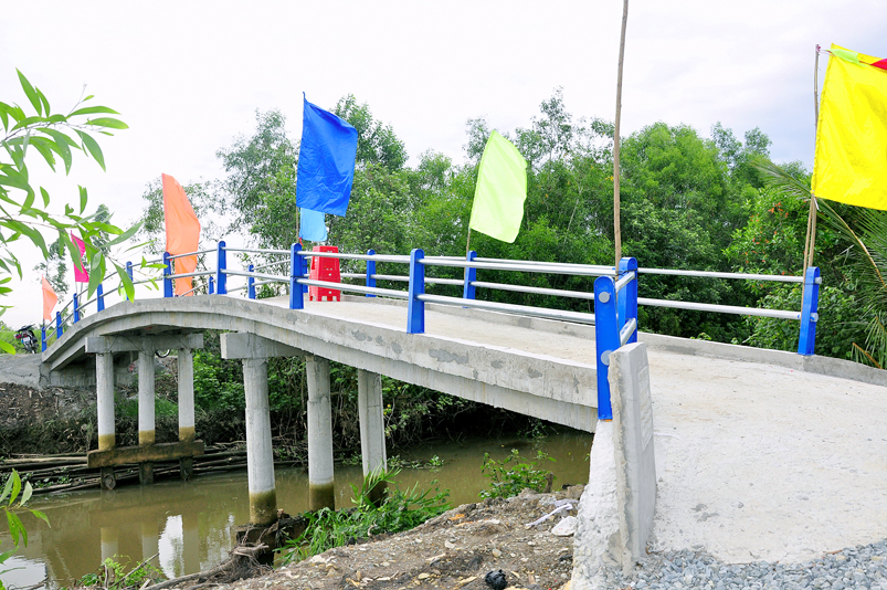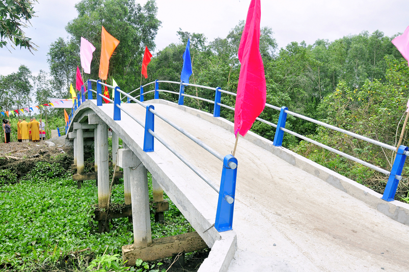 Cầu Kênh Ngang được xây mới với tổng kinh phí 175 triệu đồng do Phật tử Tâm Tín( cư ngụ Tp. HCM) vận động Chư Ni Trưởng Ban Quản Trị chùa Hải Ấn, quận Tân Phú, Tp. HCM tài trợ 140 triệu đồng, 35 triệu còn lại do ngân sách xã hỗ trợ và bà con nhân dân địa phương đóng góp. Cầu có chiều dài 28m, ngang 2,2m, qui cách bằng bê tông cốt thép, lưu thông bằng xe 2, 3 bánh; cầu Rạch sắn 4 được xây mới với tổng kinh phí 155 triệu đồng do Phật tử Tâm Tín( cư ngụ Tp. HCM) vận động ông bà Tất Cang Đồng-Lưu Thị Phương Mai phật tử Chùa Vạn Đức quận Bình Tân tp HCM tài trợ 140 triệu đồng, 15 triệu đồng do nhân dân đóng góp. Cầu có chiều dài 24m, ngang 2,2m, qui cách bằng bê tông cốt thép, lưu thông bằng xe 2, 3 bánh. Hai cầu trên xây dựng đưa vào sử dụng đảm bảo đảm độ an toàn giao thông đường bộ, thông thuyền đường thủy, tạo điều kiện thuận lợi cho bà con các ấp trong xã liên thông nhau đi lại dễ dàng hơn, góp phần xây dựng nông thôn mới ở địa phương.