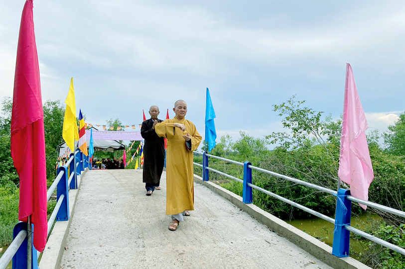 Mở đầu buổi lễ là nghi thức truyền thống Phật giáo Sái Tịnh cây cầu mới, sau khi kết thúc nghi lễ là chính thức vào phần lễ hành chánh. Đại diện chính quyền báo cáo quá trình xây dựng cây cầu. Được biết cầu Sạn 5 được thiết kế chiều dài 26m, rộng 2,7m, với kinh phí 187 triệu đồng với sự tài trợ của Đại đức Thích Đức Hậu và Phật tử chùa Long Vân, Phường Tân Tạo A, quận Bình Tân, Tp. HCM là 160 triệu đồng phần còn lại do ngân sách và nhân dân địa phương đóng góp.