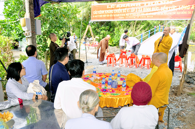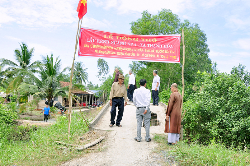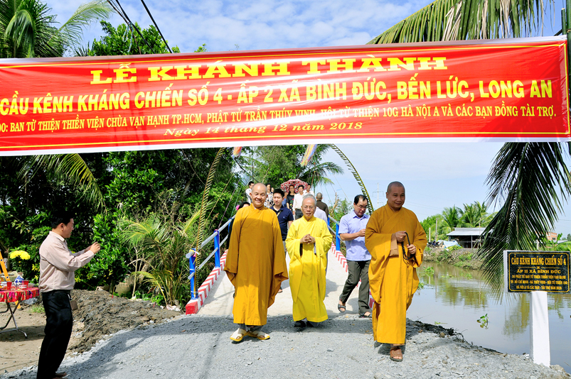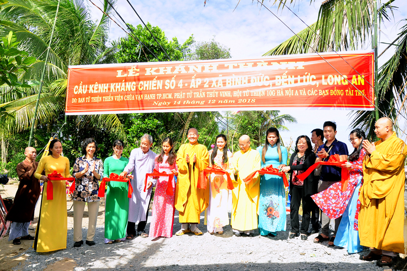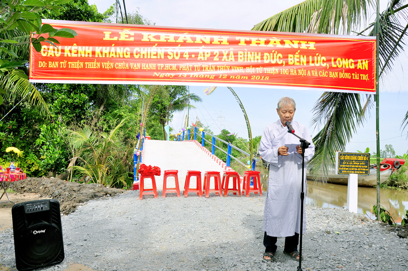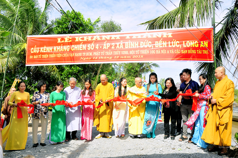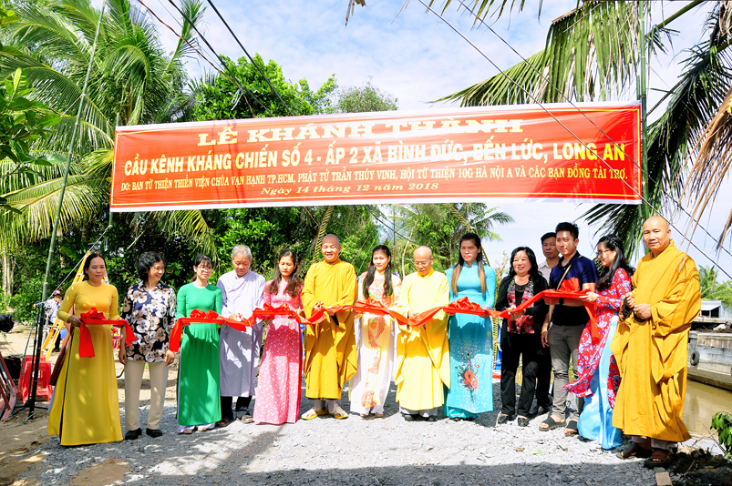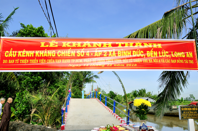 Sáng nay, ngày 14 tháng 12 năm 2018(nhằm 08/ 11/ Mậu tuất), tại ấp 2 xã Bình Đức, huyện Bến Lức, tỉnh Long An ban Từ Thiện GHPGVN tỉnh Long An và đơn vị tài trợ phối hợp UBND xã Bình Đức tổ chức khánh thành cầu giao thông nông thôn Kháng Chiến số 4, ấp 2, với tổng số tiền trên 180 triệu đồng. Đây là nguồn kinh phí do Phật tử Tâm Tín( ông Nguyễn Văn Hướng), ngụ quận Bình Tân, TP.HCM vận động Ban từ thiện Thiền Viện Vạn Hạnh quận Phú Nhuận, Tp. HCM và gia đình Phật tử Thuý Vinh, Nhóm Hà Nội 10G Hà Nội A tài trợ.