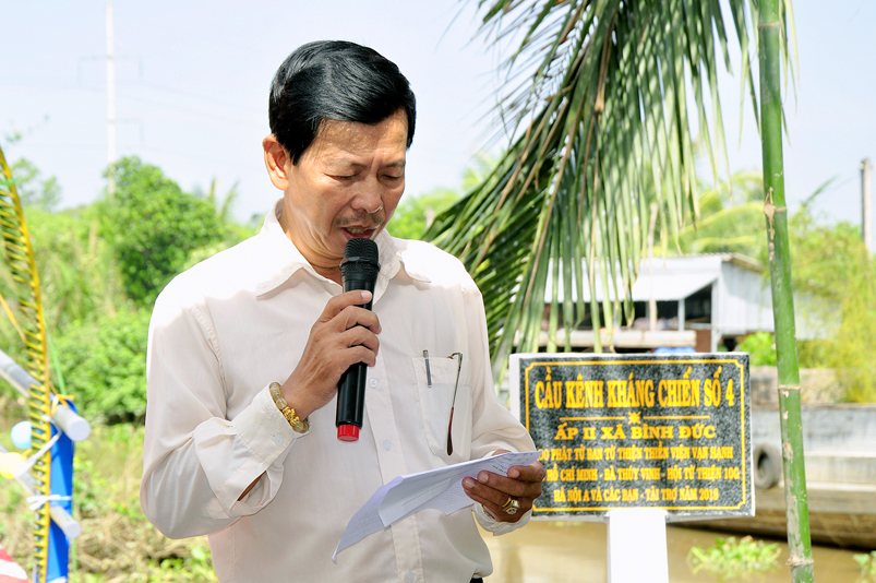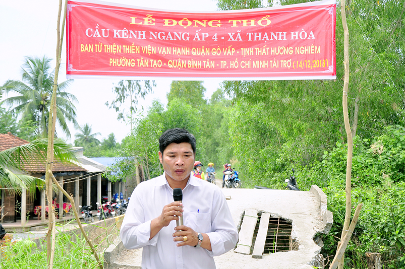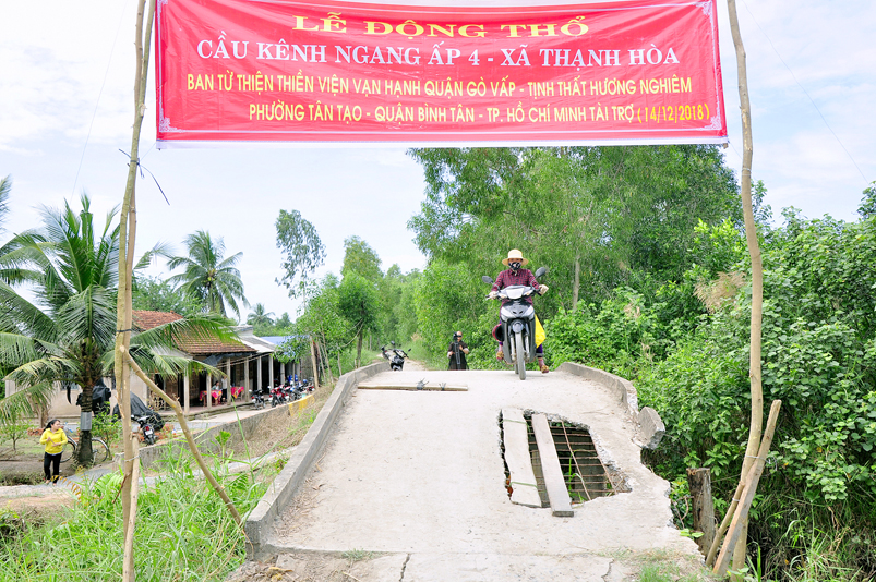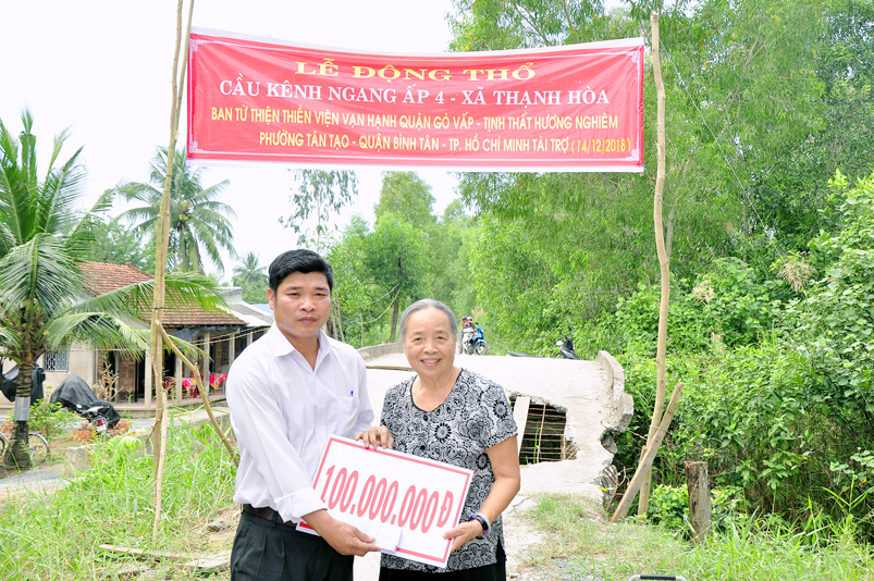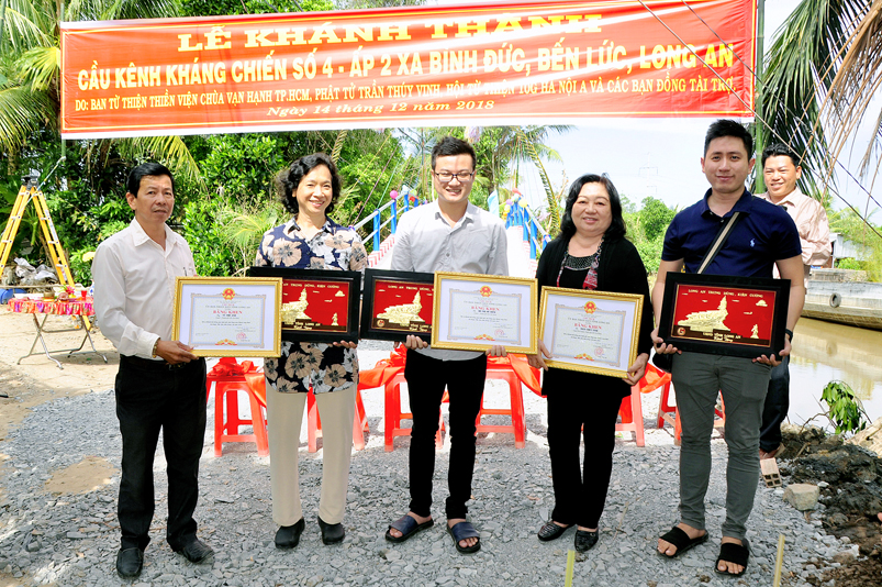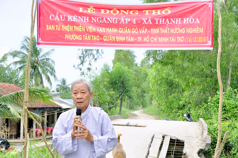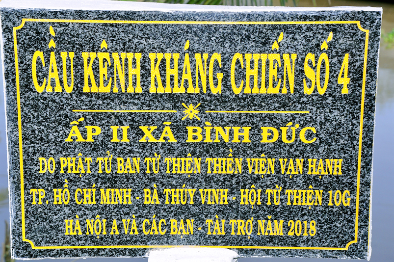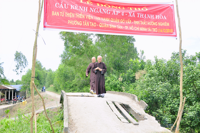 Sáng nay, ngày 14 tháng 12 năm 2018(nhằm 08/ 11/ Mậu tuất), tại ấp 2 xã Bình Đức, huyện Bến Lức, tỉnh Long An ban Từ Thiện GHPGVN tỉnh Long An và đơn vị tài trợ phối hợp UBND xã Bình Đức tổ chức khánh thành cầu giao thông nông thôn Kháng Chiến số 4, ấp 2, với tổng số tiền trên 180 triệu đồng. Đây là nguồn kinh phí do Phật tử Tâm Tín( ông Nguyễn Văn Hướng), ngụ quận Bình Tân, TP.HCM vận động Ban từ thiện Thiền Viện Vạn Hạnh quận Phú Nhuận, Tp. HCM và gia đình Phật tử Thuý Vinh, Nhóm Hà Nội 10G Hà Nội A tài trợ.