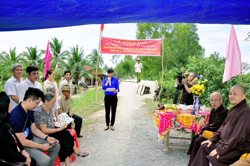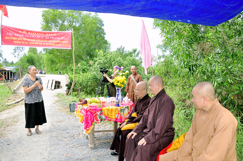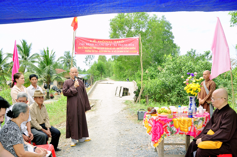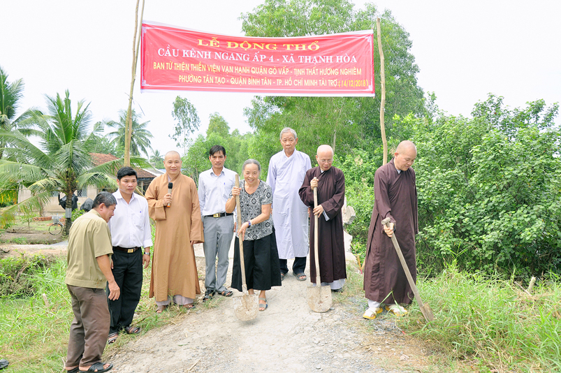 Tại xã Thạnh Hoà, huyện Bến Lức, phái đoàn tiếp tục cùng quý vị lãnh đạo UBND xã và bà con nhân dân địa phương khởi công xây dựng cầu Kênh Ngang Số 4 trị giá 120 triệu đồng, do ban Từ thiện Thiền viện Vạn Hạnh, quận Phú Nhuận, Tp. HCM, Ni sư Thích Nữ Từ Bi( trụ trì tịnh thất Hương Nghiêm, quận Bình Tân, Tp. HCM); Hội Từ thiện 10G, Hà Nội A đồng tài trợ.