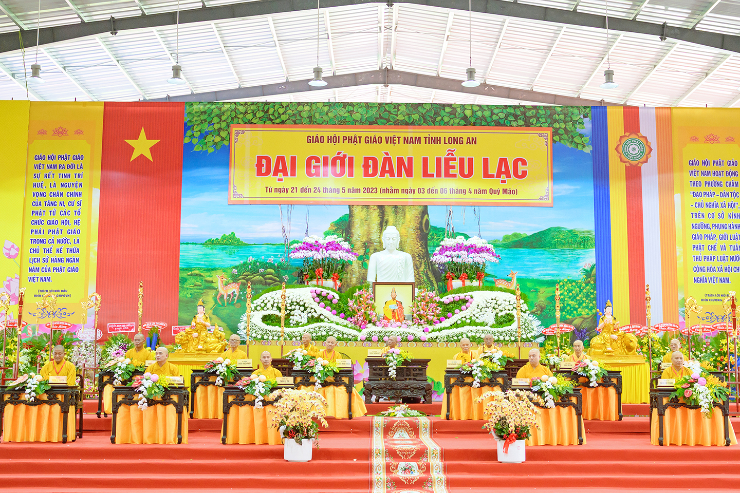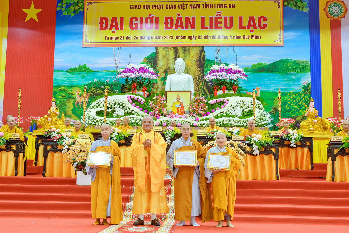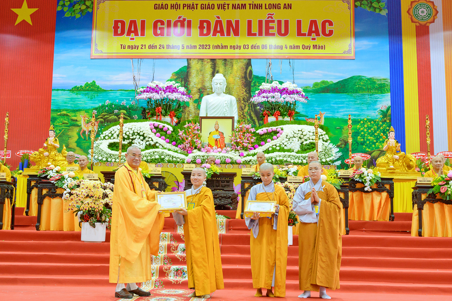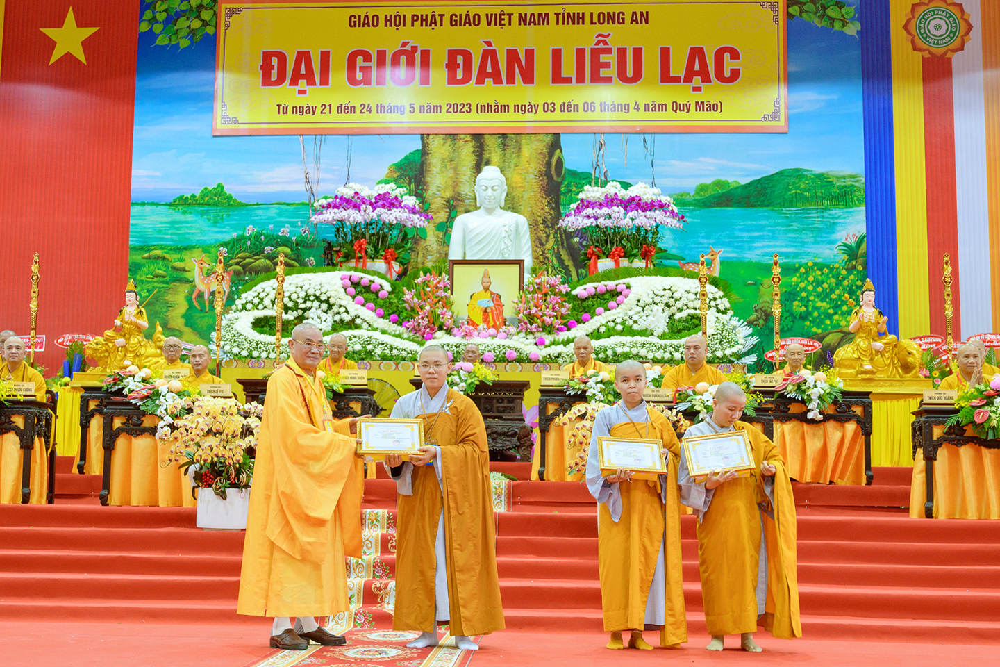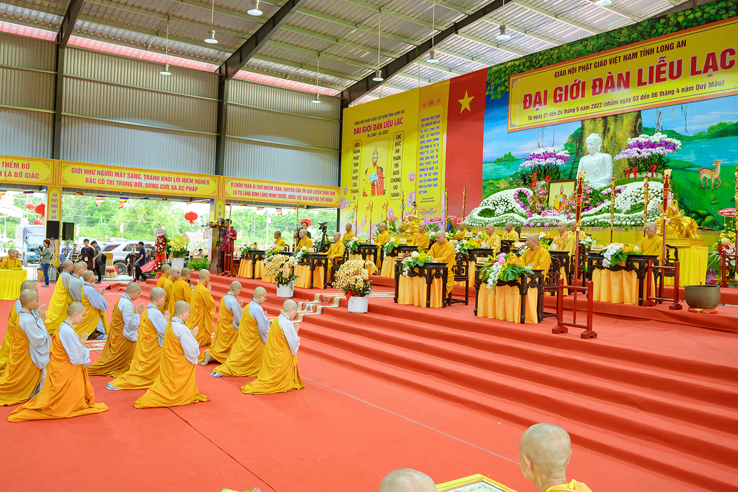 Chiều ngày 24/05/2023 nhằm ngày mùng 6/4 năm Quý Mão, theo chương trình Đại Giới đàn Liễu Lạc, Ban Tổ chức đã long trọng làm Lễ bế mạc Đại giới đàn Liễu Lạc sau 4 ngày diễn ra từ 21/05 đến 24/05/2023, nay đã được thành tựu viên mãn. Chứng minh buổi lễ với sự hiện diện, tham dự của: HT. Thích Thiện Huệ, Thành viên HĐCM, Chứng minh BTS GHPGVN tỉnh Long An; HT. Thích Lãng Huỳnh, Thành viên HĐCM, Tông trưởng Thiên Thai Giáo Quán; HT. Thích Huệ Hồng – Chứng minh BTS GHPGVN tỉnh Long An; HT. Thích Minh Thiện – UV HĐTS, Trưởng BTS GHPGVN tỉnh Long An, Trưởng ban Tổ chức Đại giới đàn; HT. Thích Phước Toàn – Chứng minh BTS GHPGVN quận Bình Tân; HT. Thích Thiện Pháp – Phó Trưởng ban Thường trực Ban Thừa kế Thiên Thai Thiền Giáo Tông, Chư tôn đức Phó BTS GHPGVN tỉnh Long An: HT. Thích Tắc Phi, TT. Thích Quảng Tâm, TT. Thích Minh Thọ, TT. Thích Lệ Trí, TT. Thích Đức Hoàng, ĐĐ. Thích Lệ Duyên, ĐĐ. Thích Lệ Ngôn, NT. TN. Gương Liên, NT. TN. Như Tâm, cùng chư tôn đức Hội đồng Thập sư, Ban Kiến đàn, Ban Trị sự tỉnh, huyện thị, thành và các Giới tử đã thọ nhận giới pháp cùng đông đảo quý Phật tử gần xa đồng tham dự. Về phía chính quyền có ông Phạm Văn Đồng, UV BTV Huyện ủy, Trưởng ban Dân vận huyện Đức Hòa; ông Nguyễn Văn Đạo, UV BTV Huyện ủy, Chủ tịch UB MTTQVN huyện; bà Trịnh Thị Ngọc Thanh – Phó Bí thư Đảng ủy, Chủ tịch HĐND xã Mỹ Hạnh Nam, cùng đại diện các cấp lãnh đạo chính quyền huyện Đức Hòa, xã Mỹ Hạnh Nam sở tại. ĐĐ. Thích An Nhựt, thay mặt Ban Kiến đàn báo cáo kết quả tổ chức Đại Giới đàn Liễu Lạc năm 2023. Đại Giới đàn diễn ra trong 4 ngày, từ ngày 21/5 đến 24/05/2023 nhằm ngày mùng 03 đến mùng 06/04 năm Quý Mão, với 349 Giới tử trúng tuyển kì thi khảo hạch. Trong đó, giới tử Tỳ kheo là 65 vị, Sa di là 105 vị, giới tử Tỳ kheo ni là 63 vị, Thức xoa ma na là 48 vị, Sa di ni là 68 vị. Đại Giới đàn lần này có 242 Giới tử xuất gia và tại gia phát tâm thọ Bồ tát giới.
