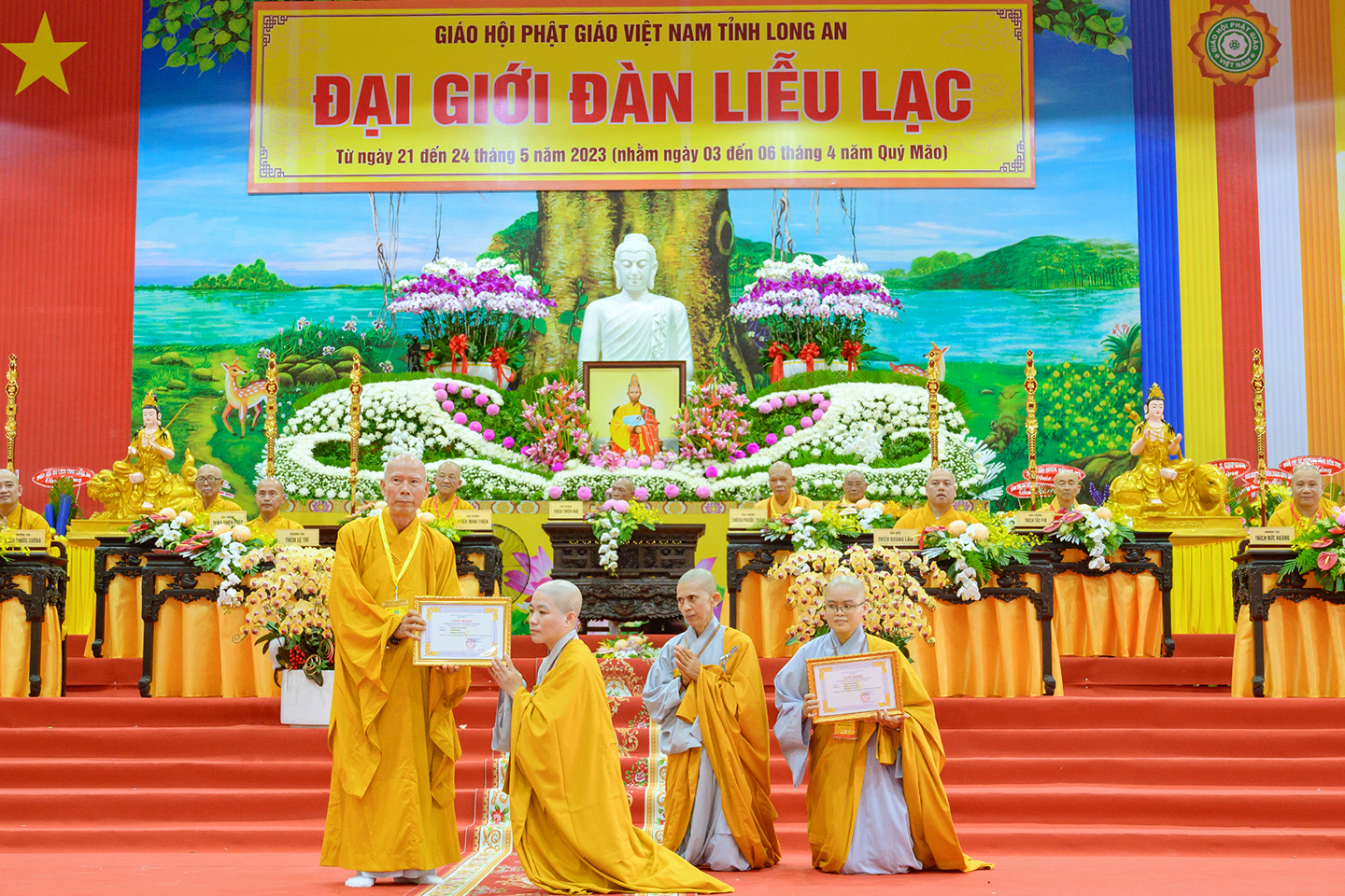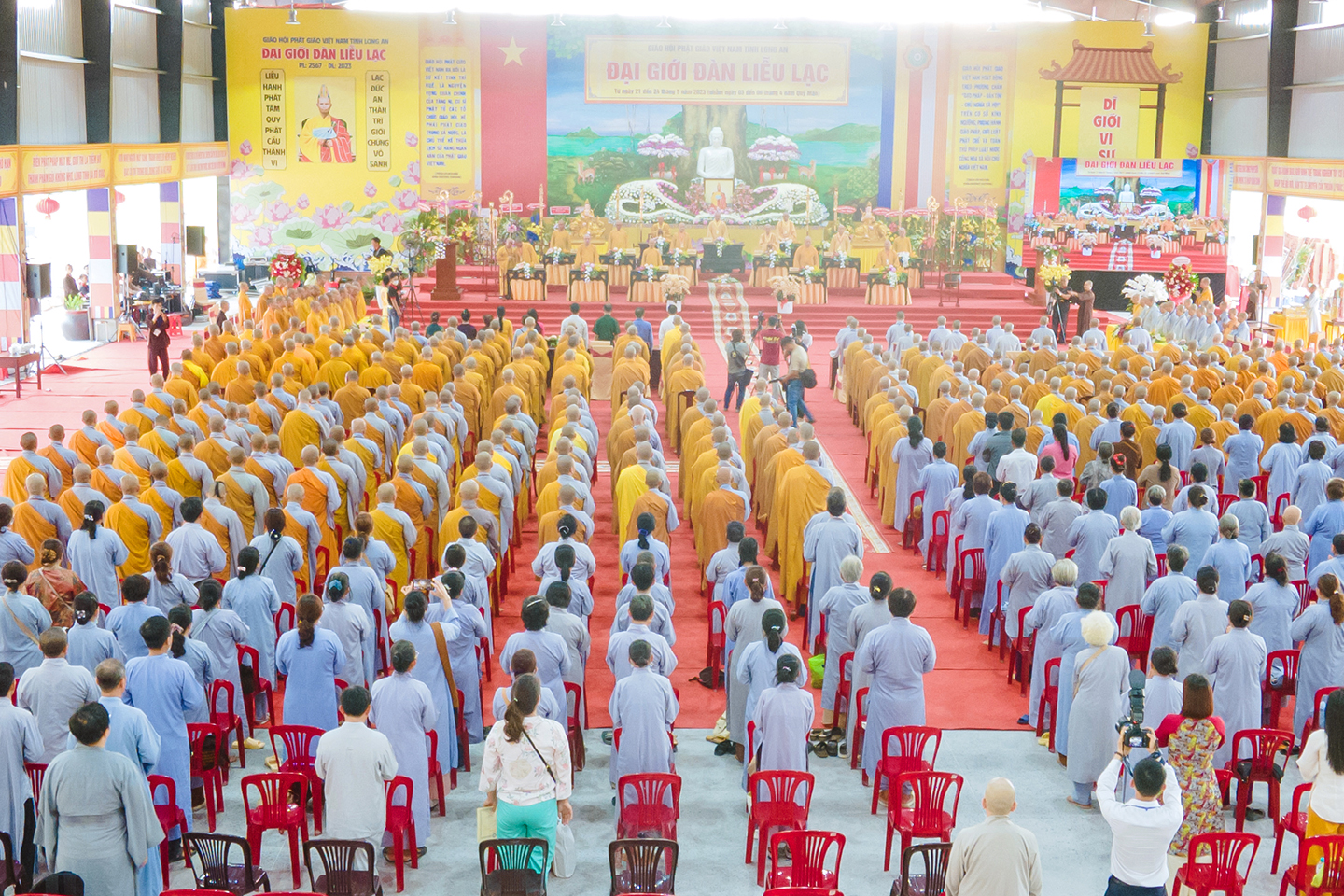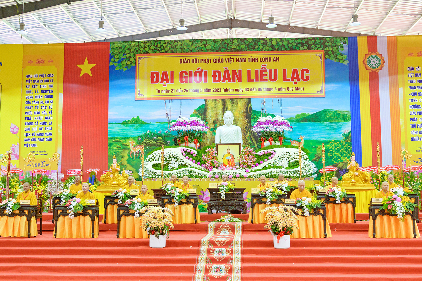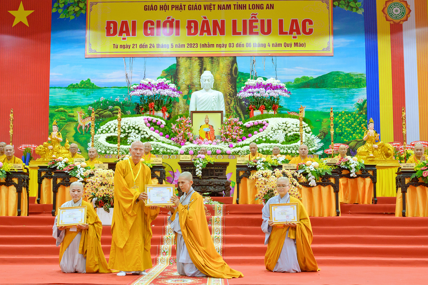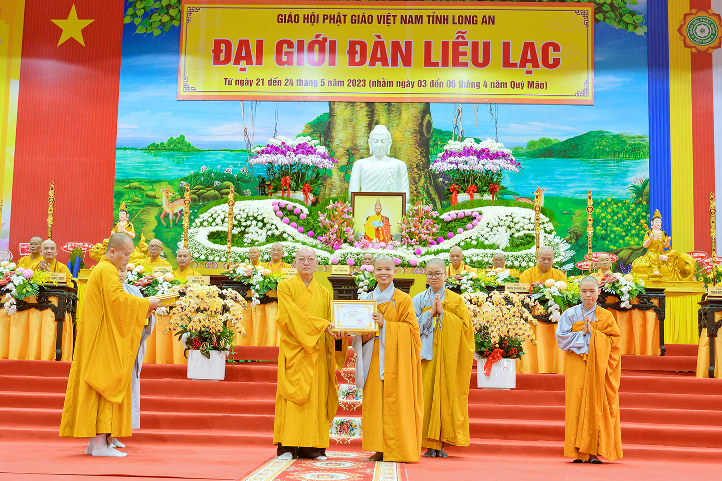 Chiều ngày 24/05/2023 nhằm ngày mùng 6/4 năm Quý Mão, theo chương trình Đại Giới đàn Liễu Lạc, Ban Tổ chức đã long trọng làm Lễ bế mạc Đại giới đàn Liễu Lạc sau 4 ngày diễn ra từ 21/05 đến 24/05/2023, nay đã được thành tựu viên mãn. Chứng minh buổi lễ với sự hiện diện, tham dự của: HT. Thích Thiện Huệ, Thành viên HĐCM, Chứng minh BTS GHPGVN tỉnh Long An; HT. Thích Lãng Huỳnh, Thành viên HĐCM, Tông trưởng Thiên Thai Giáo Quán; HT. Thích Huệ Hồng – Chứng minh BTS GHPGVN tỉnh Long An; HT. Thích Minh Thiện – UV HĐTS, Trưởng BTS GHPGVN tỉnh Long An, Trưởng ban Tổ chức Đại giới đàn; HT. Thích Phước Toàn – Chứng minh BTS GHPGVN quận Bình Tân; HT. Thích Thiện Pháp – Phó Trưởng ban Thường trực Ban Thừa kế Thiên Thai Thiền Giáo Tông, Chư tôn đức Phó BTS GHPGVN tỉnh Long An: HT. Thích Tắc Phi, TT. Thích Quảng Tâm, TT. Thích Minh Thọ, TT. Thích Lệ Trí, TT. Thích Đức Hoàng, ĐĐ. Thích Lệ Duyên, ĐĐ. Thích Lệ Ngôn, NT. TN. Gương Liên, NT. TN. Như Tâm, cùng chư tôn đức Hội đồng Thập sư, Ban Kiến đàn, Ban Trị sự tỉnh, huyện thị, thành và các Giới tử đã thọ nhận giới pháp cùng đông đảo quý Phật tử gần xa đồng tham dự. Về phía chính quyền có ông Phạm Văn Đồng, UV BTV Huyện ủy, Trưởng ban Dân vận huyện Đức Hòa; ông Nguyễn Văn Đạo, UV BTV Huyện ủy, Chủ tịch UB MTTQVN huyện; bà Trịnh Thị Ngọc Thanh – Phó Bí thư Đảng ủy, Chủ tịch HĐND xã Mỹ Hạnh Nam, cùng đại diện các cấp lãnh đạo chính quyền huyện Đức Hòa, xã Mỹ Hạnh Nam sở tại. ĐĐ. Thích An Nhựt, thay mặt Ban Kiến đàn báo cáo kết quả tổ chức Đại Giới đàn Liễu Lạc năm 2023. Đại Giới đàn diễn ra trong 4 ngày, từ ngày 21/5 đến 24/05/2023 nhằm ngày mùng 03 đến mùng 06/04 năm Quý Mão, với 349 Giới tử trúng tuyển kì thi khảo hạch. Trong đó, giới tử Tỳ kheo là 65 vị, Sa di là 105 vị, giới tử Tỳ kheo ni là 63 vị, Thức xoa ma na là 48 vị, Sa di ni là 68 vị. Đại Giới đàn lần này có 242 Giới tử xuất gia và tại gia phát tâm thọ Bồ tát giới.