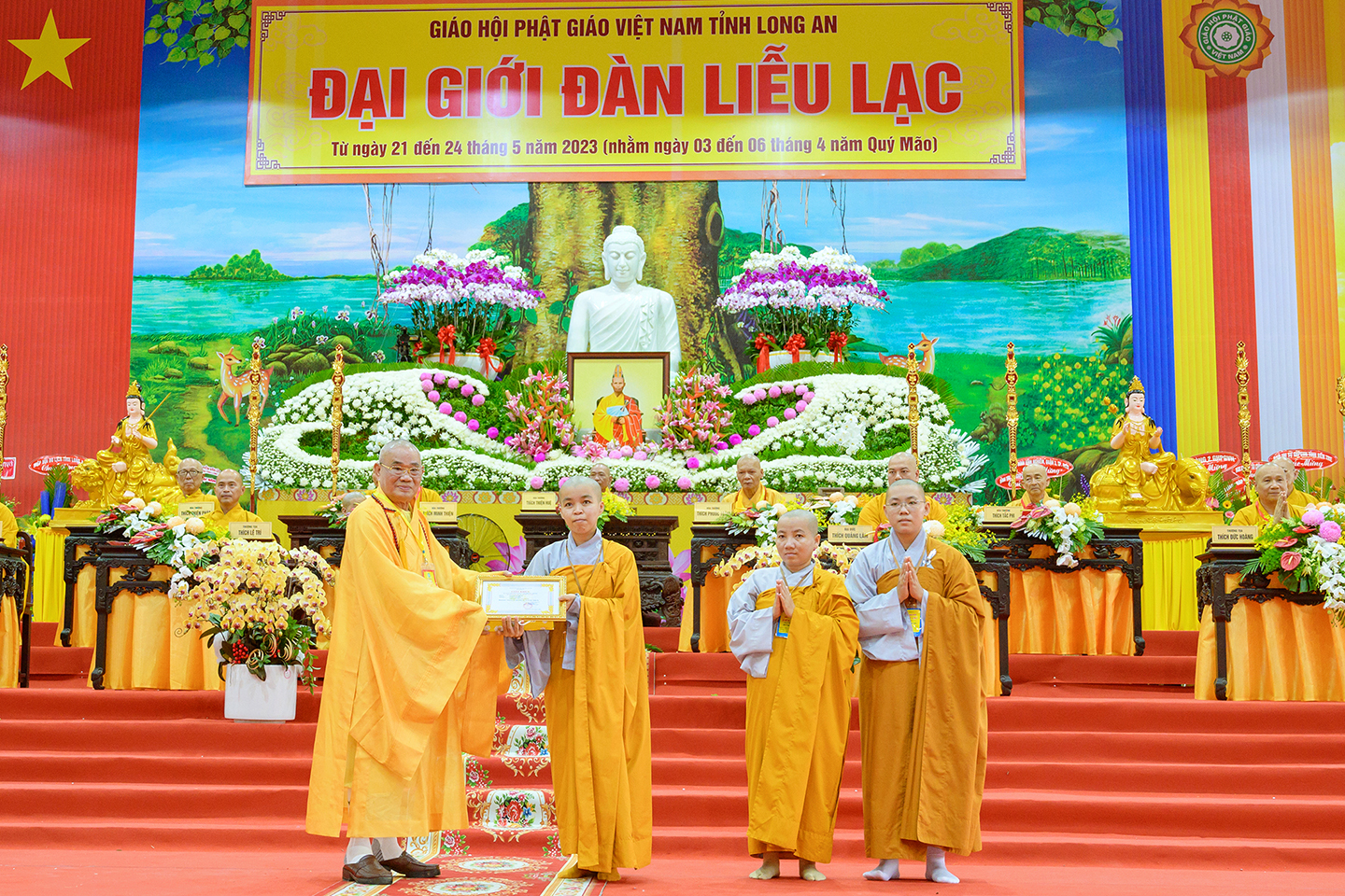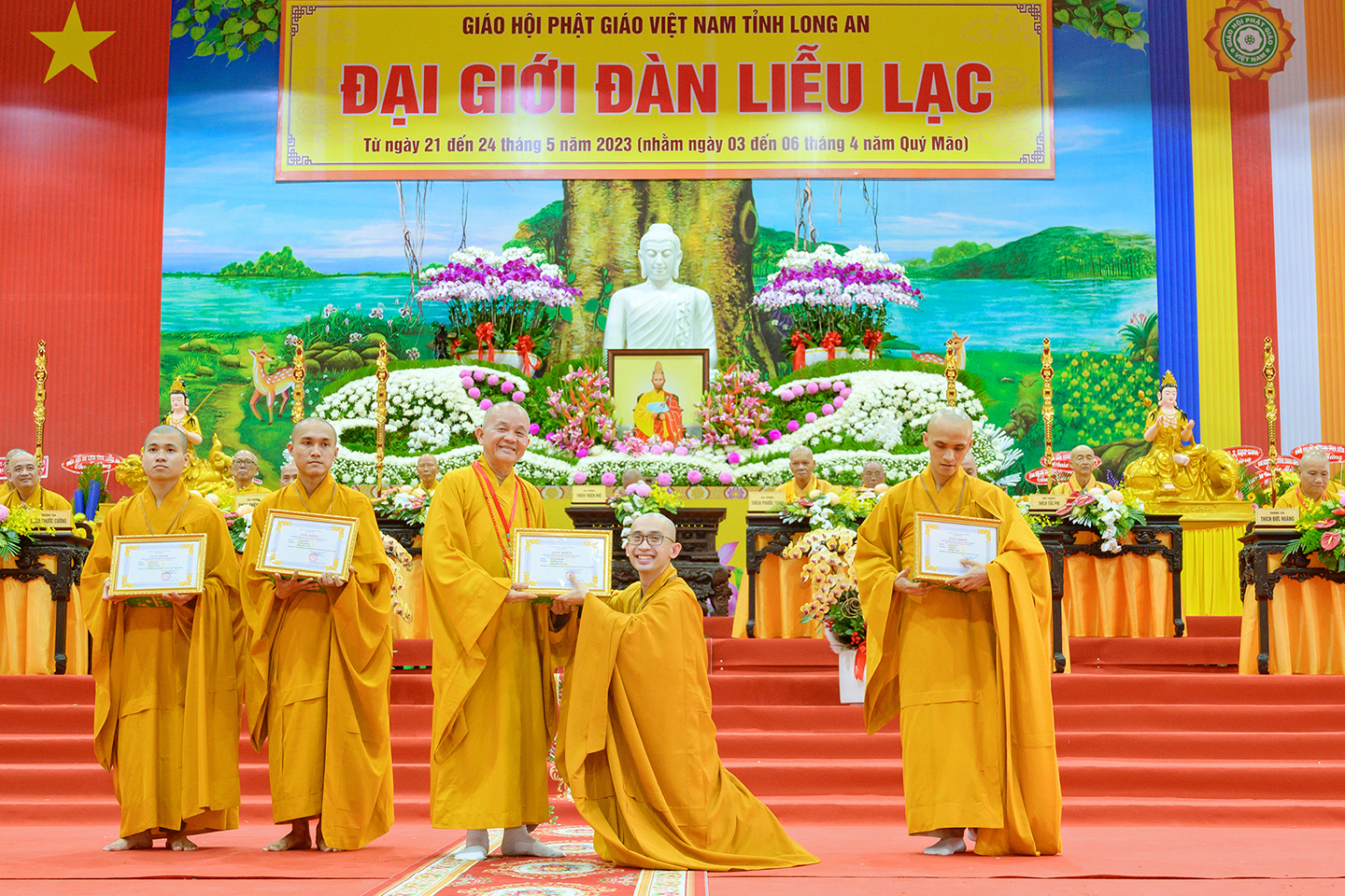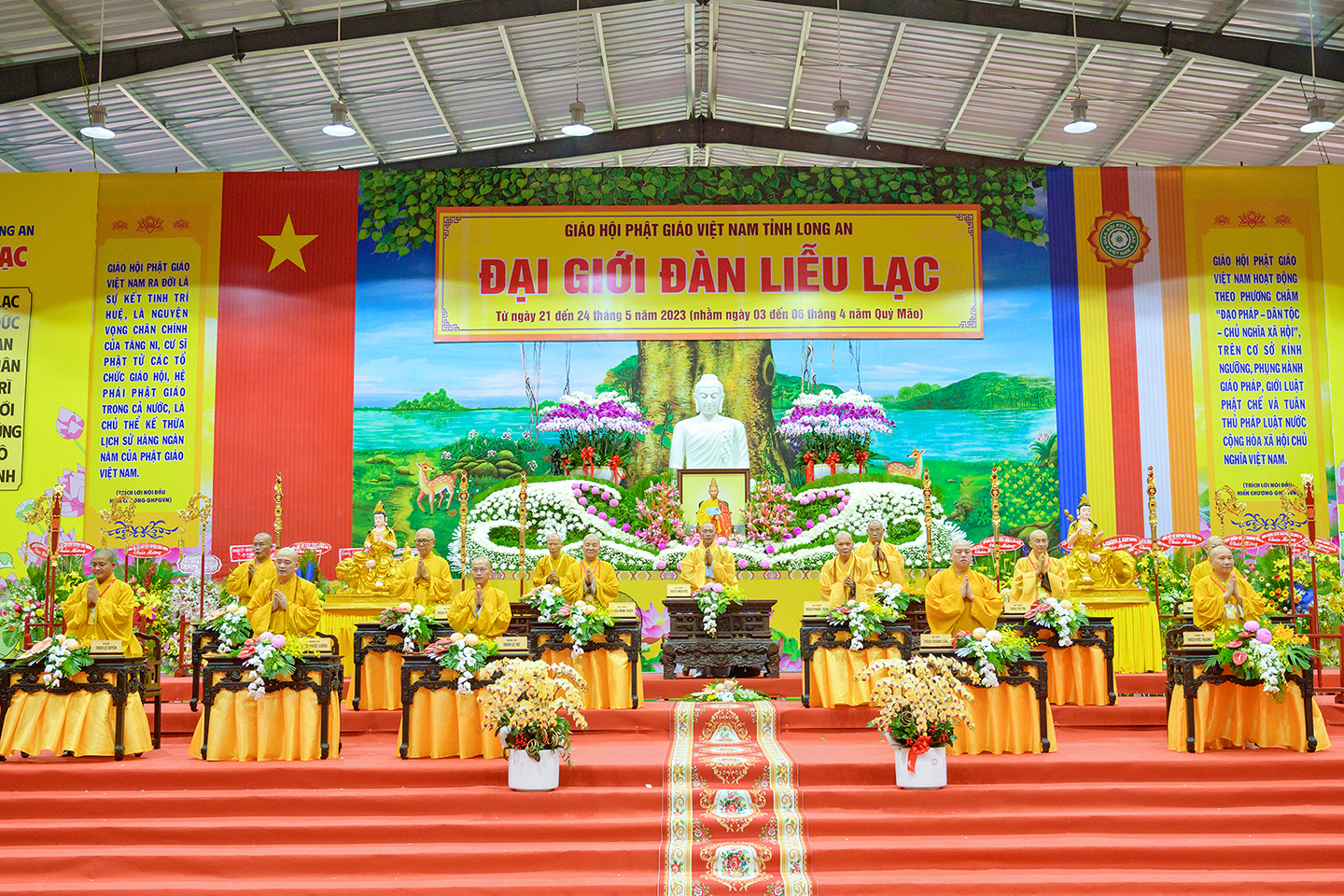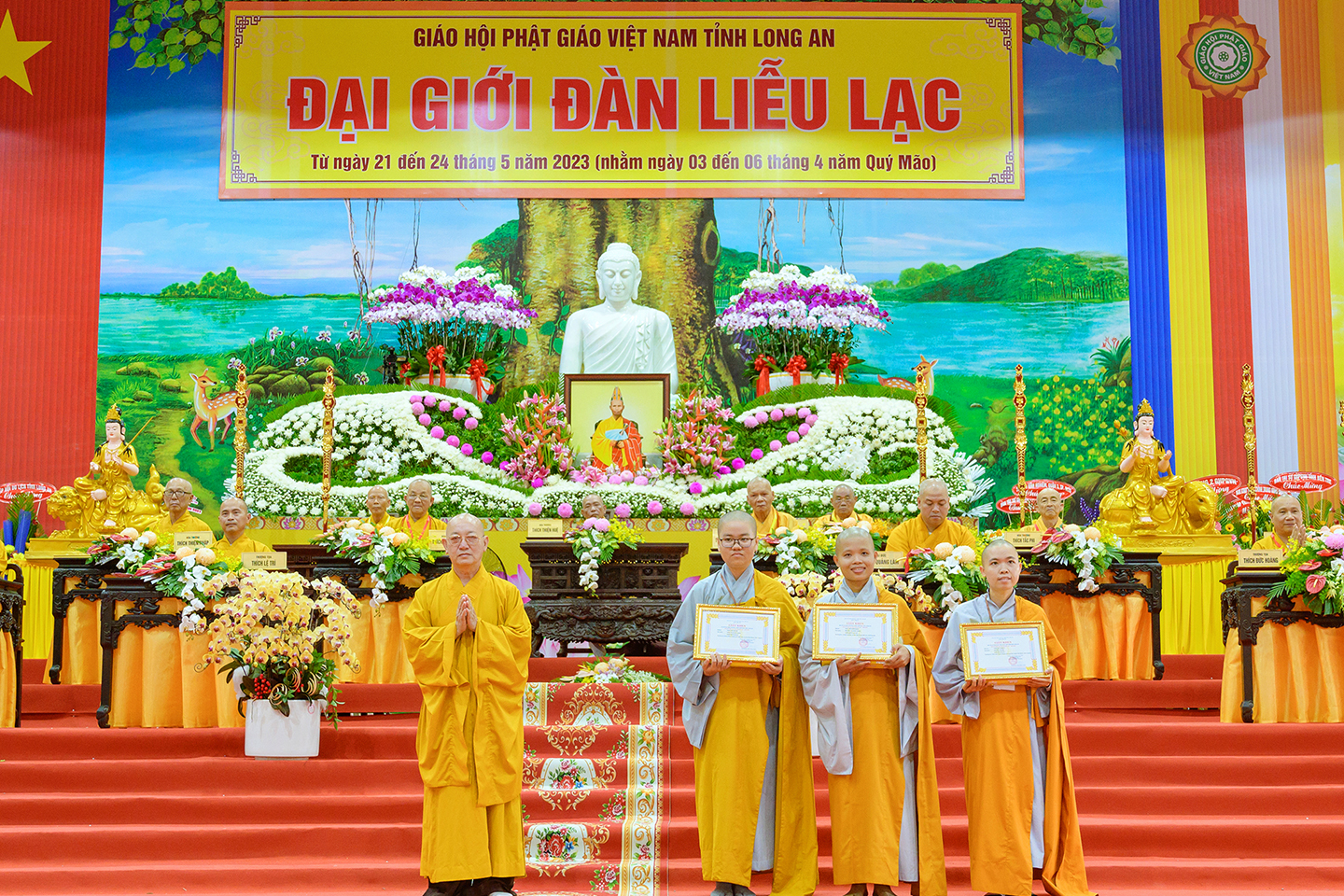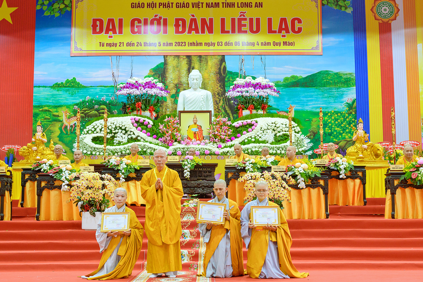 Chiều ngày 24/05/2023 nhằm ngày mùng 6/4 năm Quý Mão, theo chương trình Đại Giới đàn Liễu Lạc, Ban Tổ chức đã long trọng làm Lễ bế mạc Đại giới đàn Liễu Lạc sau 4 ngày diễn ra từ 21/05 đến 24/05/2023, nay đã được thành tựu viên mãn. Chứng minh buổi lễ với sự hiện diện, tham dự của: HT. Thích Thiện Huệ, Thành viên HĐCM, Chứng minh BTS GHPGVN tỉnh Long An; HT. Thích Lãng Huỳnh, Thành viên HĐCM, Tông trưởng Thiên Thai Giáo Quán; HT. Thích Huệ Hồng – Chứng minh BTS GHPGVN tỉnh Long An; HT. Thích Minh Thiện – UV HĐTS, Trưởng BTS GHPGVN tỉnh Long An, Trưởng ban Tổ chức Đại giới đàn; HT. Thích Phước Toàn – Chứng minh BTS GHPGVN quận Bình Tân; HT. Thích Thiện Pháp – Phó Trưởng ban Thường trực Ban Thừa kế Thiên Thai Thiền Giáo Tông, Chư tôn đức Phó BTS GHPGVN tỉnh Long An: HT. Thích Tắc Phi, TT. Thích Quảng Tâm, TT. Thích Minh Thọ, TT. Thích Lệ Trí, TT. Thích Đức Hoàng, ĐĐ. Thích Lệ Duyên, ĐĐ. Thích Lệ Ngôn, NT. TN. Gương Liên, NT. TN. Như Tâm, cùng chư tôn đức Hội đồng Thập sư, Ban Kiến đàn, Ban Trị sự tỉnh, huyện thị, thành và các Giới tử đã thọ nhận giới pháp cùng đông đảo quý Phật tử gần xa đồng tham dự. Về phía chính quyền có ông Phạm Văn Đồng, UV BTV Huyện ủy, Trưởng ban Dân vận huyện Đức Hòa; ông Nguyễn Văn Đạo, UV BTV Huyện ủy, Chủ tịch UB MTTQVN huyện; bà Trịnh Thị Ngọc Thanh – Phó Bí thư Đảng ủy, Chủ tịch HĐND xã Mỹ Hạnh Nam, cùng đại diện các cấp lãnh đạo chính quyền huyện Đức Hòa, xã Mỹ Hạnh Nam sở tại. ĐĐ. Thích An Nhựt, thay mặt Ban Kiến đàn báo cáo kết quả tổ chức Đại Giới đàn Liễu Lạc năm 2023. Đại Giới đàn diễn ra trong 4 ngày, từ ngày 21/5 đến 24/05/2023 nhằm ngày mùng 03 đến mùng 06/04 năm Quý Mão, với 349 Giới tử trúng tuyển kì thi khảo hạch. Trong đó, giới tử Tỳ kheo là 65 vị, Sa di là 105 vị, giới tử Tỳ kheo ni là 63 vị, Thức xoa ma na là 48 vị, Sa di ni là 68 vị. Đại Giới đàn lần này có 242 Giới tử xuất gia và tại gia phát tâm thọ Bồ tát giới.