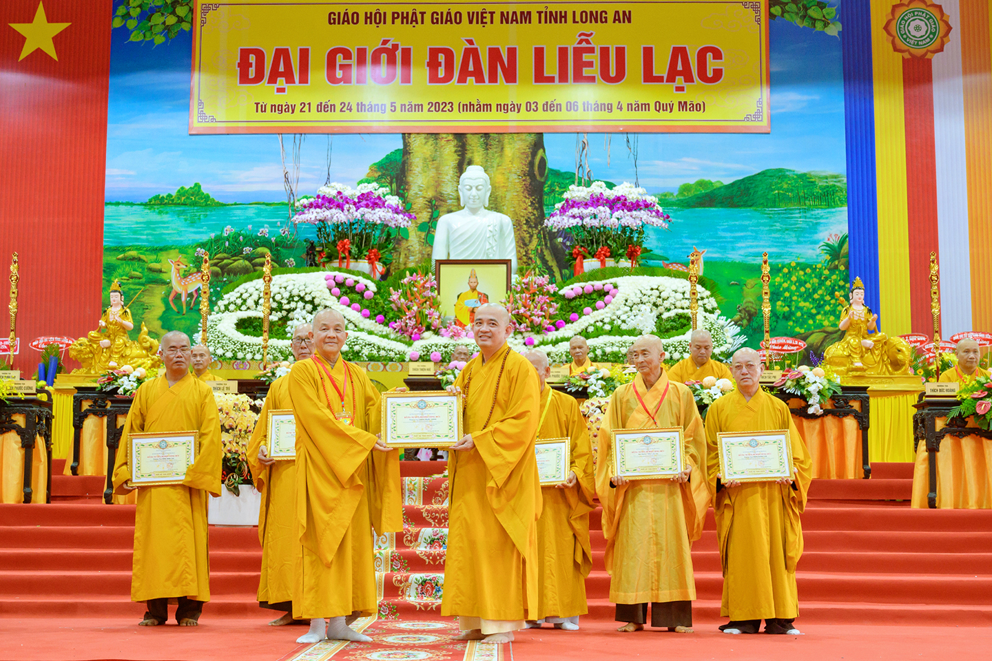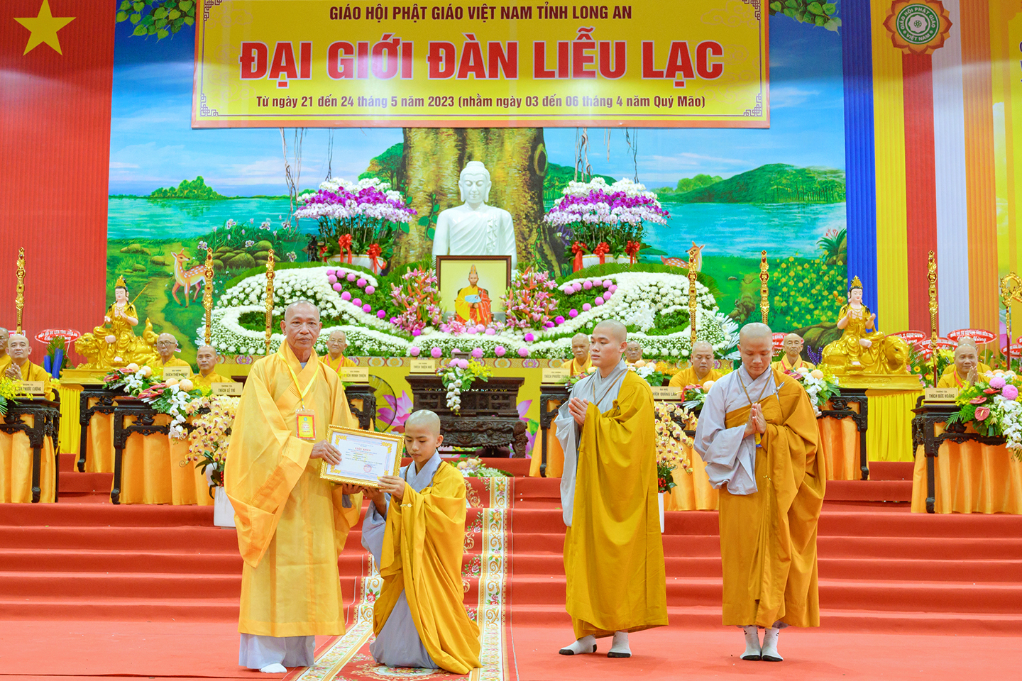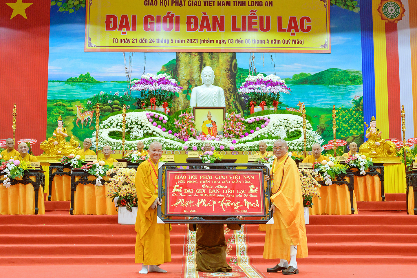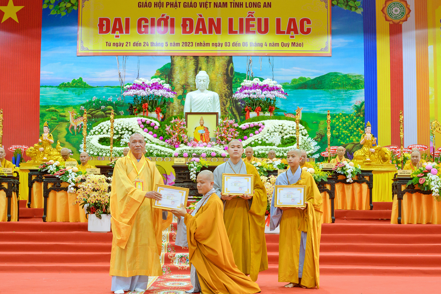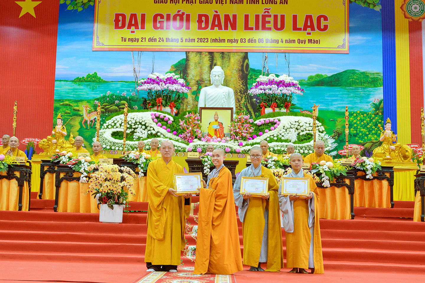 Chiều ngày 24/05/2023 nhằm ngày mùng 6/4 năm Quý Mão, theo chương trình Đại Giới đàn Liễu Lạc, Ban Tổ chức đã long trọng làm Lễ bế mạc Đại giới đàn Liễu Lạc sau 4 ngày diễn ra từ 21/05 đến 24/05/2023, nay đã được thành tựu viên mãn. Chứng minh buổi lễ với sự hiện diện, tham dự của: HT. Thích Thiện Huệ, Thành viên HĐCM, Chứng minh BTS GHPGVN tỉnh Long An; HT. Thích Lãng Huỳnh, Thành viên HĐCM, Tông trưởng Thiên Thai Giáo Quán; HT. Thích Huệ Hồng – Chứng minh BTS GHPGVN tỉnh Long An; HT. Thích Minh Thiện – UV HĐTS, Trưởng BTS GHPGVN tỉnh Long An, Trưởng ban Tổ chức Đại giới đàn; HT. Thích Phước Toàn – Chứng minh BTS GHPGVN quận Bình Tân; HT. Thích Thiện Pháp – Phó Trưởng ban Thường trực Ban Thừa kế Thiên Thai Thiền Giáo Tông, Chư tôn đức Phó BTS GHPGVN tỉnh Long An: HT. Thích Tắc Phi, TT. Thích Quảng Tâm, TT. Thích Minh Thọ, TT. Thích Lệ Trí, TT. Thích Đức Hoàng, ĐĐ. Thích Lệ Duyên, ĐĐ. Thích Lệ Ngôn, NT. TN. Gương Liên, NT. TN. Như Tâm, cùng chư tôn đức Hội đồng Thập sư, Ban Kiến đàn, Ban Trị sự tỉnh, huyện thị, thành và các Giới tử đã thọ nhận giới pháp cùng đông đảo quý Phật tử gần xa đồng tham dự. Về phía chính quyền có ông Phạm Văn Đồng, UV BTV Huyện ủy, Trưởng ban Dân vận huyện Đức Hòa; ông Nguyễn Văn Đạo, UV BTV Huyện ủy, Chủ tịch UB MTTQVN huyện; bà Trịnh Thị Ngọc Thanh – Phó Bí thư Đảng ủy, Chủ tịch HĐND xã Mỹ Hạnh Nam, cùng đại diện các cấp lãnh đạo chính quyền huyện Đức Hòa, xã Mỹ Hạnh Nam sở tại. ĐĐ. Thích An Nhựt, thay mặt Ban Kiến đàn báo cáo kết quả tổ chức Đại Giới đàn Liễu Lạc năm 2023. Đại Giới đàn diễn ra trong 4 ngày, từ ngày 21/5 đến 24/05/2023 nhằm ngày mùng 03 đến mùng 06/04 năm Quý Mão, với 349 Giới tử trúng tuyển kì thi khảo hạch. Trong đó, giới tử Tỳ kheo là 65 vị, Sa di là 105 vị, giới tử Tỳ kheo ni là 63 vị, Thức xoa ma na là 48 vị, Sa di ni là 68 vị. Đại Giới đàn lần này có 242 Giới tử xuất gia và tại gia phát tâm thọ Bồ tát giới.
