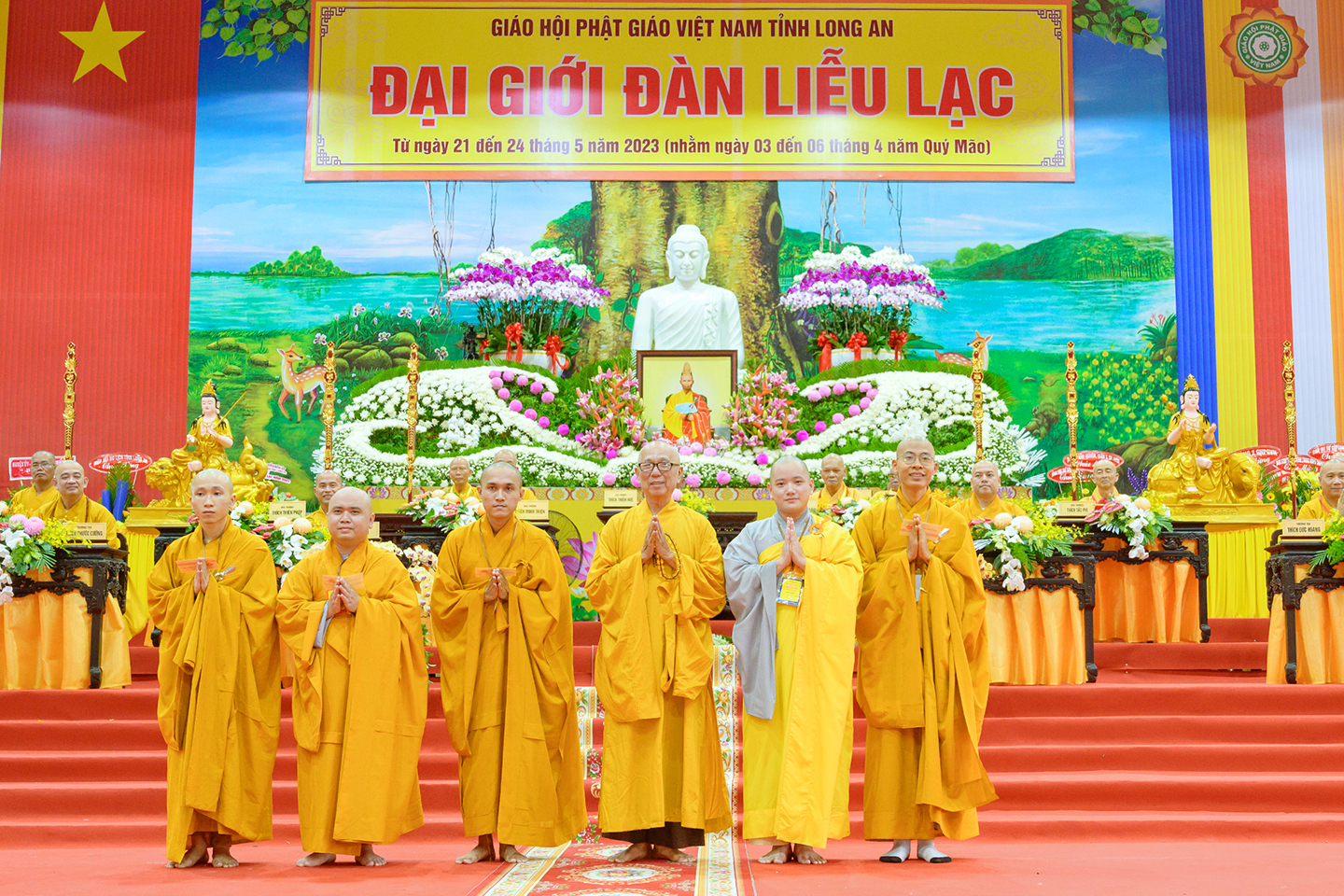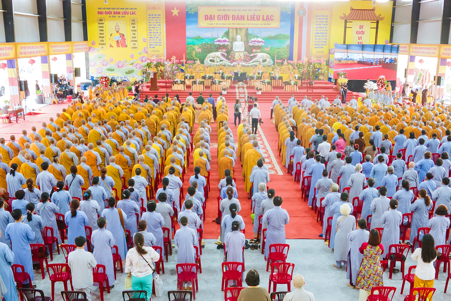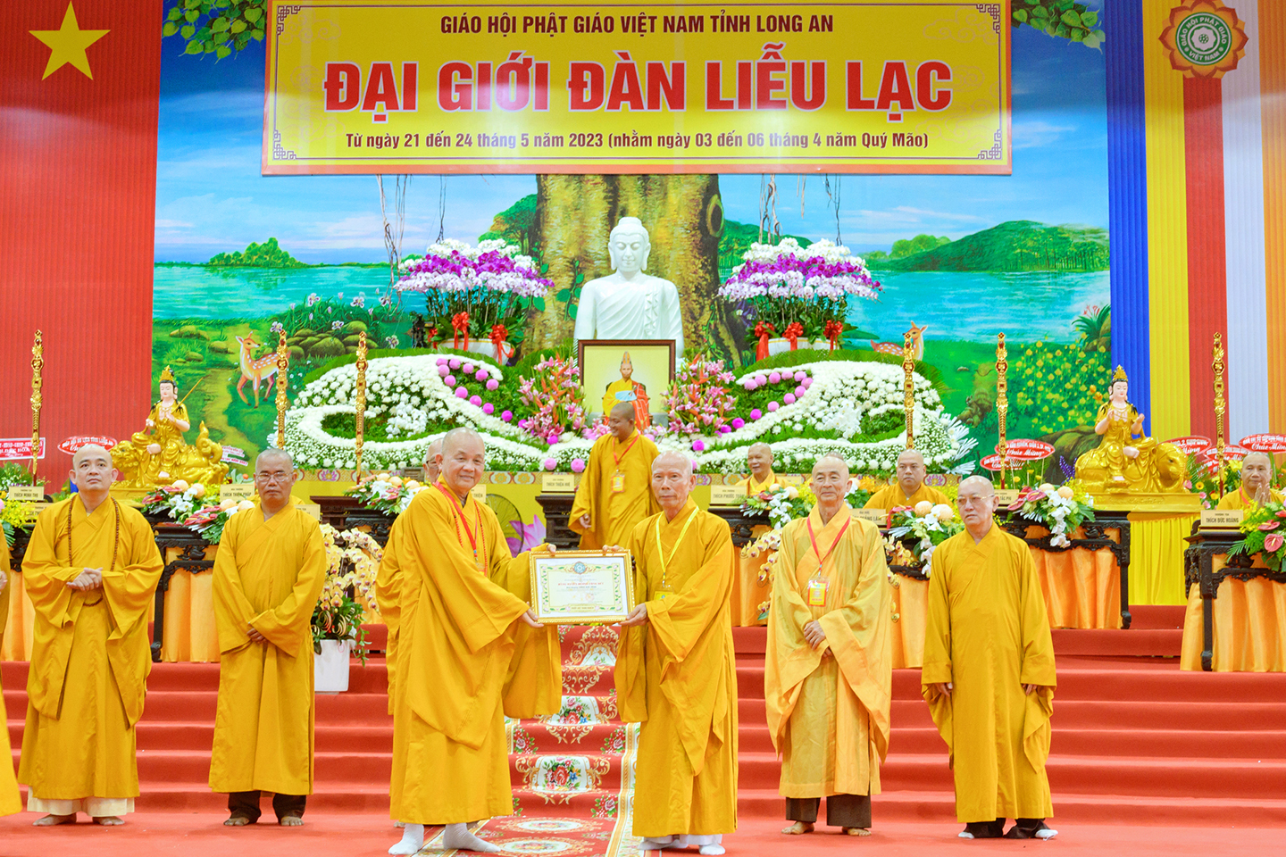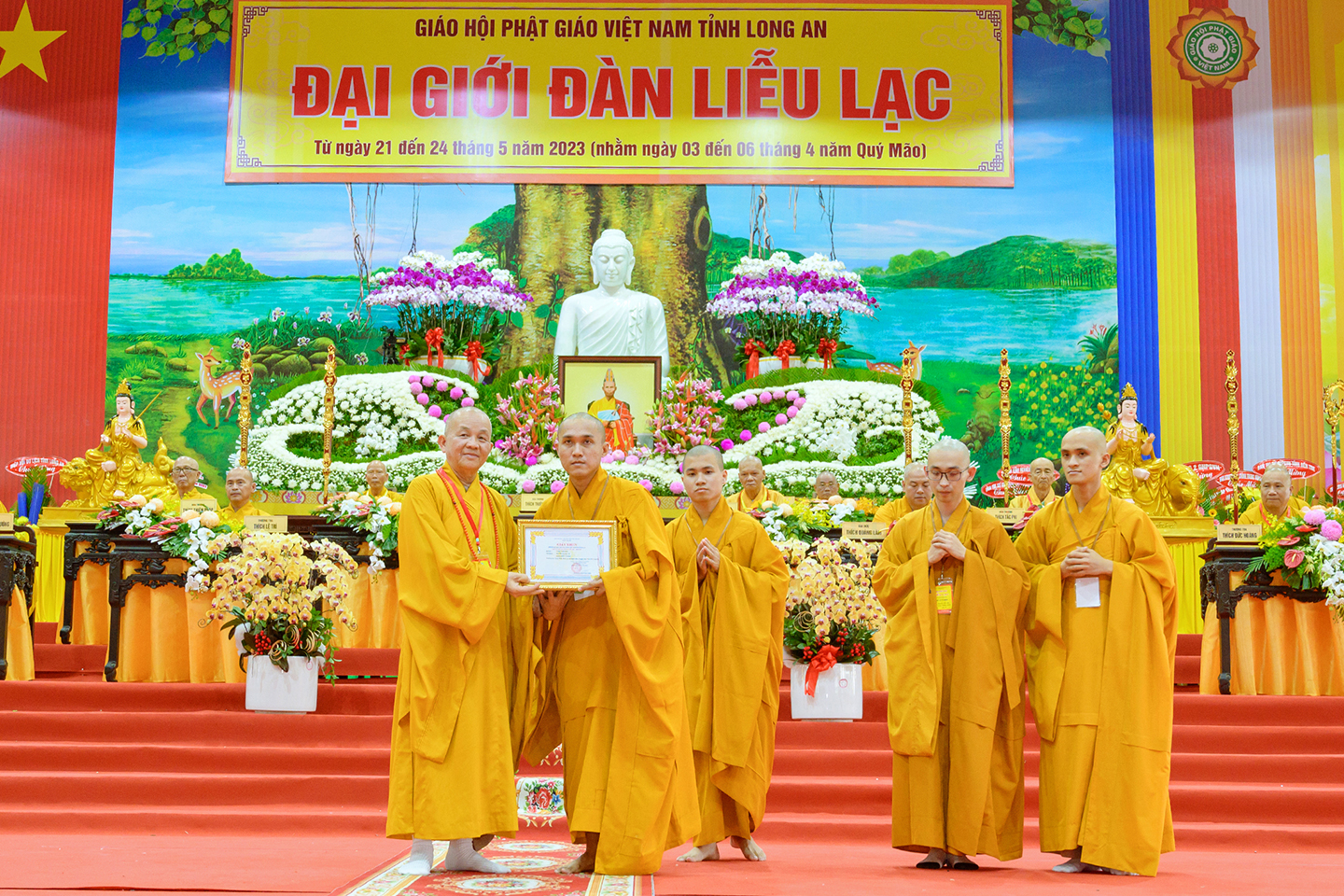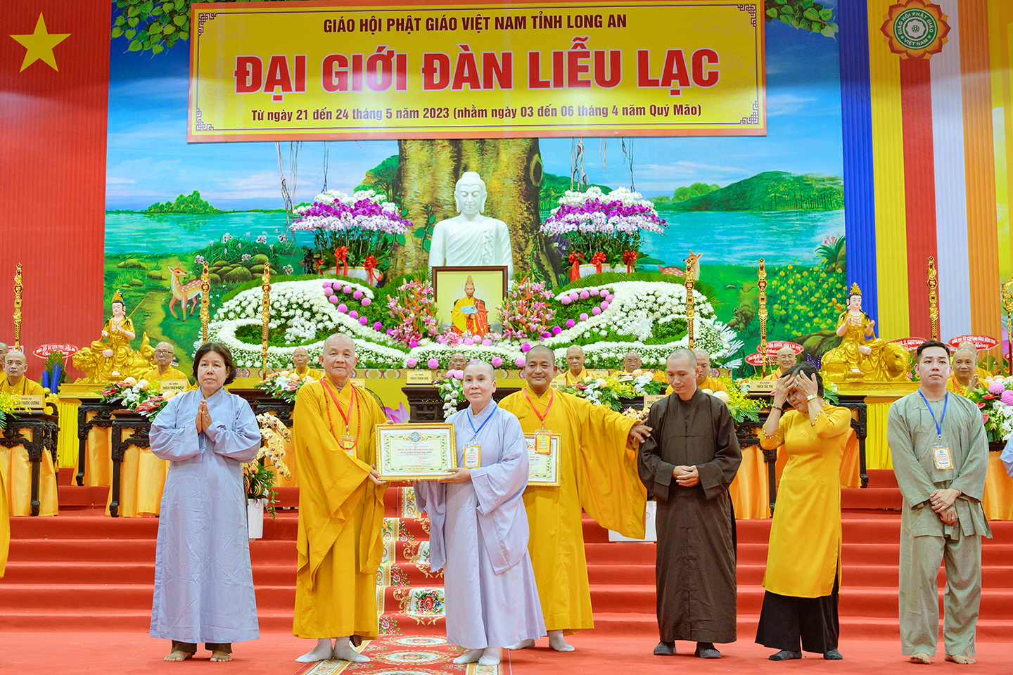 Chiều ngày 24/05/2023 nhằm ngày mùng 6/4 năm Quý Mão, theo chương trình Đại Giới đàn Liễu Lạc, Ban Tổ chức đã long trọng làm Lễ bế mạc Đại giới đàn Liễu Lạc sau 4 ngày diễn ra từ 21/05 đến 24/05/2023, nay đã được thành tựu viên mãn. Chứng minh buổi lễ với sự hiện diện, tham dự của: HT. Thích Thiện Huệ, Thành viên HĐCM, Chứng minh BTS GHPGVN tỉnh Long An; HT. Thích Lãng Huỳnh, Thành viên HĐCM, Tông trưởng Thiên Thai Giáo Quán; HT. Thích Huệ Hồng – Chứng minh BTS GHPGVN tỉnh Long An; HT. Thích Minh Thiện – UV HĐTS, Trưởng BTS GHPGVN tỉnh Long An, Trưởng ban Tổ chức Đại giới đàn; HT. Thích Phước Toàn – Chứng minh BTS GHPGVN quận Bình Tân; HT. Thích Thiện Pháp – Phó Trưởng ban Thường trực Ban Thừa kế Thiên Thai Thiền Giáo Tông, Chư tôn đức Phó BTS GHPGVN tỉnh Long An: HT. Thích Tắc Phi, TT. Thích Quảng Tâm, TT. Thích Minh Thọ, TT. Thích Lệ Trí, TT. Thích Đức Hoàng, ĐĐ. Thích Lệ Duyên, ĐĐ. Thích Lệ Ngôn, NT. TN. Gương Liên, NT. TN. Như Tâm, cùng chư tôn đức Hội đồng Thập sư, Ban Kiến đàn, Ban Trị sự tỉnh, huyện thị, thành và các Giới tử đã thọ nhận giới pháp cùng đông đảo quý Phật tử gần xa đồng tham dự. Về phía chính quyền có ông Phạm Văn Đồng, UV BTV Huyện ủy, Trưởng ban Dân vận huyện Đức Hòa; ông Nguyễn Văn Đạo, UV BTV Huyện ủy, Chủ tịch UB MTTQVN huyện; bà Trịnh Thị Ngọc Thanh – Phó Bí thư Đảng ủy, Chủ tịch HĐND xã Mỹ Hạnh Nam, cùng đại diện các cấp lãnh đạo chính quyền huyện Đức Hòa, xã Mỹ Hạnh Nam sở tại. ĐĐ. Thích An Nhựt, thay mặt Ban Kiến đàn báo cáo kết quả tổ chức Đại Giới đàn Liễu Lạc năm 2023. Đại Giới đàn diễn ra trong 4 ngày, từ ngày 21/5 đến 24/05/2023 nhằm ngày mùng 03 đến mùng 06/04 năm Quý Mão, với 349 Giới tử trúng tuyển kì thi khảo hạch. Trong đó, giới tử Tỳ kheo là 65 vị, Sa di là 105 vị, giới tử Tỳ kheo ni là 63 vị, Thức xoa ma na là 48 vị, Sa di ni là 68 vị. Đại Giới đàn lần này có 242 Giới tử xuất gia và tại gia phát tâm thọ Bồ tát giới.