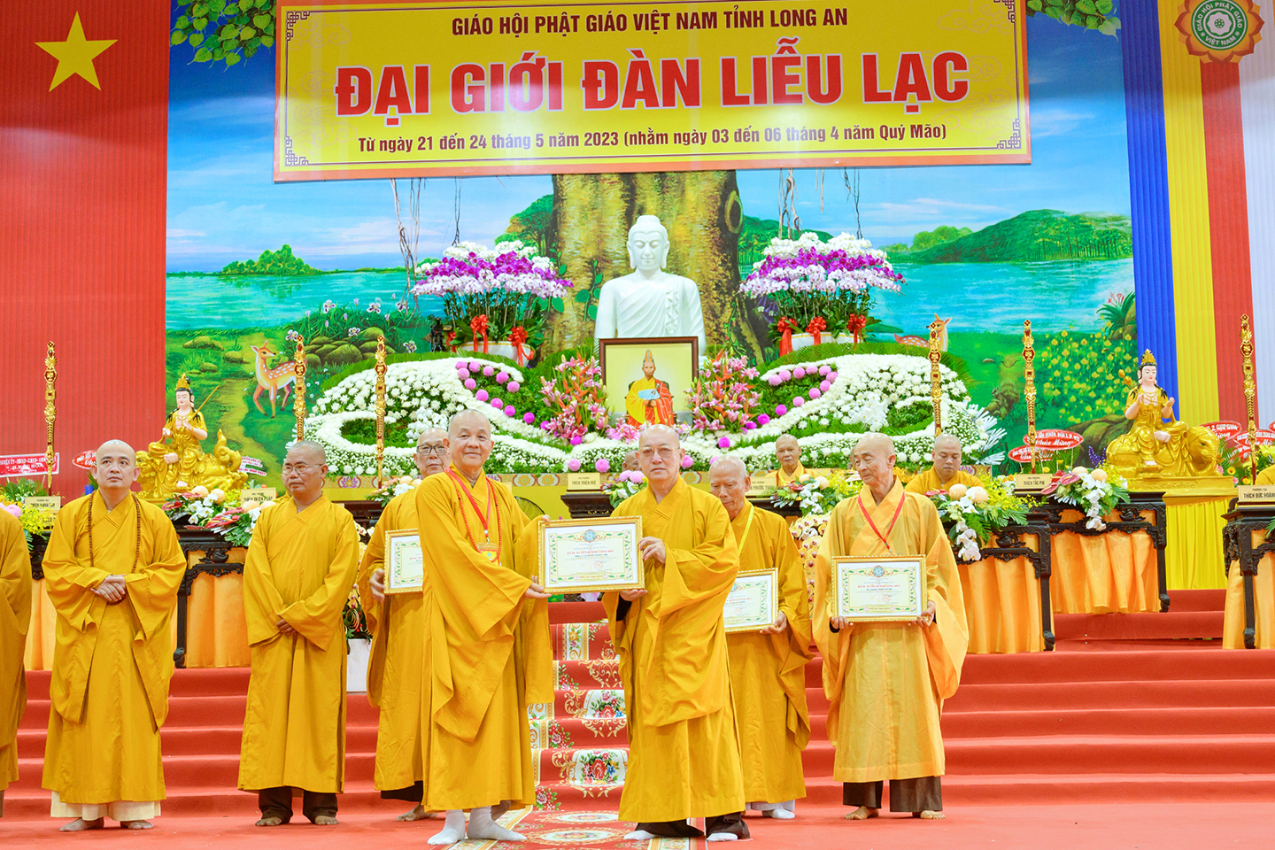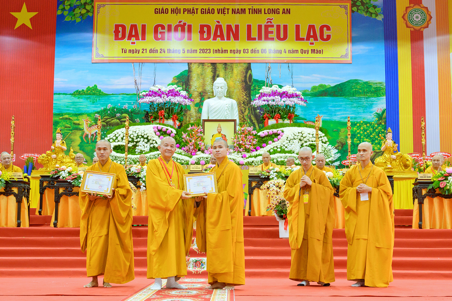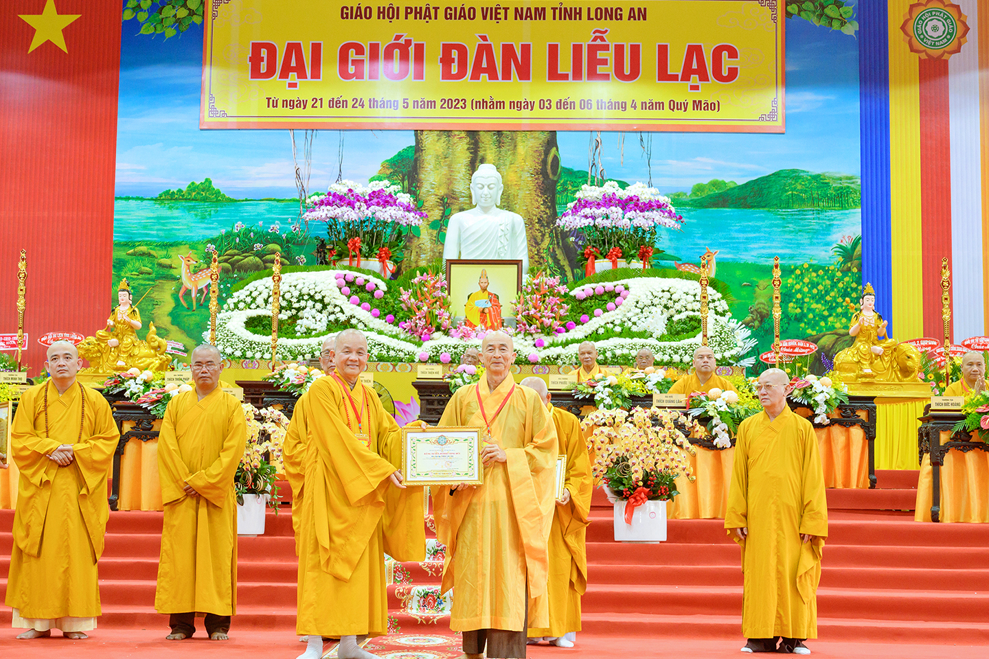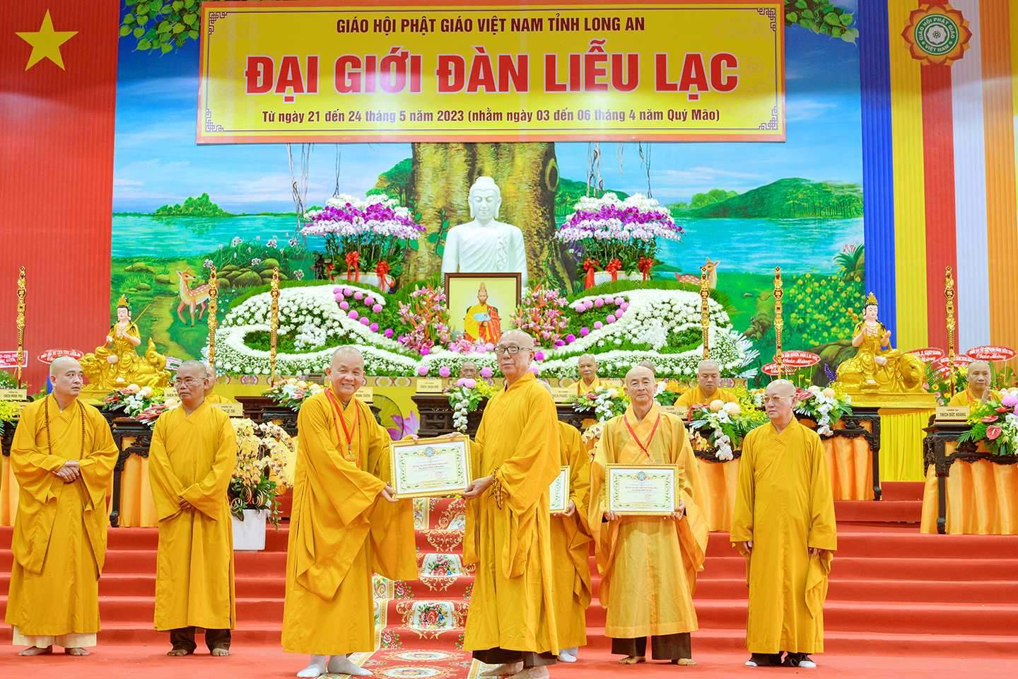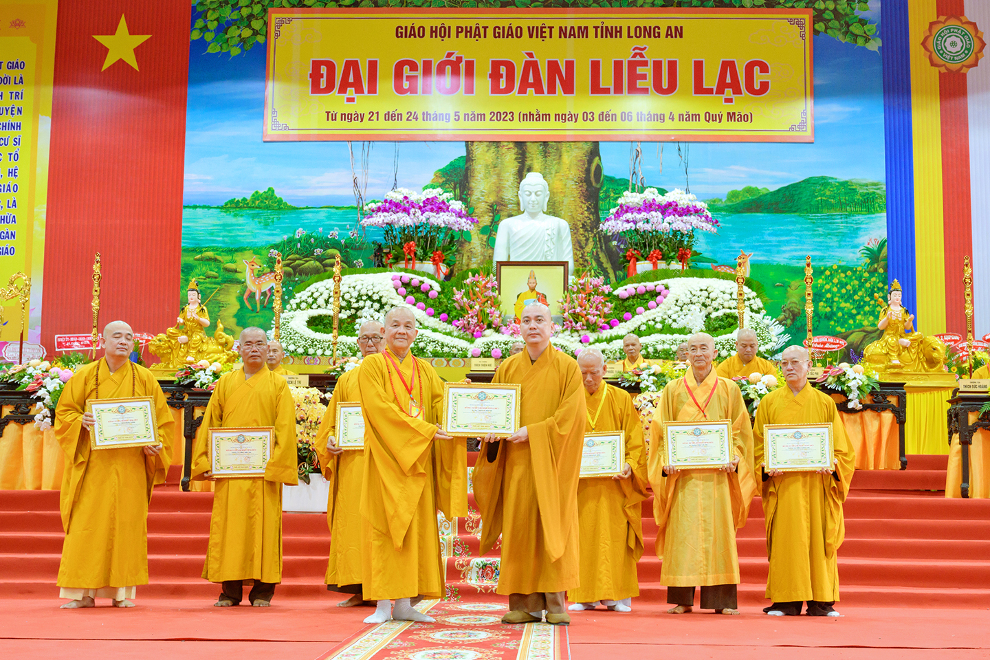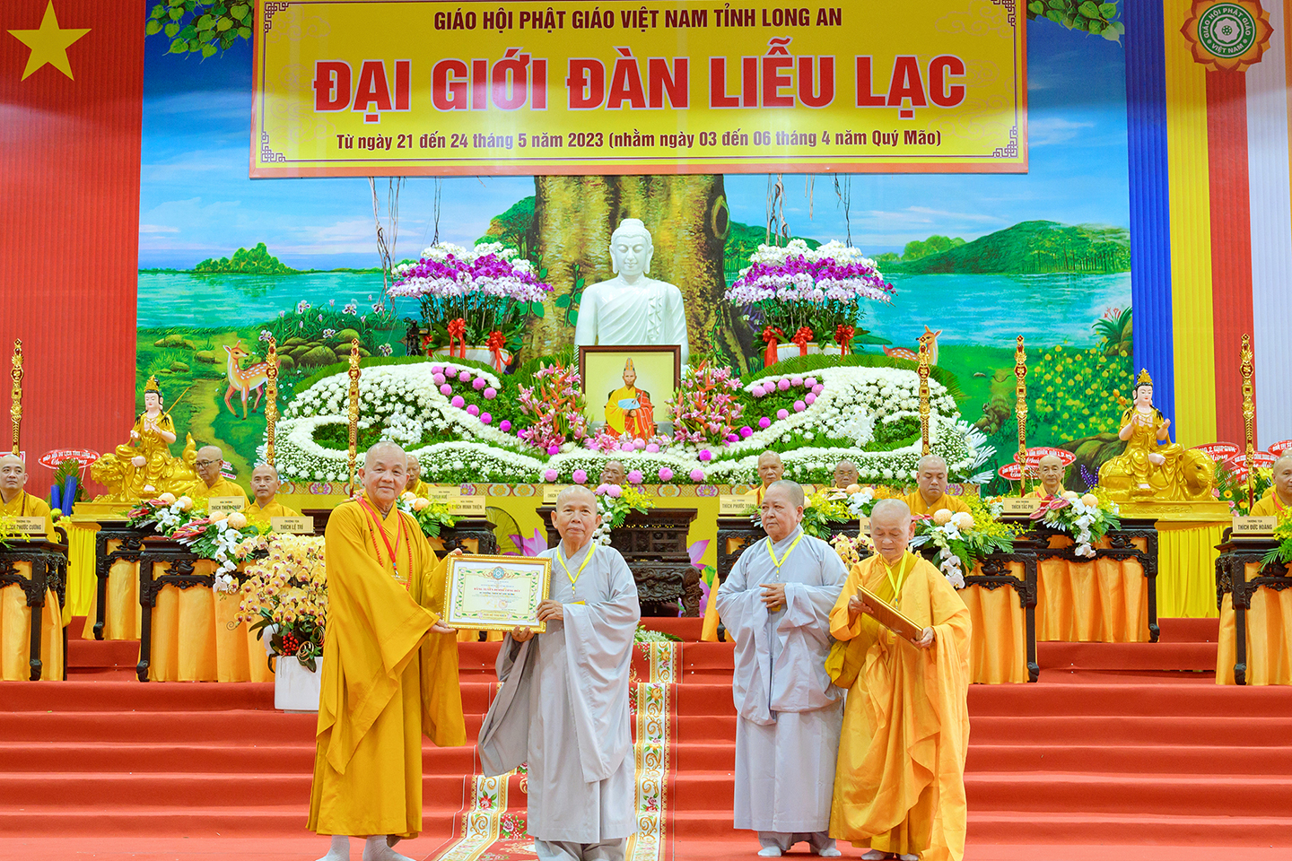 Chiều ngày 24/05/2023 nhằm ngày mùng 6/4 năm Quý Mão, theo chương trình Đại Giới đàn Liễu Lạc, Ban Tổ chức đã long trọng làm Lễ bế mạc Đại giới đàn Liễu Lạc sau 4 ngày diễn ra từ 21/05 đến 24/05/2023, nay đã được thành tựu viên mãn. Chứng minh buổi lễ với sự hiện diện, tham dự của: HT. Thích Thiện Huệ, Thành viên HĐCM, Chứng minh BTS GHPGVN tỉnh Long An; HT. Thích Lãng Huỳnh, Thành viên HĐCM, Tông trưởng Thiên Thai Giáo Quán; HT. Thích Huệ Hồng – Chứng minh BTS GHPGVN tỉnh Long An; HT. Thích Minh Thiện – UV HĐTS, Trưởng BTS GHPGVN tỉnh Long An, Trưởng ban Tổ chức Đại giới đàn; HT. Thích Phước Toàn – Chứng minh BTS GHPGVN quận Bình Tân; HT. Thích Thiện Pháp – Phó Trưởng ban Thường trực Ban Thừa kế Thiên Thai Thiền Giáo Tông, Chư tôn đức Phó BTS GHPGVN tỉnh Long An: HT. Thích Tắc Phi, TT. Thích Quảng Tâm, TT. Thích Minh Thọ, TT. Thích Lệ Trí, TT. Thích Đức Hoàng, ĐĐ. Thích Lệ Duyên, ĐĐ. Thích Lệ Ngôn, NT. TN. Gương Liên, NT. TN. Như Tâm, cùng chư tôn đức Hội đồng Thập sư, Ban Kiến đàn, Ban Trị sự tỉnh, huyện thị, thành và các Giới tử đã thọ nhận giới pháp cùng đông đảo quý Phật tử gần xa đồng tham dự. Về phía chính quyền có ông Phạm Văn Đồng, UV BTV Huyện ủy, Trưởng ban Dân vận huyện Đức Hòa; ông Nguyễn Văn Đạo, UV BTV Huyện ủy, Chủ tịch UB MTTQVN huyện; bà Trịnh Thị Ngọc Thanh – Phó Bí thư Đảng ủy, Chủ tịch HĐND xã Mỹ Hạnh Nam, cùng đại diện các cấp lãnh đạo chính quyền huyện Đức Hòa, xã Mỹ Hạnh Nam sở tại. ĐĐ. Thích An Nhựt, thay mặt Ban Kiến đàn báo cáo kết quả tổ chức Đại Giới đàn Liễu Lạc năm 2023. Đại Giới đàn diễn ra trong 4 ngày, từ ngày 21/5 đến 24/05/2023 nhằm ngày mùng 03 đến mùng 06/04 năm Quý Mão, với 349 Giới tử trúng tuyển kì thi khảo hạch. Trong đó, giới tử Tỳ kheo là 65 vị, Sa di là 105 vị, giới tử Tỳ kheo ni là 63 vị, Thức xoa ma na là 48 vị, Sa di ni là 68 vị. Đại Giới đàn lần này có 242 Giới tử xuất gia và tại gia phát tâm thọ Bồ tát giới.
