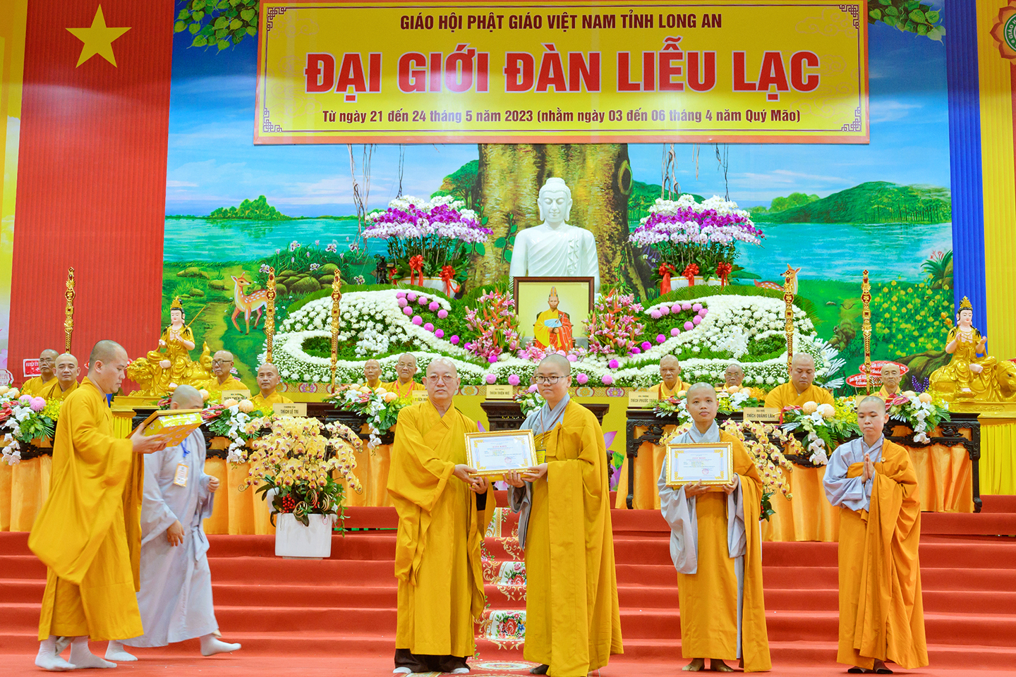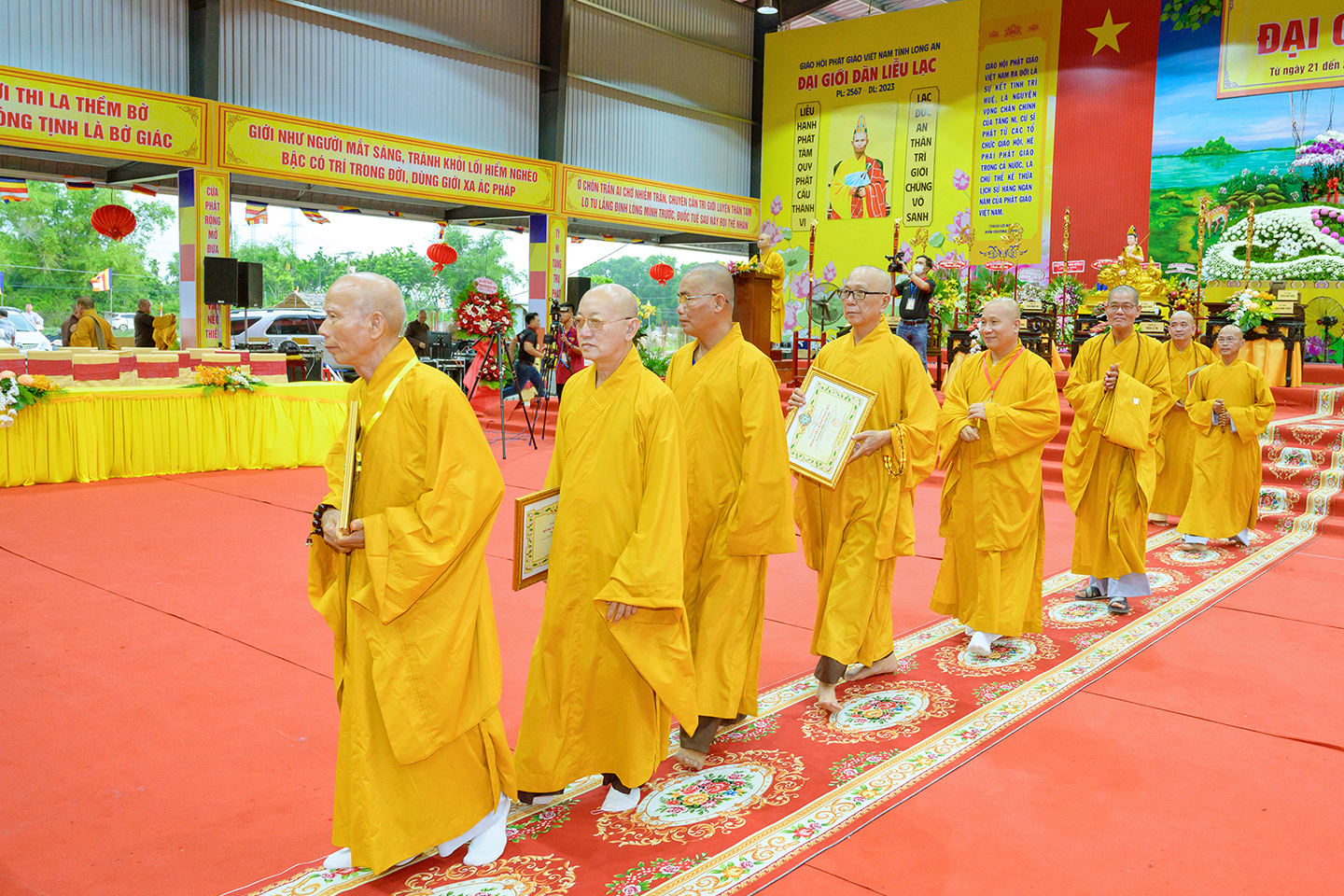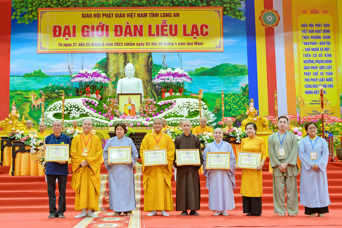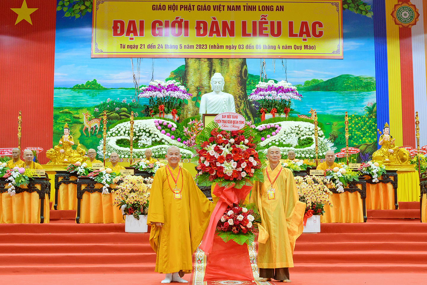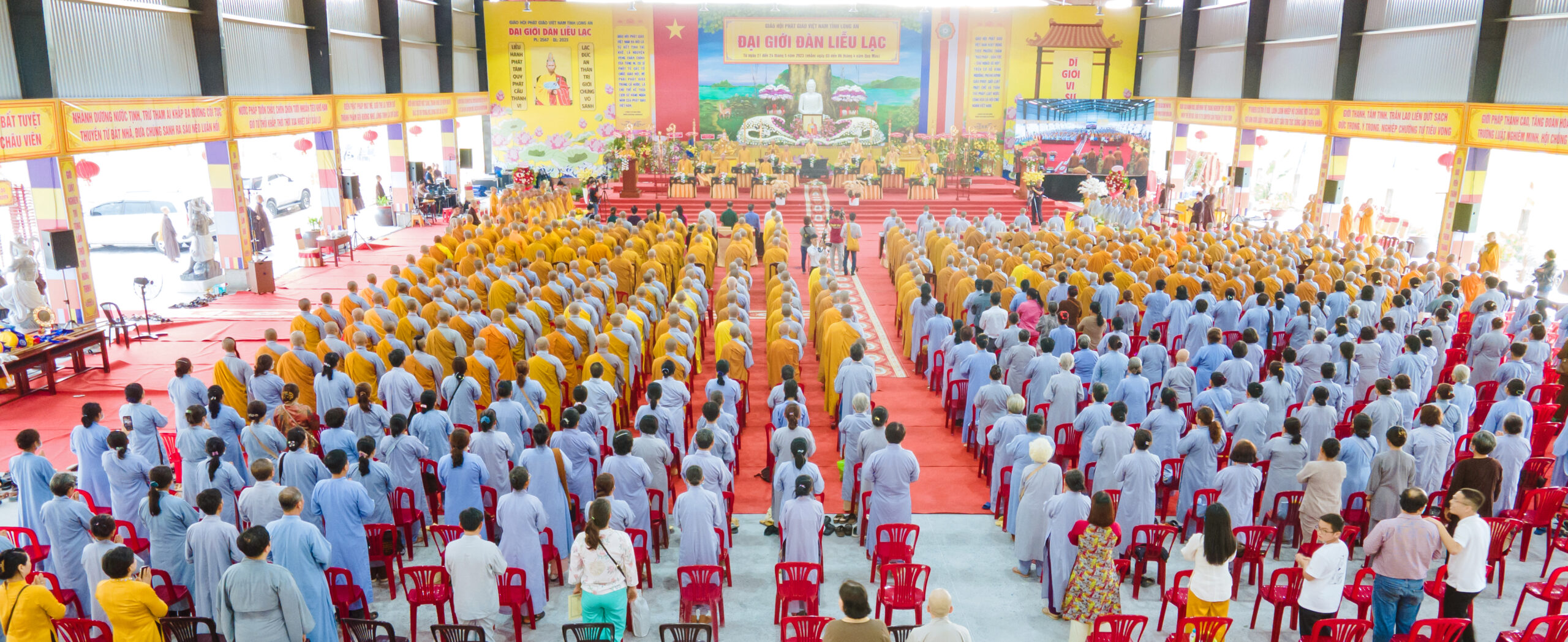 Chiều ngày 24/05/2023 nhằm ngày mùng 6/4 năm Quý Mão, theo chương trình Đại Giới đàn Liễu Lạc, Ban Tổ chức đã long trọng làm Lễ bế mạc Đại giới đàn Liễu Lạc sau 4 ngày diễn ra từ 21/05 đến 24/05/2023, nay đã được thành tựu viên mãn. Chứng minh buổi lễ với sự hiện diện, tham dự của: HT. Thích Thiện Huệ, Thành viên HĐCM, Chứng minh BTS GHPGVN tỉnh Long An; HT. Thích Lãng Huỳnh, Thành viên HĐCM, Tông trưởng Thiên Thai Giáo Quán; HT. Thích Huệ Hồng – Chứng minh BTS GHPGVN tỉnh Long An; HT. Thích Minh Thiện – UV HĐTS, Trưởng BTS GHPGVN tỉnh Long An, Trưởng ban Tổ chức Đại giới đàn; HT. Thích Phước Toàn – Chứng minh BTS GHPGVN quận Bình Tân; HT. Thích Thiện Pháp – Phó Trưởng ban Thường trực Ban Thừa kế Thiên Thai Thiền Giáo Tông, Chư tôn đức Phó BTS GHPGVN tỉnh Long An: HT. Thích Tắc Phi, TT. Thích Quảng Tâm, TT. Thích Minh Thọ, TT. Thích Lệ Trí, TT. Thích Đức Hoàng, ĐĐ. Thích Lệ Duyên, ĐĐ. Thích Lệ Ngôn, NT. TN. Gương Liên, NT. TN. Như Tâm, cùng chư tôn đức Hội đồng Thập sư, Ban Kiến đàn, Ban Trị sự tỉnh, huyện thị, thành và các Giới tử đã thọ nhận giới pháp cùng đông đảo quý Phật tử gần xa đồng tham dự. Về phía chính quyền có ông Phạm Văn Đồng, UV BTV Huyện ủy, Trưởng ban Dân vận huyện Đức Hòa; ông Nguyễn Văn Đạo, UV BTV Huyện ủy, Chủ tịch UB MTTQVN huyện; bà Trịnh Thị Ngọc Thanh – Phó Bí thư Đảng ủy, Chủ tịch HĐND xã Mỹ Hạnh Nam, cùng đại diện các cấp lãnh đạo chính quyền huyện Đức Hòa, xã Mỹ Hạnh Nam sở tại. ĐĐ. Thích An Nhựt, thay mặt Ban Kiến đàn báo cáo kết quả tổ chức Đại Giới đàn Liễu Lạc năm 2023. Đại Giới đàn diễn ra trong 4 ngày, từ ngày 21/5 đến 24/05/2023 nhằm ngày mùng 03 đến mùng 06/04 năm Quý Mão, với 349 Giới tử trúng tuyển kì thi khảo hạch. Trong đó, giới tử Tỳ kheo là 65 vị, Sa di là 105 vị, giới tử Tỳ kheo ni là 63 vị, Thức xoa ma na là 48 vị, Sa di ni là 68 vị. Đại Giới đàn lần này có 242 Giới tử xuất gia và tại gia phát tâm thọ Bồ tát giới.