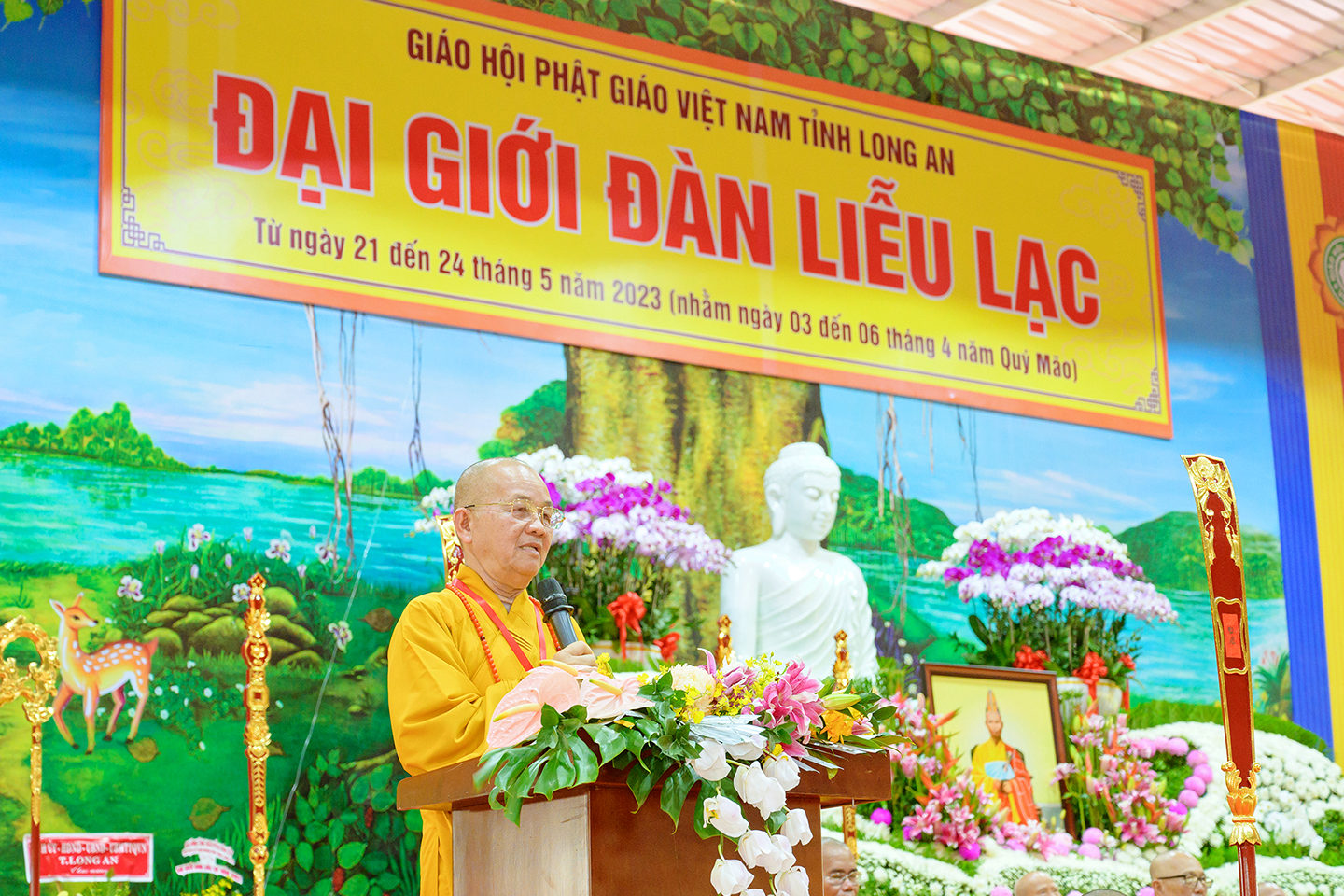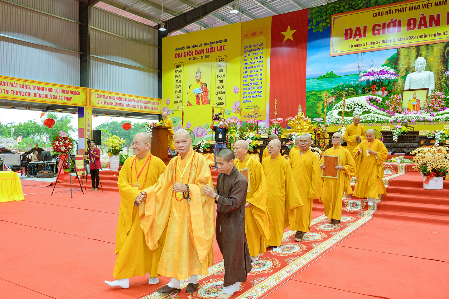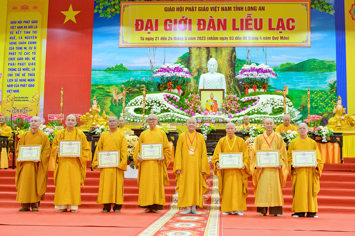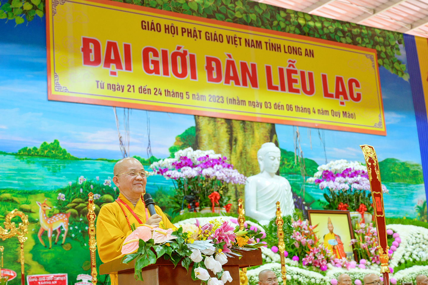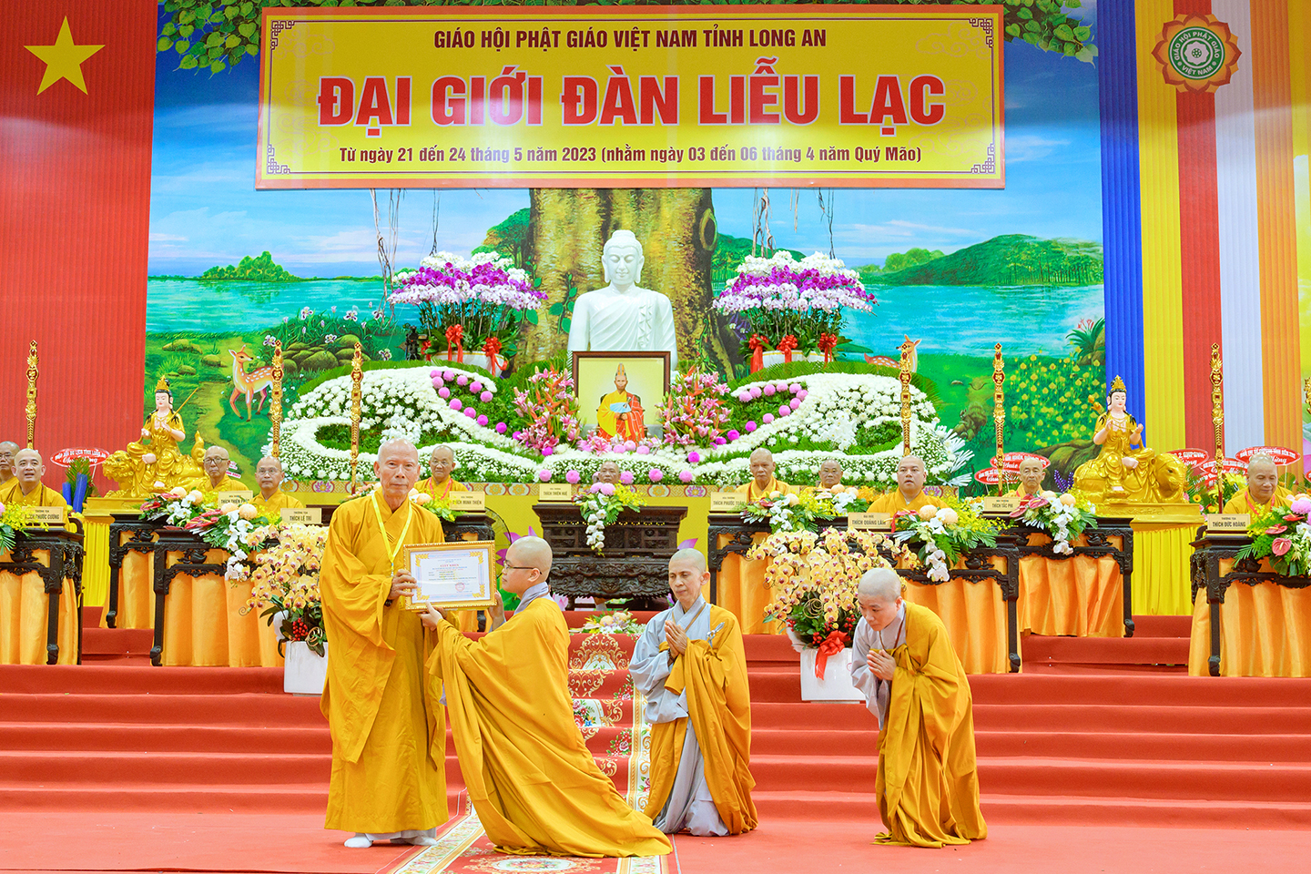 Chiều ngày 24/05/2023 nhằm ngày mùng 6/4 năm Quý Mão, theo chương trình Đại Giới đàn Liễu Lạc, Ban Tổ chức đã long trọng làm Lễ bế mạc Đại giới đàn Liễu Lạc sau 4 ngày diễn ra từ 21/05 đến 24/05/2023, nay đã được thành tựu viên mãn. Chứng minh buổi lễ với sự hiện diện, tham dự của: HT. Thích Thiện Huệ, Thành viên HĐCM, Chứng minh BTS GHPGVN tỉnh Long An; HT. Thích Lãng Huỳnh, Thành viên HĐCM, Tông trưởng Thiên Thai Giáo Quán; HT. Thích Huệ Hồng – Chứng minh BTS GHPGVN tỉnh Long An; HT. Thích Minh Thiện – UV HĐTS, Trưởng BTS GHPGVN tỉnh Long An, Trưởng ban Tổ chức Đại giới đàn; HT. Thích Phước Toàn – Chứng minh BTS GHPGVN quận Bình Tân; HT. Thích Thiện Pháp – Phó Trưởng ban Thường trực Ban Thừa kế Thiên Thai Thiền Giáo Tông, Chư tôn đức Phó BTS GHPGVN tỉnh Long An: HT. Thích Tắc Phi, TT. Thích Quảng Tâm, TT. Thích Minh Thọ, TT. Thích Lệ Trí, TT. Thích Đức Hoàng, ĐĐ. Thích Lệ Duyên, ĐĐ. Thích Lệ Ngôn, NT. TN. Gương Liên, NT. TN. Như Tâm, cùng chư tôn đức Hội đồng Thập sư, Ban Kiến đàn, Ban Trị sự tỉnh, huyện thị, thành và các Giới tử đã thọ nhận giới pháp cùng đông đảo quý Phật tử gần xa đồng tham dự. Về phía chính quyền có ông Phạm Văn Đồng, UV BTV Huyện ủy, Trưởng ban Dân vận huyện Đức Hòa; ông Nguyễn Văn Đạo, UV BTV Huyện ủy, Chủ tịch UB MTTQVN huyện; bà Trịnh Thị Ngọc Thanh – Phó Bí thư Đảng ủy, Chủ tịch HĐND xã Mỹ Hạnh Nam, cùng đại diện các cấp lãnh đạo chính quyền huyện Đức Hòa, xã Mỹ Hạnh Nam sở tại. ĐĐ. Thích An Nhựt, thay mặt Ban Kiến đàn báo cáo kết quả tổ chức Đại Giới đàn Liễu Lạc năm 2023. Đại Giới đàn diễn ra trong 4 ngày, từ ngày 21/5 đến 24/05/2023 nhằm ngày mùng 03 đến mùng 06/04 năm Quý Mão, với 349 Giới tử trúng tuyển kì thi khảo hạch. Trong đó, giới tử Tỳ kheo là 65 vị, Sa di là 105 vị, giới tử Tỳ kheo ni là 63 vị, Thức xoa ma na là 48 vị, Sa di ni là 68 vị. Đại Giới đàn lần này có 242 Giới tử xuất gia và tại gia phát tâm thọ Bồ tát giới.