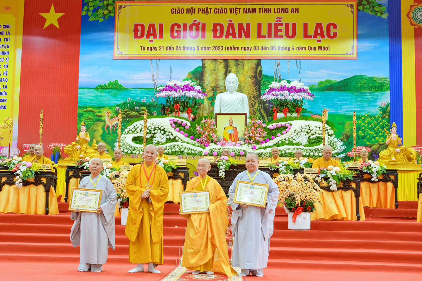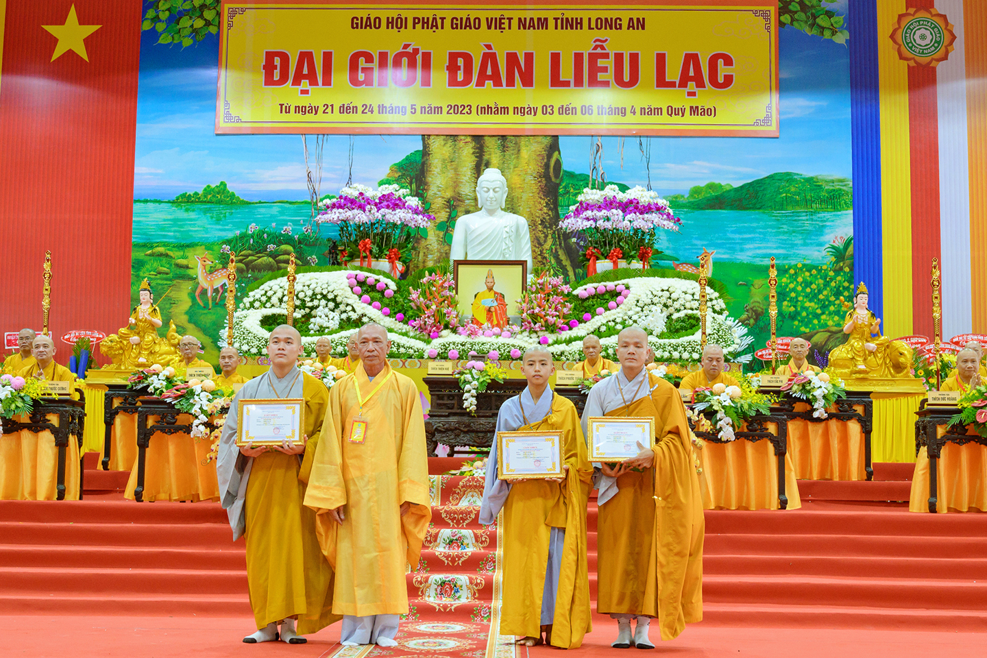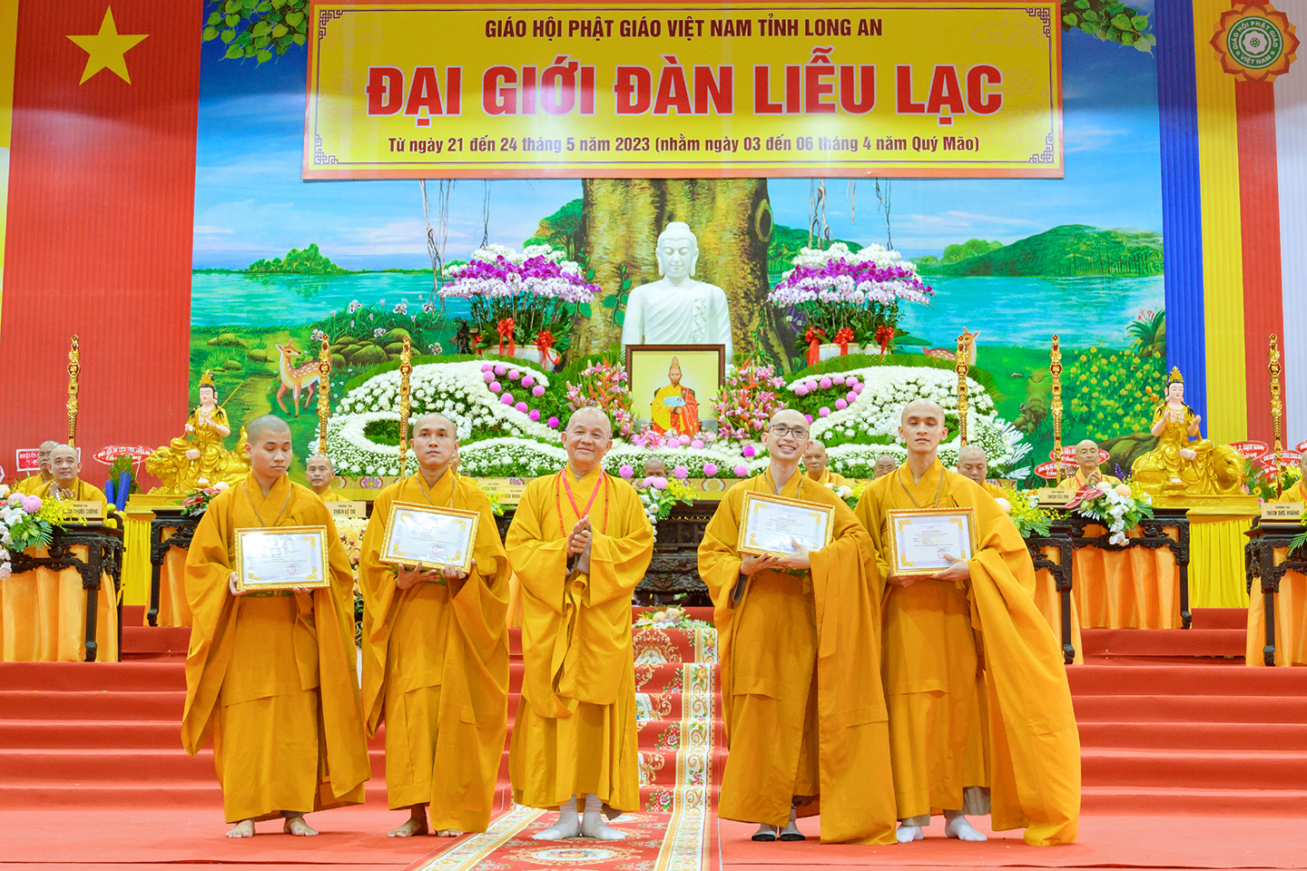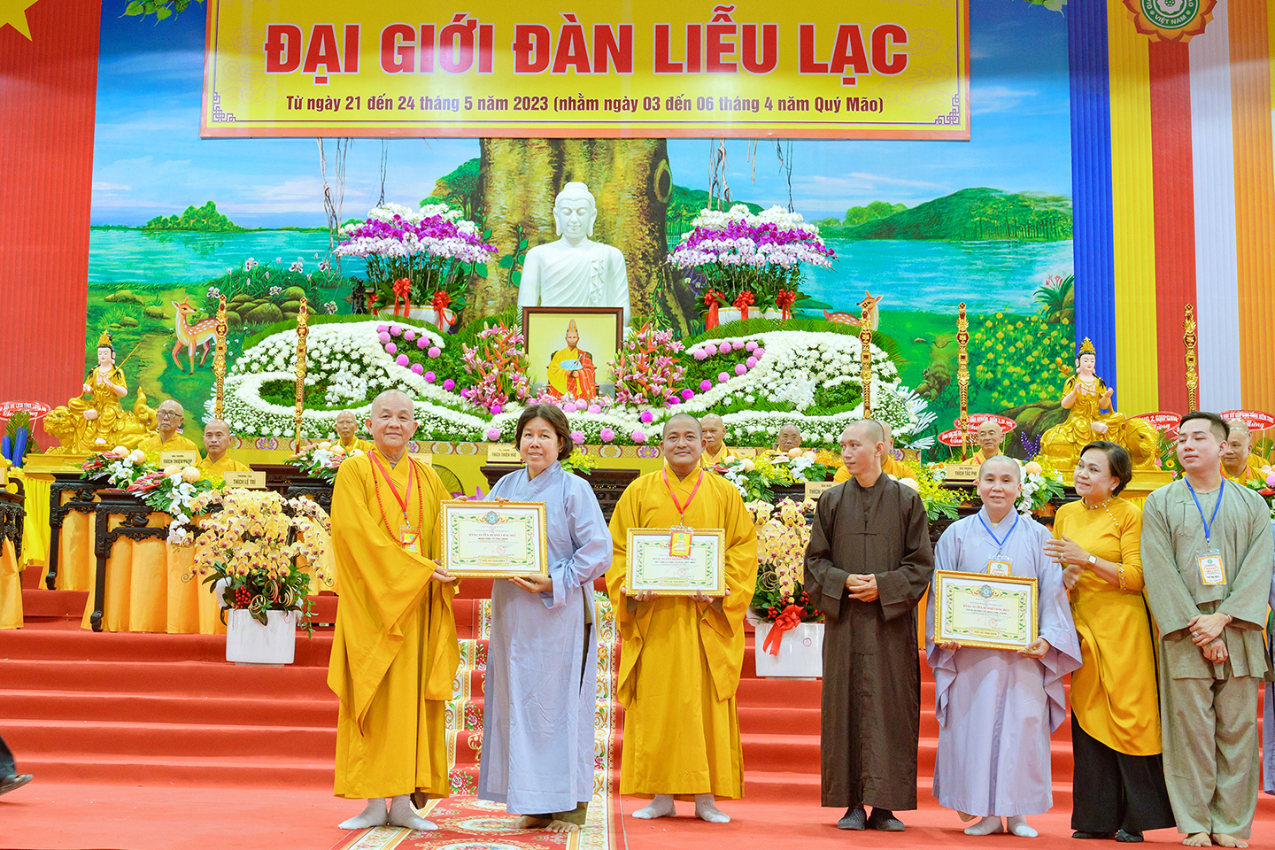 Tiếp đó, là phần phát thưởng cho các Giới tử đã trúng tuyển với kết quả cao trong kì khảo thí vừa qua. Nhân dịp này, để khích lệ và sách tấn tinh thần cầu học giới luật của các Giới tử, HT. Thích Thiện Pháp đã trao tặng phần thưởng cho 5 Giới tử Tăng đã có thành tích tốt trong buổi thi tụng Luật tại Giới trường Tăng. Thay mặt cho các Giới tử hiện tiền, Tân Tỳ kheo Thích Thiện Bảo đã dâng lời cảm tưởng, niệm ân chư Tôn đức Giới sư, chư Tôn đức Ban tổ chức cùng toàn thể quý Phật tử phát tâm hộ trì trong những ngày qua. Với tâm thành trân trọng nhất, trong giờ phút này các Giới tử đồng hướng tâm về quý Ngài thành kính niệm ân, thầm cầu nguyện Tam bảo gia hộ chư Tôn đức, Pháp thể khinh an, Phật sự viên thành, thầm ghi nhớ lời dạy của quý Ngài trong những ngày qua làm hành trang cho quá trình tu học của mình sau này, với tâm nguyện: “Phát đại tâm, thực hành đại nguyện”. Thay mặt Ban Tổ chức, Ban Kiến đàn cùng chư Tôn đức, HT. Thích Minh Thiện phát biểu, với những lời tri ân sâu sắc đến Đức Trưởng lão Hoà thượng Pháp chủ, HT. Phó Pháp chủ, HT. Chủ tịch HĐTS, HT. Phó Chủ tịch TT HĐTS cùng chư Tôn đức Trưởng lão HT giáo phẩm HĐCM, HĐTS, chư Tôn đức lãnh đạo, chư Tôn đức BTC, Ban Kiến đàn cùng chư Tôn đức hiện tiền, quý vị lãnh đạo chính quyền các cấp và địa phương sở tại. Đặc biệt là ông Trương Tấn Sang cùng gia đình, tộc họ Trương. HT nhất tâm hướng về đức HT. Thích Liễu Lạc, tôn hiệu Đại Giới đàn, với đôi lời về quá trình hình thành, phục hưng và phát triển như ngày nay. HT nhắn gửi các vị Giới tử hãy nhớ thực hành theo những gì đã được truyền trao từ chư Tôn đức trong những ngày qua. Ngoài việc học giới luật còn phải có lòng yêu nước, tự hào dân tộc, với phương châm: “Lợi đạo – ích đời”. Cuối lời, HT kính nguyện hồng ân Tam bảo gia hộ cho các Giới tử vững tâm, vững bước trên con đường tu tập, làm lợi ích cho cuộc đời. Ban đạo từ cho buổi lễ, HT. Thích Thiện Huệ gửi lời chào đến chư Tôn đức, quý vị chính quyền ban ngành các cấp, quý Phật tử gần xa và toàn thể đại chúng hiện tiền. HT bày tỏ niềm đại hoan hỷ của mình khi nhìn thấy Ban tổ chức đã tổ chức thành tựu Đại Giới đàn cho chư Giới tử từ khắp nơi được thọ Giới pháp, viên tròn Giới thể. Sau cùng, HT kính nguyện mười phương Tam bảo gia hộ chư Tôn đức Ban tổ chức sức khoẻ, viên tròn Phật sự. HT nhắn gửi đến quý Giới tử hãy nhớ rằng hôm nay được đầy đủ Giới thể thì phải luôn ghi nhớ công ơn của chư Tôn đức, chư vị Giới sư, các Phật tử hộ trì cùng với chư vị Bổn sư, Y chỉ sư của các vị mà nhớ rằng: “luôn giữ tâm thanh tịnh, giữ giới pháp trang nghiêm, thì đó đã gọi là đền ơn”. Tiếp nhận lời đạo từ cao quý của HT, các Giới tử đồng thanh phát nguyện Y giáo phụng hành. Tại lễ bế mạc, BTC cũng nhận được Khánh vàng và những lẵng hoa, phần quà để chúc mừng cho sự thành tựu viên mãn của Đại Giới đàn Liễu Lạc. Thay mặt cho BTC, ĐĐ. Thích Lệ Duyên có lời cảm tạ và tuyên bố bế mạc Đại Giới đàn Liễu Lạc năm 2023. Đại đức thành kính tri ân đến chư tôn đức, quý Phật tử và các đơn vị đã phát tâm hỗ trợ để Đại giới đàn được thành tựu viên mãn. Được biết sau lễ bế mạc sẽ là nghi thức Tấn hương của Đại Giới đàn. Đại Giới đàn Liễu Lạc đã diễn ra theo đúng chương trình đề ra trong 4 ngày, với 349 Giới tử cầu thọ giới pháp, cùng những thành tựu đáng ghi nhận. Từ nay các Giới tử đã được viên tròn Giới thể, chính thức bước vào hàng Tăng, đem ánh sáng Từ bi – Trí tuệ đến khắp nơi cho mọi người. Nhiệm vụ của Ban Tổ chức, đến đây đã viên mãn điều còn lại nằm ở quý Giới tử, những người vừa được truyền trao Giới pháp, làm cho mạng mạch Phật pháp được lưu truyền, đây cũng là mong mỏi của chư Tôn đức Giới sư, chư Tôn đức trong Ban Tổ chức và mong mỏi của hàng Phật tử phát tâm hộ trì Đại Giới đàn.