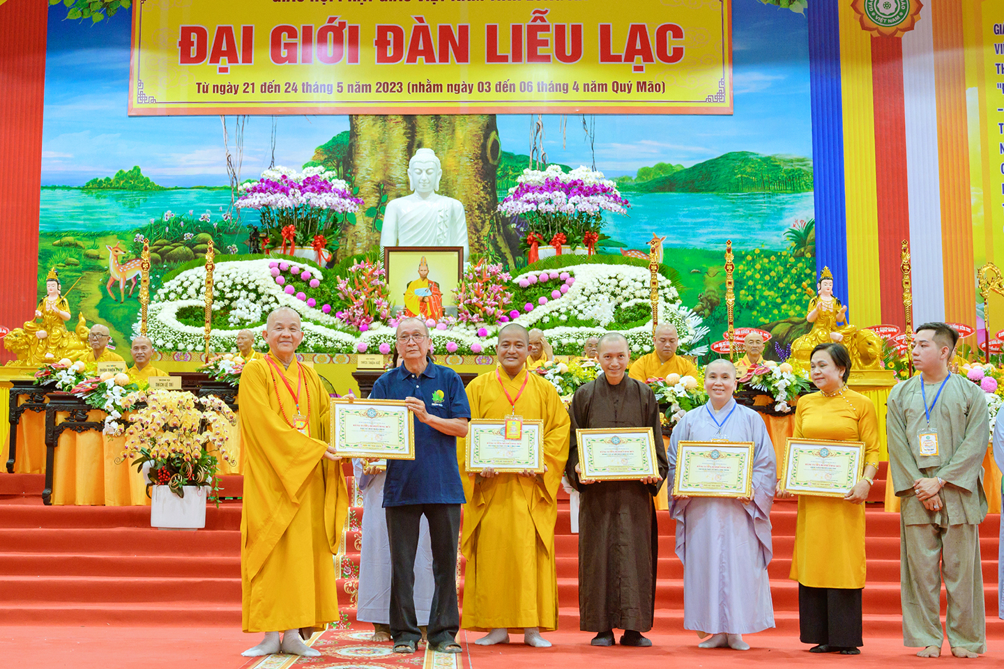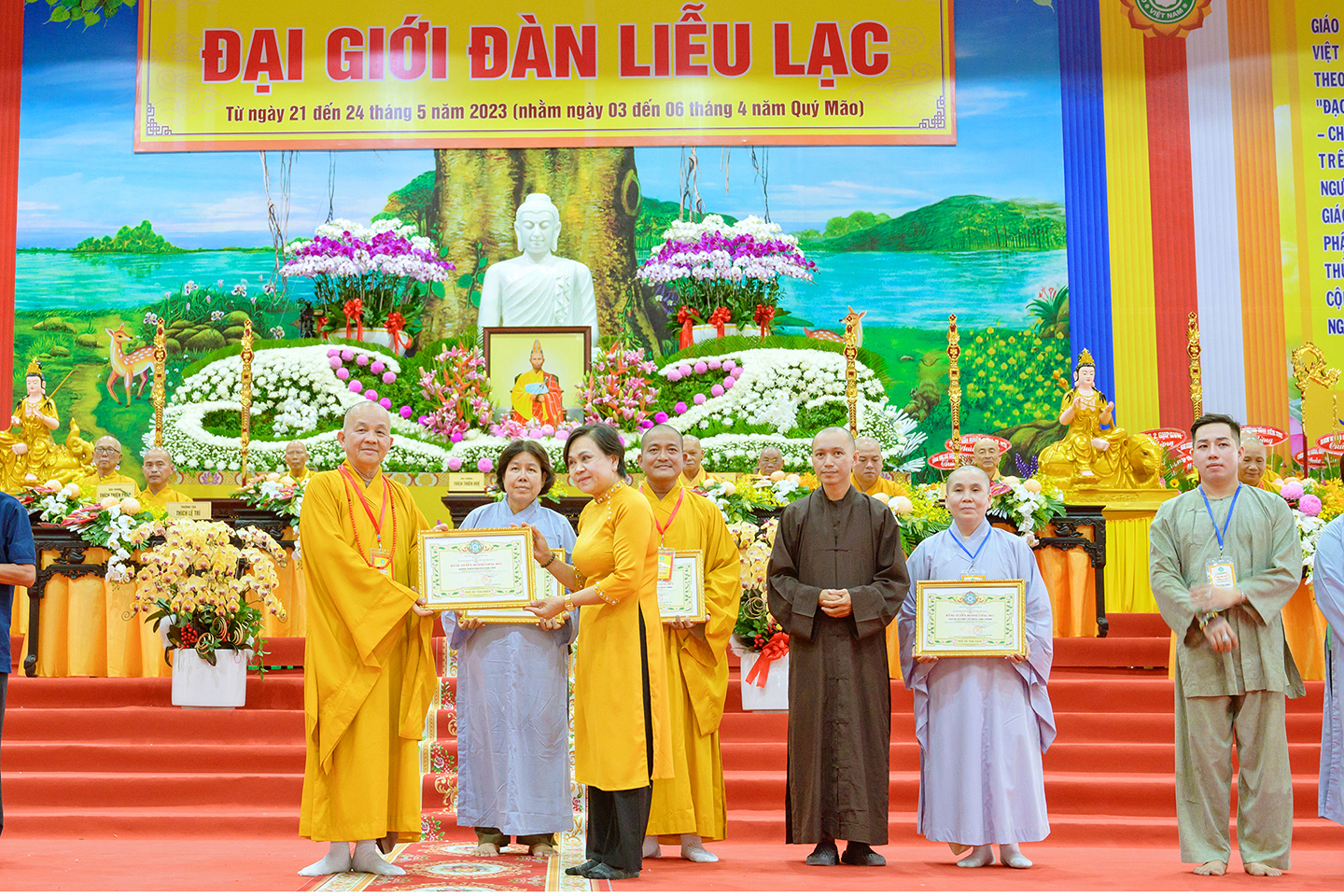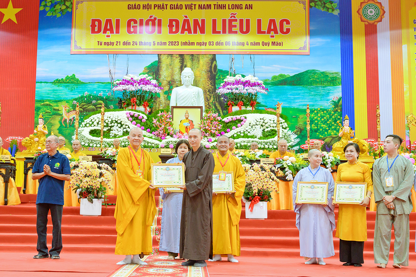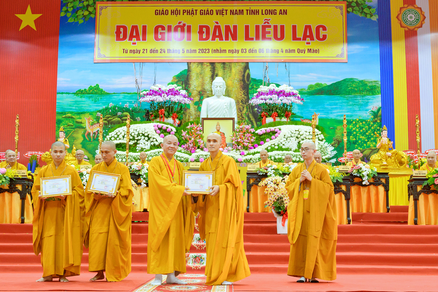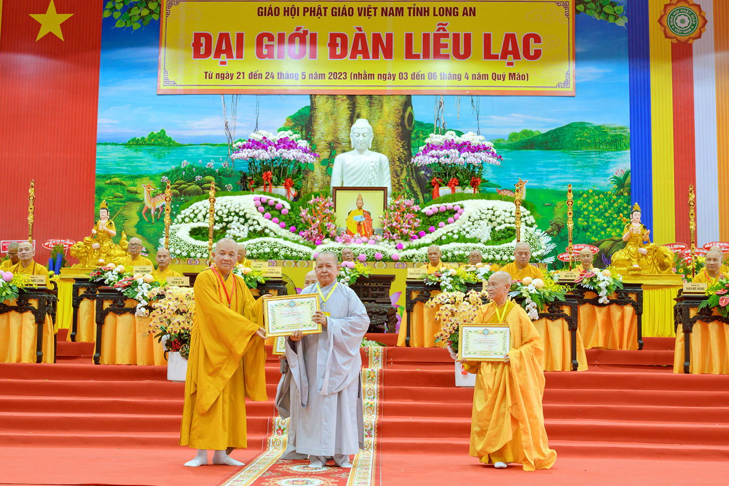 Tiếp đó, là phần phát thưởng cho các Giới tử đã trúng tuyển với kết quả cao trong kì khảo thí vừa qua. Nhân dịp này, để khích lệ và sách tấn tinh thần cầu học giới luật của các Giới tử, HT. Thích Thiện Pháp đã trao tặng phần thưởng cho 5 Giới tử Tăng đã có thành tích tốt trong buổi thi tụng Luật tại Giới trường Tăng. Thay mặt cho các Giới tử hiện tiền, Tân Tỳ kheo Thích Thiện Bảo đã dâng lời cảm tưởng, niệm ân chư Tôn đức Giới sư, chư Tôn đức Ban tổ chức cùng toàn thể quý Phật tử phát tâm hộ trì trong những ngày qua. Với tâm thành trân trọng nhất, trong giờ phút này các Giới tử đồng hướng tâm về quý Ngài thành kính niệm ân, thầm cầu nguyện Tam bảo gia hộ chư Tôn đức, Pháp thể khinh an, Phật sự viên thành, thầm ghi nhớ lời dạy của quý Ngài trong những ngày qua làm hành trang cho quá trình tu học của mình sau này, với tâm nguyện: “Phát đại tâm, thực hành đại nguyện”. Thay mặt Ban Tổ chức, Ban Kiến đàn cùng chư Tôn đức, HT. Thích Minh Thiện phát biểu, với những lời tri ân sâu sắc đến Đức Trưởng lão Hoà thượng Pháp chủ, HT. Phó Pháp chủ, HT. Chủ tịch HĐTS, HT. Phó Chủ tịch TT HĐTS cùng chư Tôn đức Trưởng lão HT giáo phẩm HĐCM, HĐTS, chư Tôn đức lãnh đạo, chư Tôn đức BTC, Ban Kiến đàn cùng chư Tôn đức hiện tiền, quý vị lãnh đạo chính quyền các cấp và địa phương sở tại. Đặc biệt là ông Trương Tấn Sang cùng gia đình, tộc họ Trương. HT nhất tâm hướng về đức HT. Thích Liễu Lạc, tôn hiệu Đại Giới đàn, với đôi lời về quá trình hình thành, phục hưng và phát triển như ngày nay. HT nhắn gửi các vị Giới tử hãy nhớ thực hành theo những gì đã được truyền trao từ chư Tôn đức trong những ngày qua. Ngoài việc học giới luật còn phải có lòng yêu nước, tự hào dân tộc, với phương châm: “Lợi đạo – ích đời”. Cuối lời, HT kính nguyện hồng ân Tam bảo gia hộ cho các Giới tử vững tâm, vững bước trên con đường tu tập, làm lợi ích cho cuộc đời. Ban đạo từ cho buổi lễ, HT. Thích Thiện Huệ gửi lời chào đến chư Tôn đức, quý vị chính quyền ban ngành các cấp, quý Phật tử gần xa và toàn thể đại chúng hiện tiền. HT bày tỏ niềm đại hoan hỷ của mình khi nhìn thấy Ban tổ chức đã tổ chức thành tựu Đại Giới đàn cho chư Giới tử từ khắp nơi được thọ Giới pháp, viên tròn Giới thể. Sau cùng, HT kính nguyện mười phương Tam bảo gia hộ chư Tôn đức Ban tổ chức sức khoẻ, viên tròn Phật sự. HT nhắn gửi đến quý Giới tử hãy nhớ rằng hôm nay được đầy đủ Giới thể thì phải luôn ghi nhớ công ơn của chư Tôn đức, chư vị Giới sư, các Phật tử hộ trì cùng với chư vị Bổn sư, Y chỉ sư của các vị mà nhớ rằng: “luôn giữ tâm thanh tịnh, giữ giới pháp trang nghiêm, thì đó đã gọi là đền ơn”. Tiếp nhận lời đạo từ cao quý của HT, các Giới tử đồng thanh phát nguyện Y giáo phụng hành. Tại lễ bế mạc, BTC cũng nhận được Khánh vàng và những lẵng hoa, phần quà để chúc mừng cho sự thành tựu viên mãn của Đại Giới đàn Liễu Lạc. Thay mặt cho BTC, ĐĐ. Thích Lệ Duyên có lời cảm tạ và tuyên bố bế mạc Đại Giới đàn Liễu Lạc năm 2023. Đại đức thành kính tri ân đến chư tôn đức, quý Phật tử và các đơn vị đã phát tâm hỗ trợ để Đại giới đàn được thành tựu viên mãn. Được biết sau lễ bế mạc sẽ là nghi thức Tấn hương của Đại Giới đàn. Đại Giới đàn Liễu Lạc đã diễn ra theo đúng chương trình đề ra trong 4 ngày, với 349 Giới tử cầu thọ giới pháp, cùng những thành tựu đáng ghi nhận. Từ nay các Giới tử đã được viên tròn Giới thể, chính thức bước vào hàng Tăng, đem ánh sáng Từ bi – Trí tuệ đến khắp nơi cho mọi người. Nhiệm vụ của Ban Tổ chức, đến đây đã viên mãn điều còn lại nằm ở quý Giới tử, những người vừa được truyền trao Giới pháp, làm cho mạng mạch Phật pháp được lưu truyền, đây cũng là mong mỏi của chư Tôn đức Giới sư, chư Tôn đức trong Ban Tổ chức và mong mỏi của hàng Phật tử phát tâm hộ trì Đại Giới đàn.