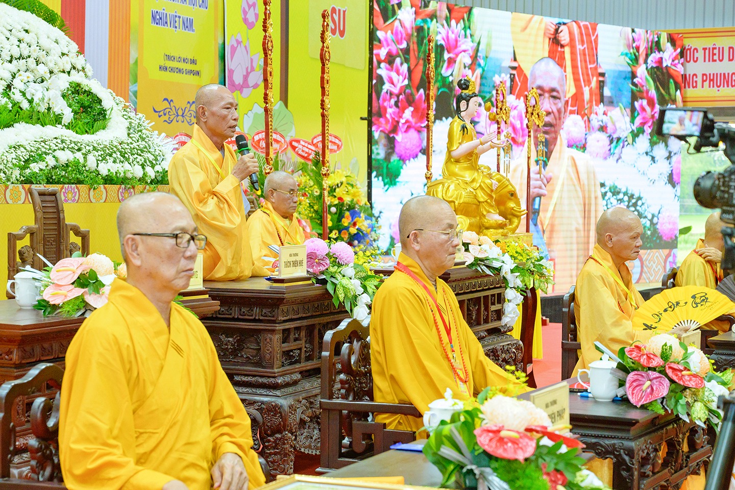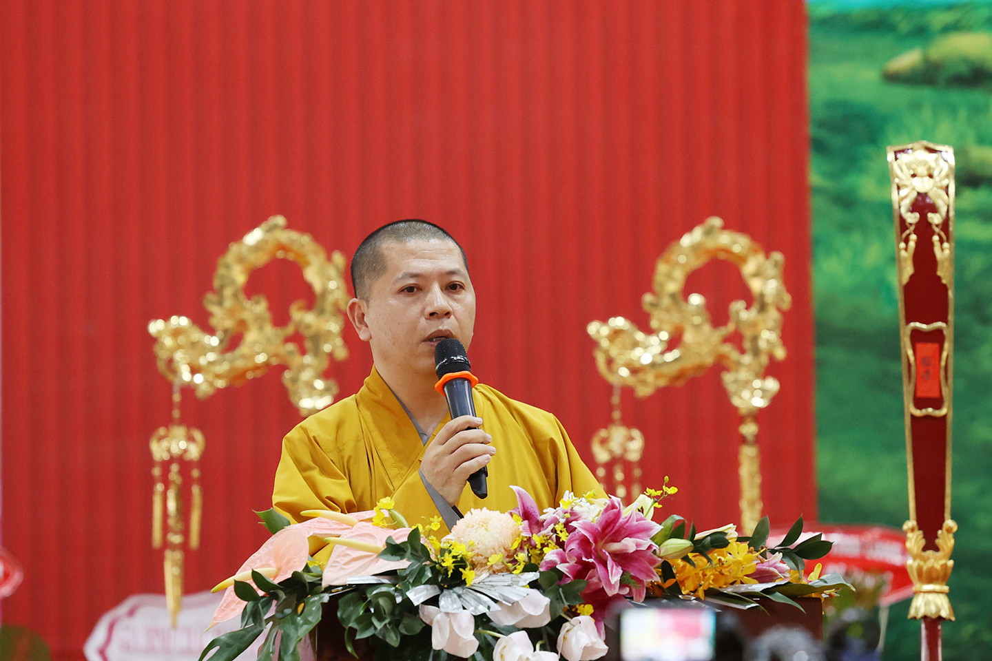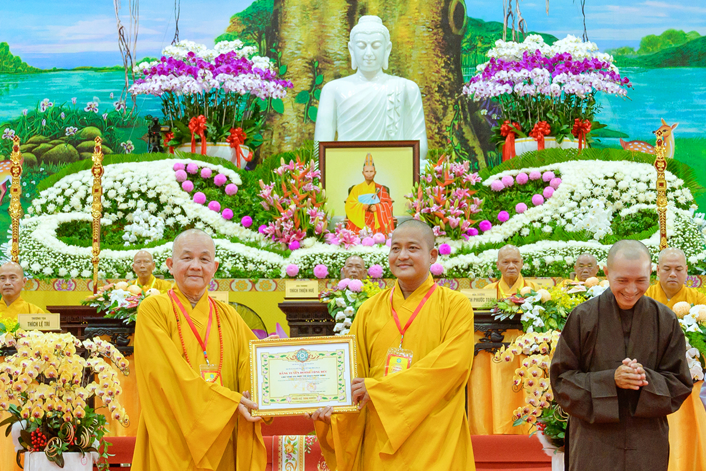 Thích Minh Thiện thay mặt Ban Thường trực BTS PG tỉnh Long An đã trao tặng bằng Tuyên dương công đức chư vị Giới sư các đàn giới tại 2 Giới trường.