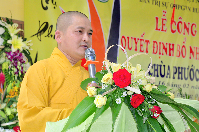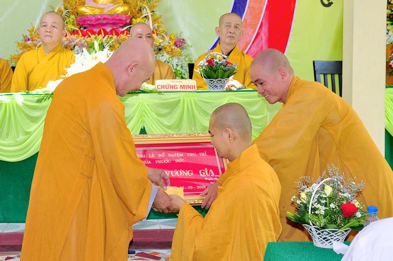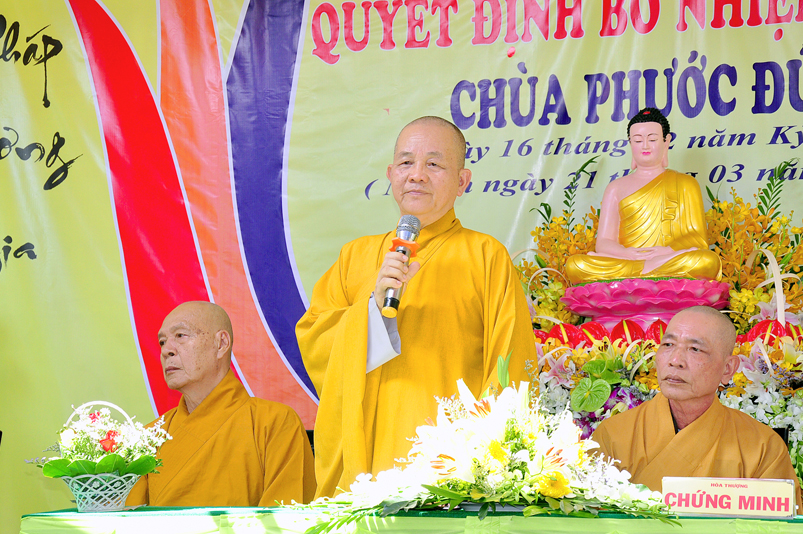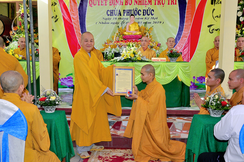 Thừa uỷ nhiệm của Thường trực BTS GHPGVN tỉnh Long An, ĐĐ. Thích Lệ Duyên – Chánh Thư ký BTS GHPGVN tỉnh Long An đã tuyên đọc Quyết định Bổ nhiệm trụ trì. Theo quyết định này, Bổ nhiệm Đại đức Thích Minh Anh, thế danh Nguyễn Anh Tuấn, sinh ngày 26/12/1981 tại huyện Tân Trụ, tỉnh Long An, chứng minh nhân dân số 301090547, cấp ngày 23/01/2013 tại Công an tỉnh Long An, chứng nhận Tăng Ni số 9782, cấp ngày 30/12/2002. Hộ khẩu thường trú tại số 29B, đường Nguyễn Trung Trực, thị trấn Tân Trụ, huyện Tân Trụ, tỉnh Long An giữ nhiệm vụ trụ trì Chùa Phước Đức, ấp Bình Hòa, xã Đức Tân, huyện Tân Trụ, tỉnh Long An.