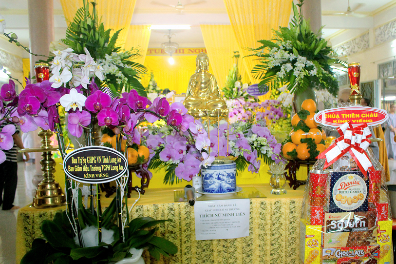 Thể hiện tâm thành, kính tiếc Bậc Ni Lưu đã hết mình vì Đạo pháp và Dân tộc, Chứng minh Ni giới tỉnh Long An, Phân ban Ni giới Phật giáo tỉnh nhà, quý Ni trưởng, Ni sư, đồng cung đối trước Giác linh đài dâng hương ai điếu, nhất tâm cầu nguyện giác linh Ni Trưởng cao đăng Phật quốc thượng phẩm thượng sanh, Đàm hoa tái hiện.