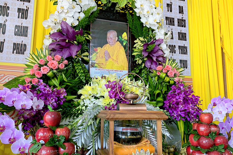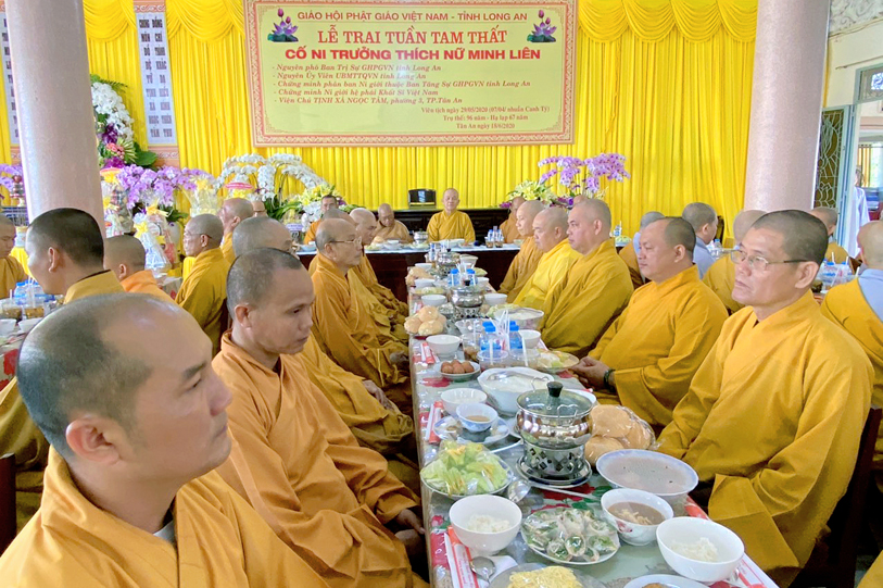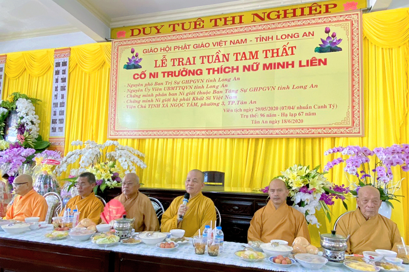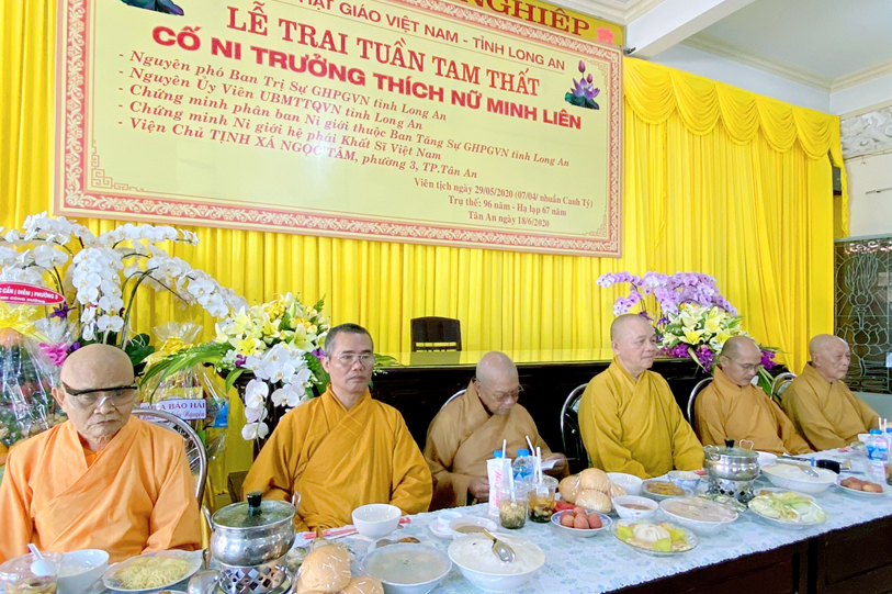 Để tưởng nhớ công hạnh sâu dày, phụng sự hoằng pháp, hạnh nguyện lợi tha và phạm hạnh tòng lâm của cố Ni trưởng Thích nữ Minh Liên – Nguyên Phó Trưởng Ban Trị Sự GHPG tỉnh Long An – Nguyên Ủy viên UBMTTQVN tỉnh Long An – Chứng minh Phân Ban Ni giới GHPGVN tỉnh Long An – Chứng minh Ni giới Hệ phái Khất sĩ Việt Nam – Viện chủ Tịnh xá Ngọc Tâm, phường 3, Tp. Tân An, Tỉnh Long An sáng ngày 18-6-2020 (nhằm ngày 27- tháng tư nhuận – năm Canh Tý) tại Tịnh xá Ngọc Tâm, môn đồ pháp quyến đã trang nghiêm tổ chức Lễ Tam thất cho Ân sư – cố Ni trưởng Thích nữ Minh Liên.