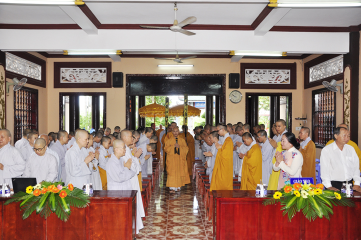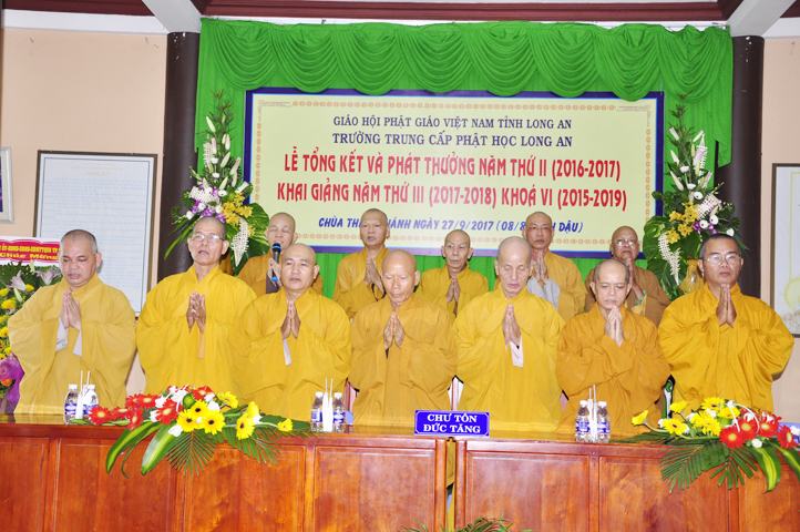 Đúng 8g30, Lễ Tổng kết và Khai giảng năm học mới chính thức bắt đầu, Đại đức Thích Lệ Trí – Chánh thư ký BTS GHPGVN – Phó hiệu trưởng Trường Trung cấp Phật học Long An điều phối chương trình, đại diện cung thỉnh chư Tôn đức Giáo phẩm, các cấp chính quyền, Ban bảo trợ thân lâm hội trường chứng minh.