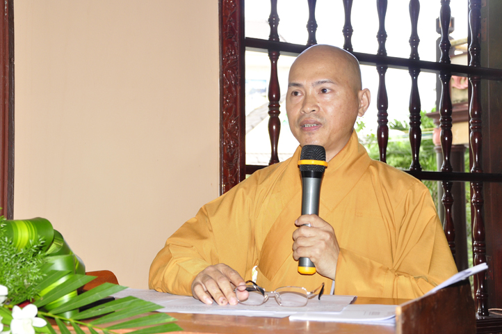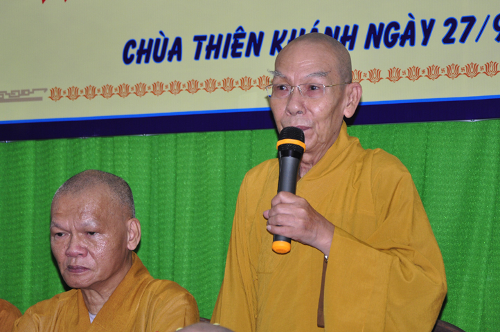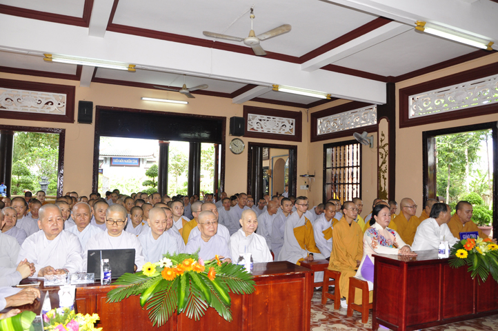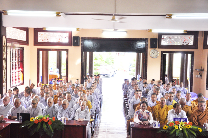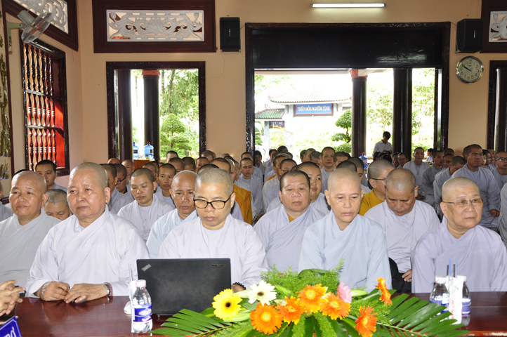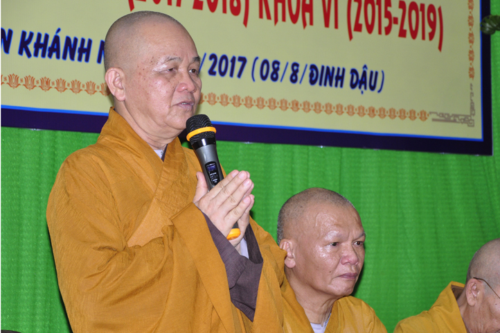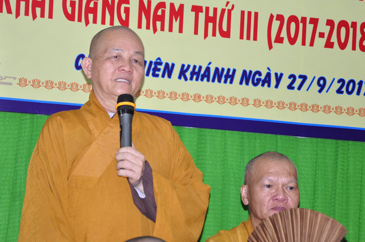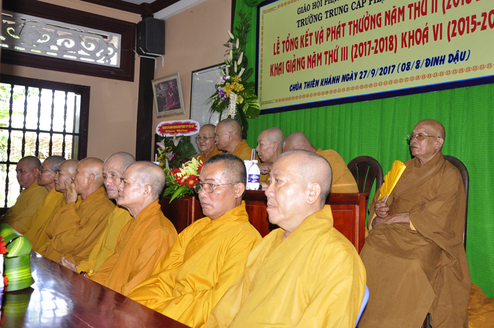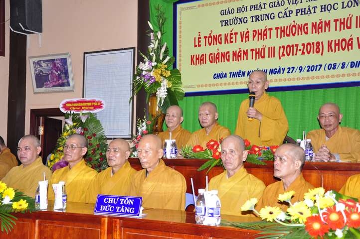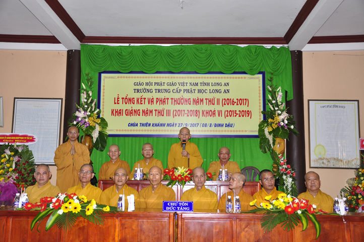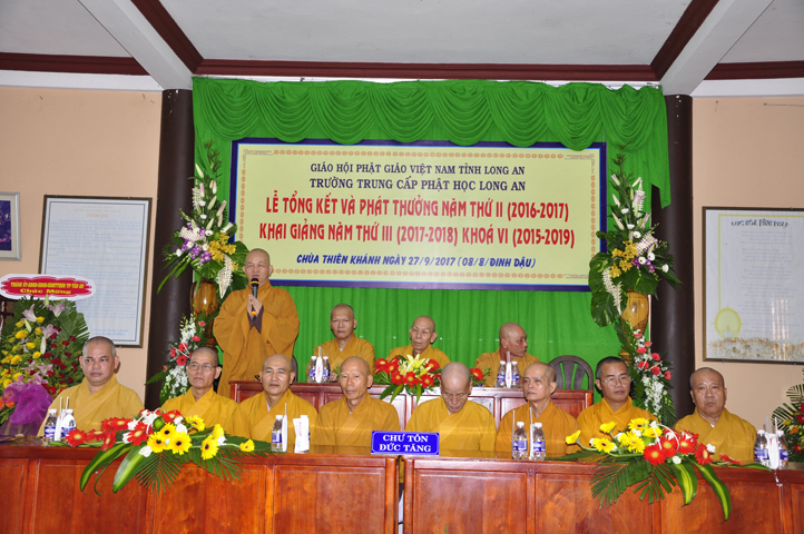 Tiếp đó, Ban tổ chức cung thỉnh HT. Thích Thiện Đức – UVHĐTSTW, Giáo phẩm chứng minh ban đạo từ cho buổi Lễ Tổng kết và Khai giảng năm học mới. Hòa thượng đã nhấn mạnh “Giáo dục là quốc sách hàng đầu của Phật giáo”. Giáo dục có ba cấp: “Giáo dục nội tự, giáo dục học đường, giáo dục xã hội”. Trong ba cấp giáo dục này, Giáo dục nội tự chính là nền tảng đầu tiên cho các Tăng Ni sinh có được định hướng tốt cho mình trước khi bước vào giai đoạn giáo dục học đường.