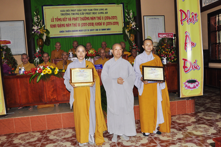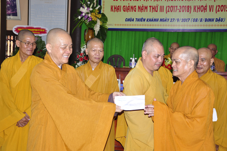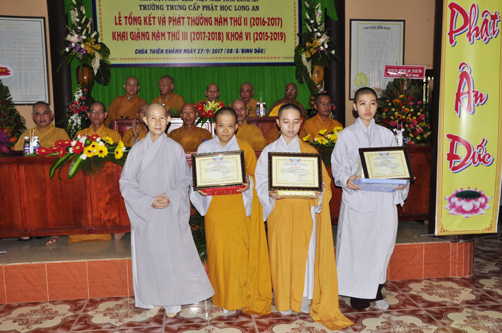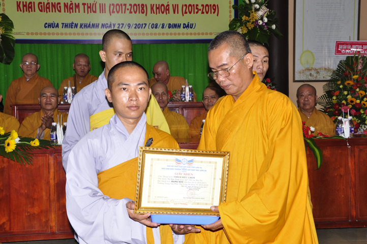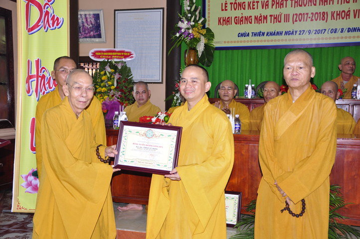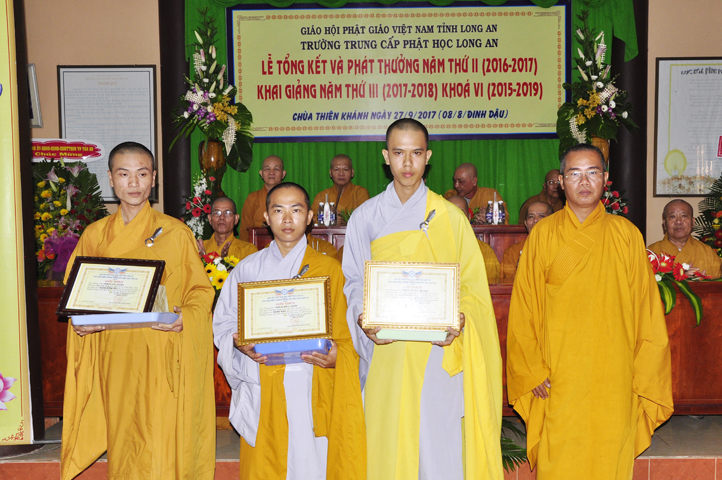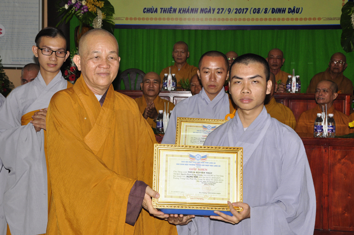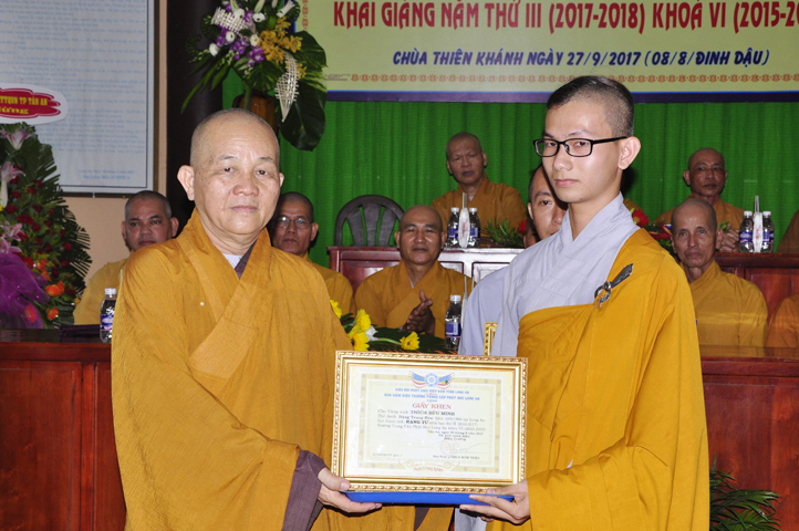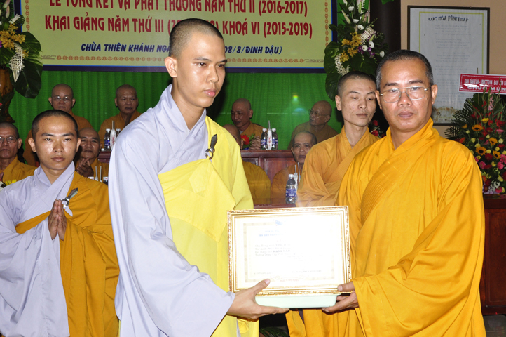 Vinh danh và khích lệ các Tăng Ni sinh học tập tốt, Ban Giám hiệu đã dành 6 phần thưởng xuất sắc và hạnh kiểm cho các Tăng sinh tại cơ sở 1 như: Ts.Tâm Thành (hạng nhất), Ts. Nguyên Phát (hạng nhì), các hạng tiếp theo là: Bửu Minh, Thiện Quang, Đức Chơn, Thiện Hưng, do HT. Hiệu trưởng Thích Minh Thiện và TT. Thích Minh Thọ trao tặng.