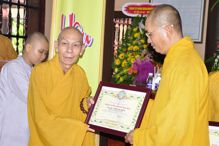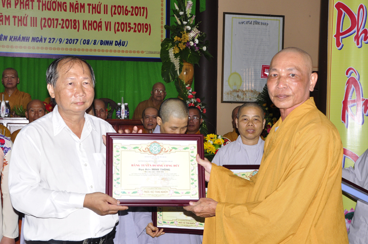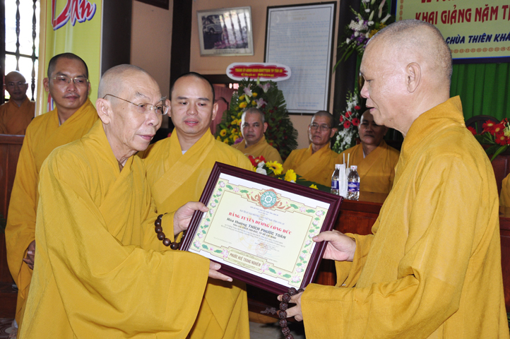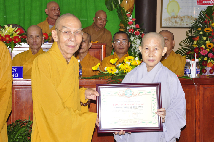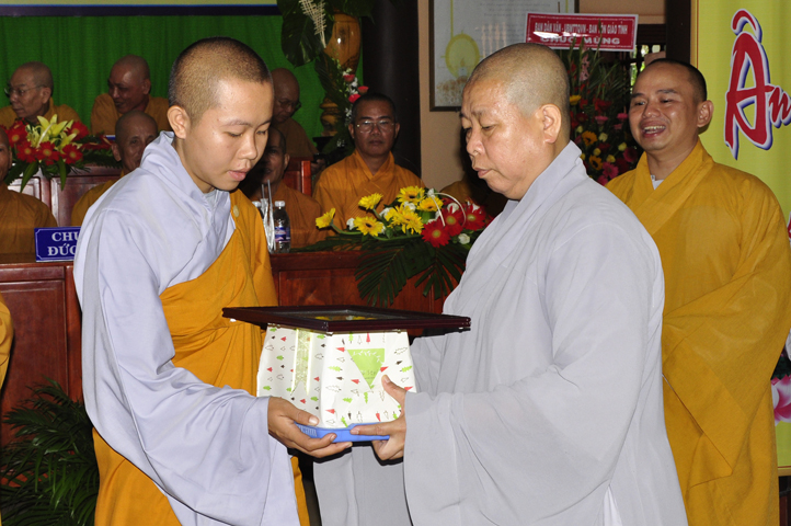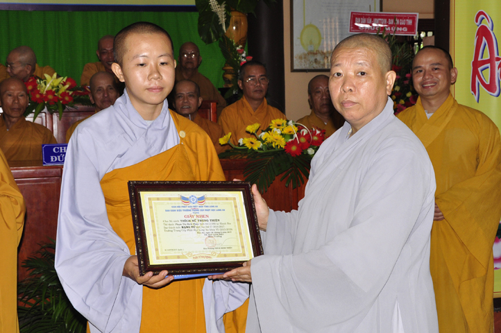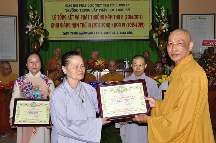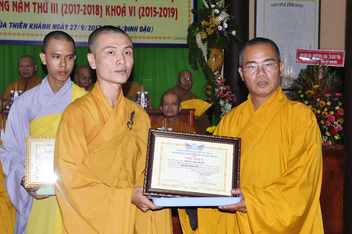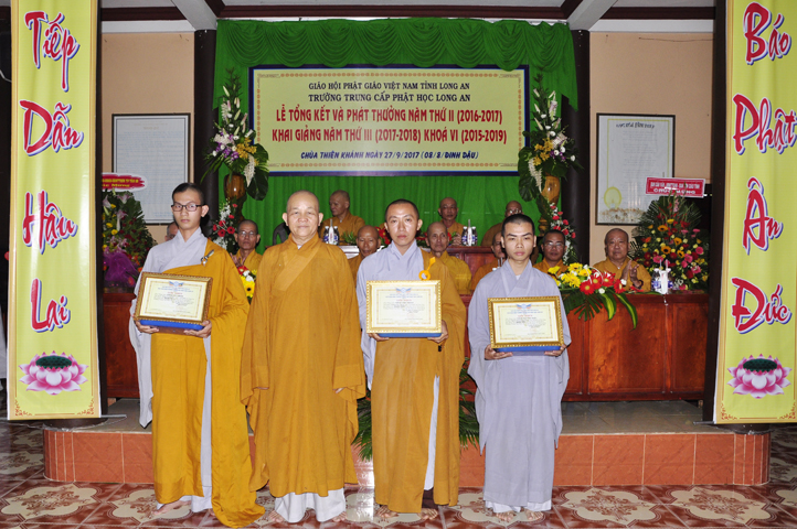 Vinh danh và khích lệ các Tăng Ni sinh học tập tốt, Ban Giám hiệu đã dành 6 phần thưởng xuất sắc và hạnh kiểm cho các Tăng sinh tại cơ sở 1 như: Ts.Tâm Thành (hạng nhất), Ts. Nguyên Phát (hạng nhì), các hạng tiếp theo là: Bửu Minh, Thiện Quang, Đức Chơn, Thiện Hưng, do HT. Hiệu trưởng Thích Minh Thiện và TT. Thích Minh Thọ trao tặng.