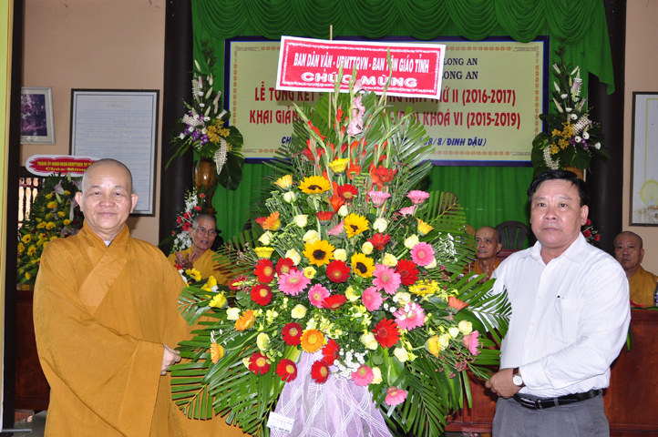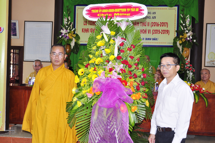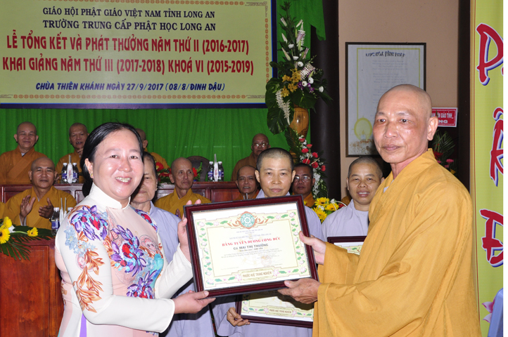 Nhân buổi lễ này, Bà Phạm Ngọc Tiệp- PCT Mặt trận Tổ quốc VN tỉnh Long An có lời phát biểu chúc mừng. Trước những thành quả tốt đẹp trong công tác đào tạo giáo dục mà chư Tôn đức Giám hiệu Trường Trung Cấp Phật học Tỉnh Long An đã đạt được, vị Đại diện các cấp chính quyền đã bày tỏ niềm hân hoan phấn khởi. Bà hy vọng Phật giáo Long An luôn duy trì phương hướng giáo dục đào tạo Tăng tài tốt đẹp này để góp phần làm tốt các công tác Phật sự tương quan.