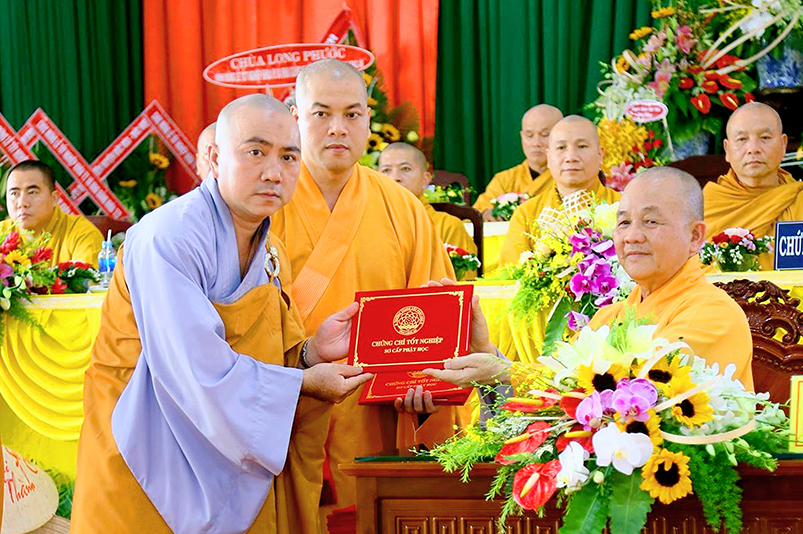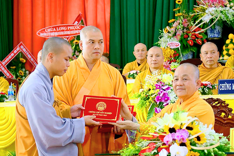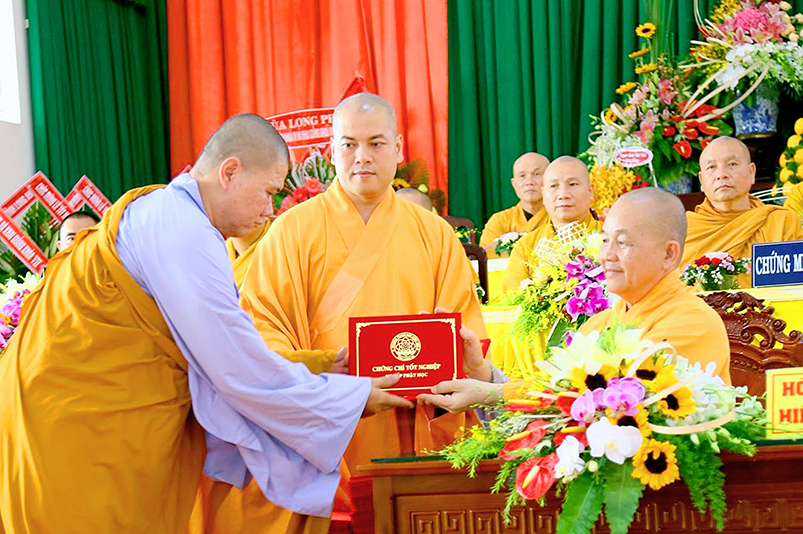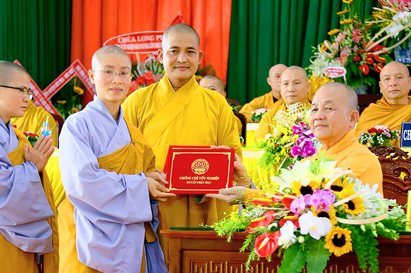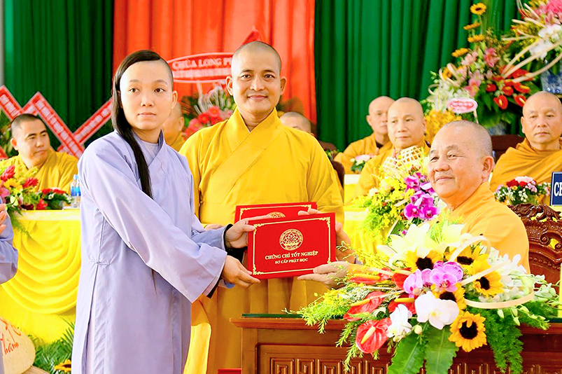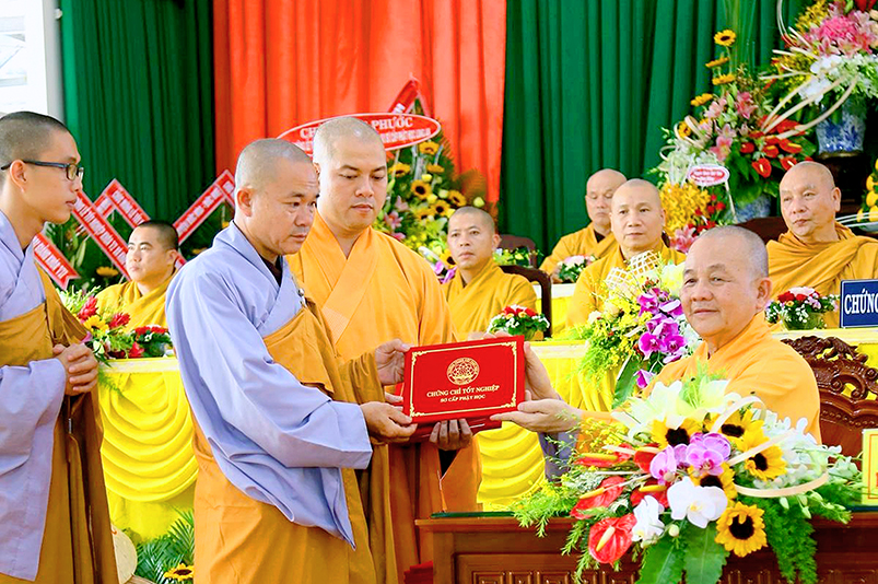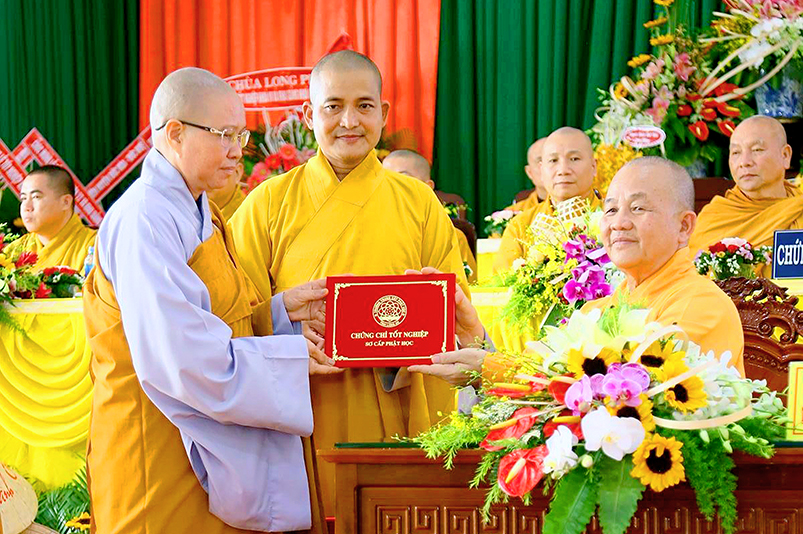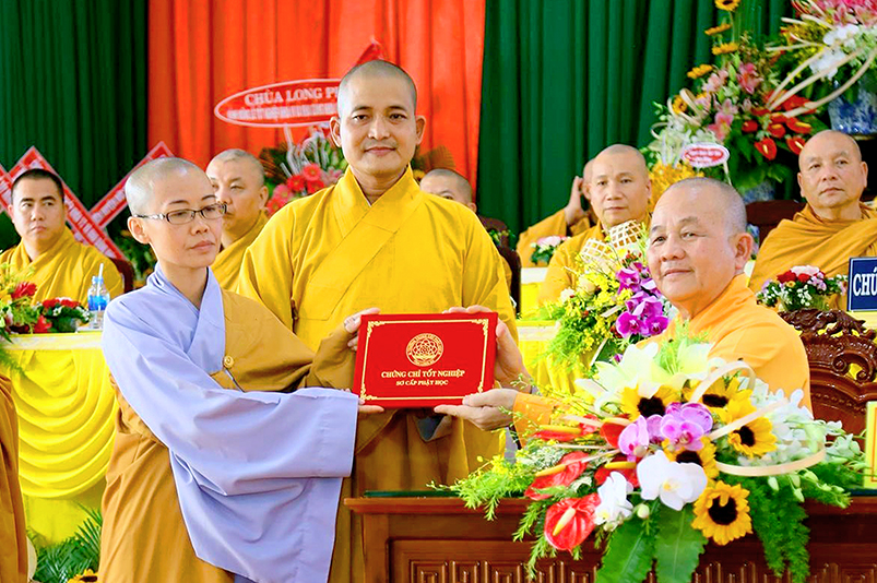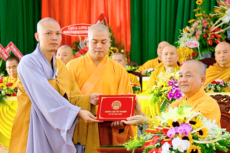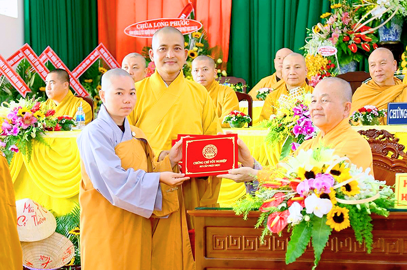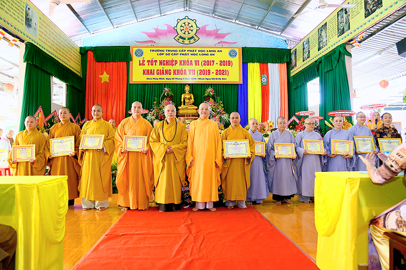 HT. Thích Minh Thiện: Hiệu Trưởng Trường Sơ Trung cấp Phật học Long An trao chứng chỉ tốt nghiệp cho các em tăng ni sinh sau những năm miệt mài đèn sách.