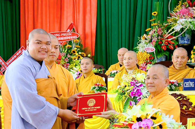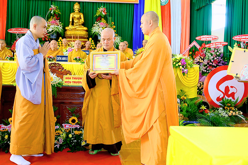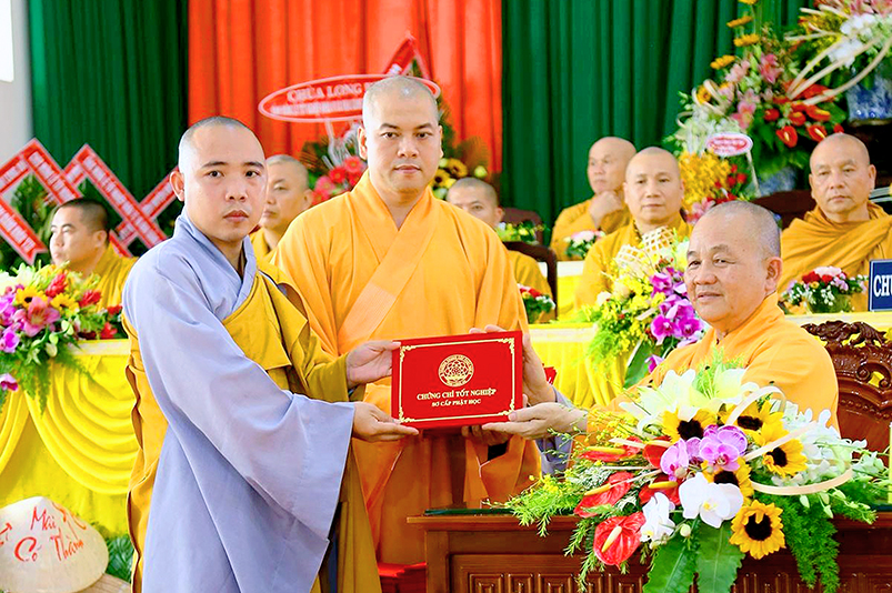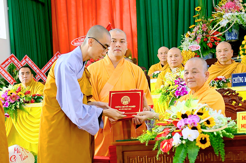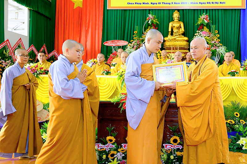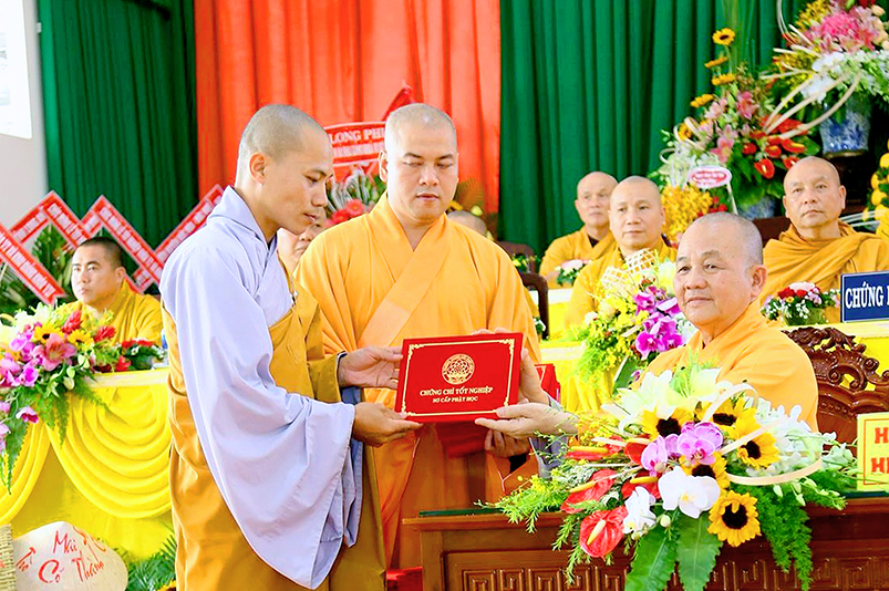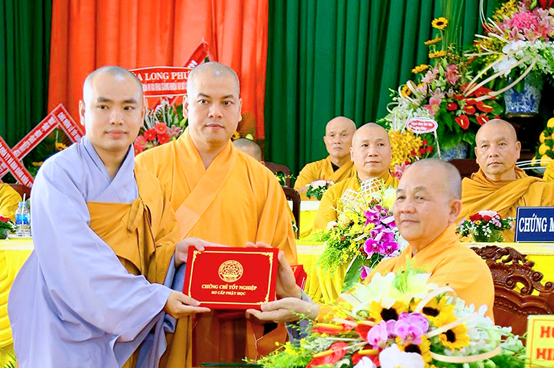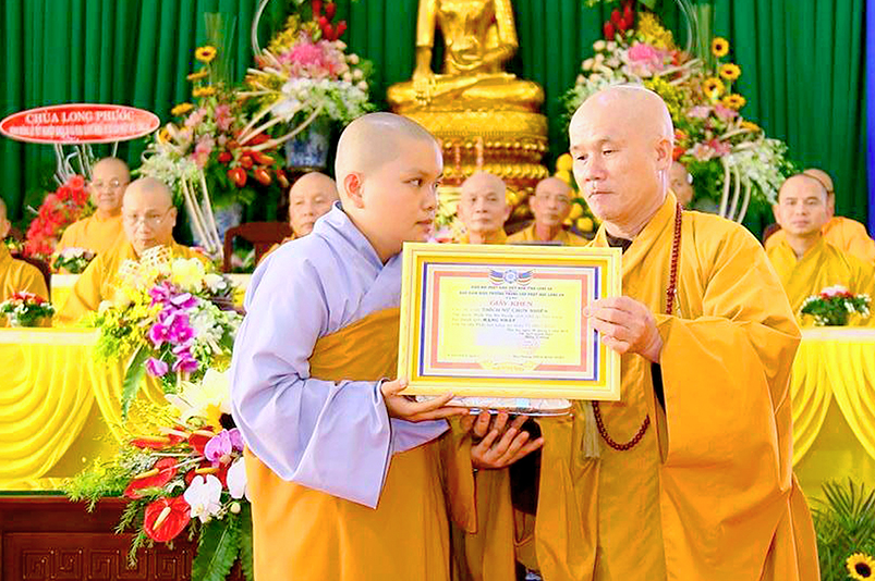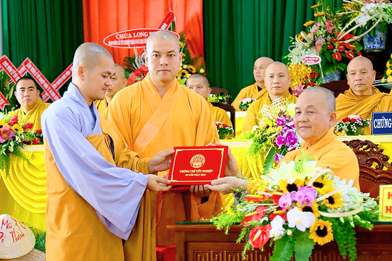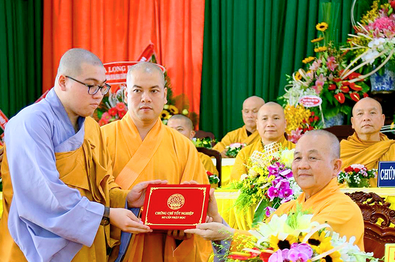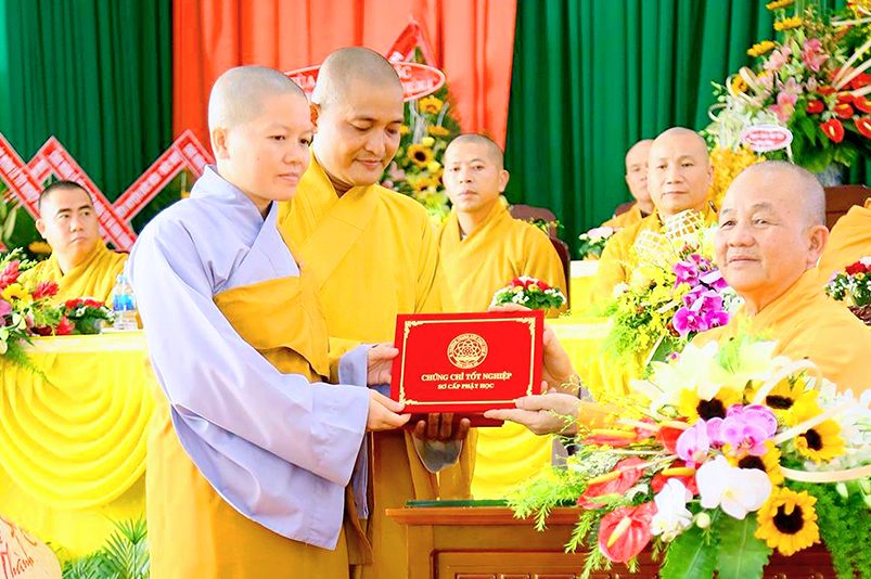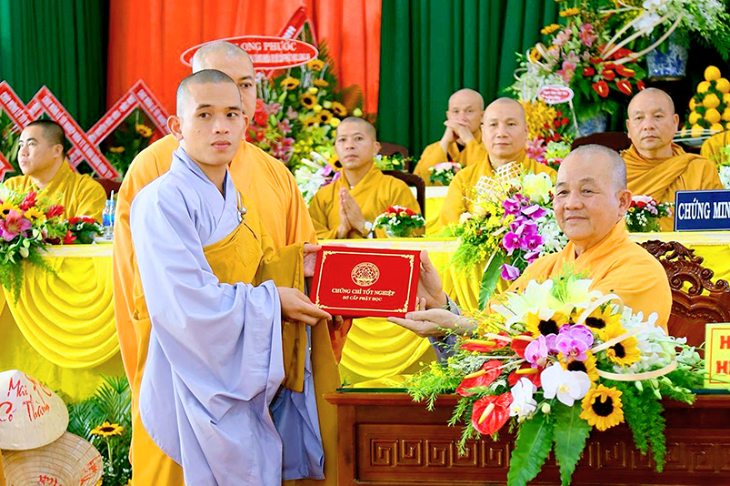 HT. Thích Minh Thiện: Hiệu Trưởng Trường Sơ Trung cấp Phật học Long An trao chứng chỉ tốt nghiệp cho các em tăng ni sinh sau những năm miệt mài đèn sách.