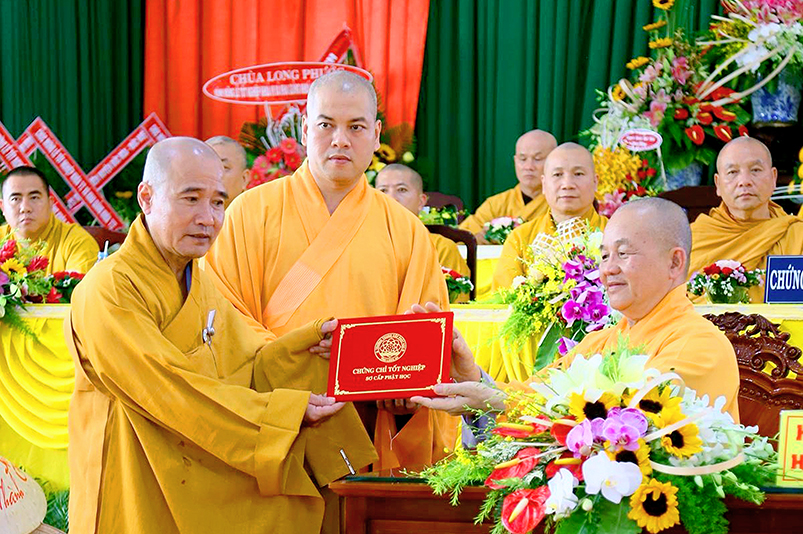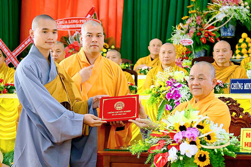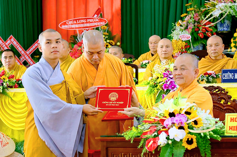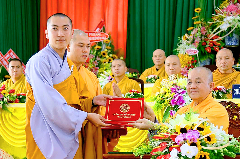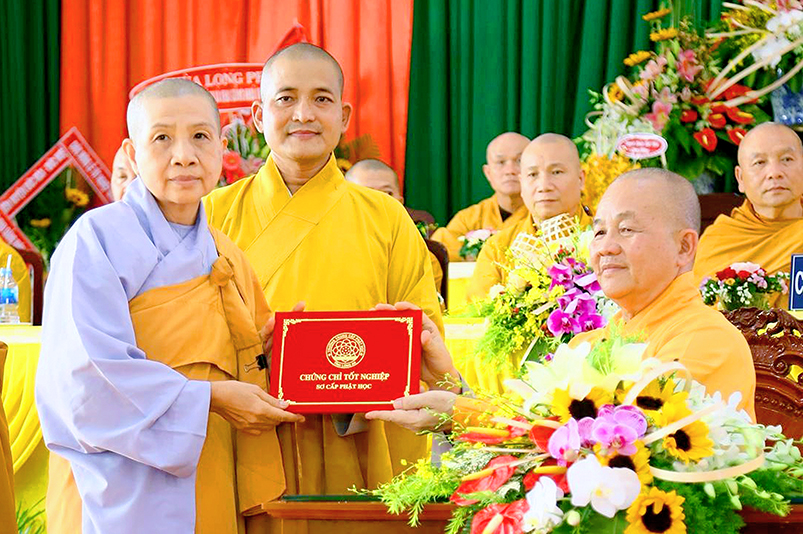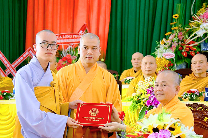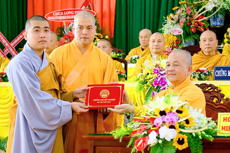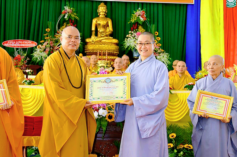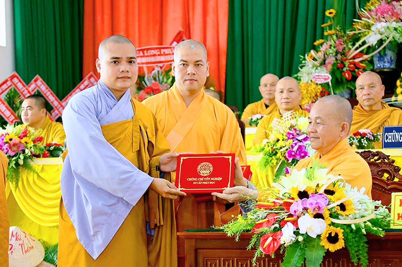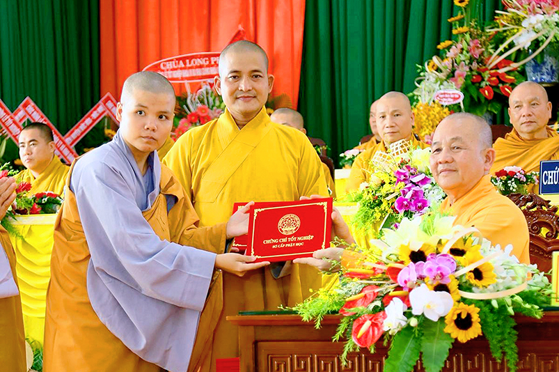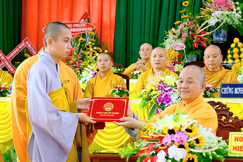 HT. Thích Minh Thiện: Hiệu Trưởng Trường Sơ Trung cấp Phật học Long An trao chứng chỉ tốt nghiệp cho các em tăng ni sinh sau những năm miệt mài đèn sách.