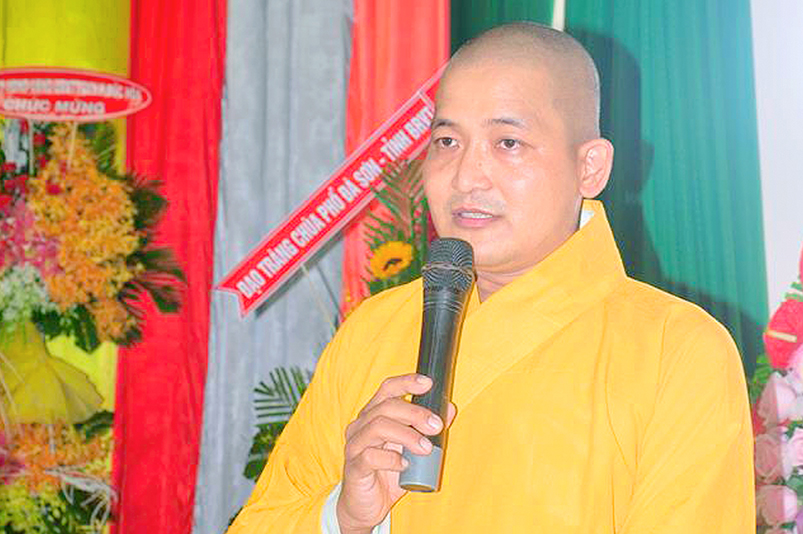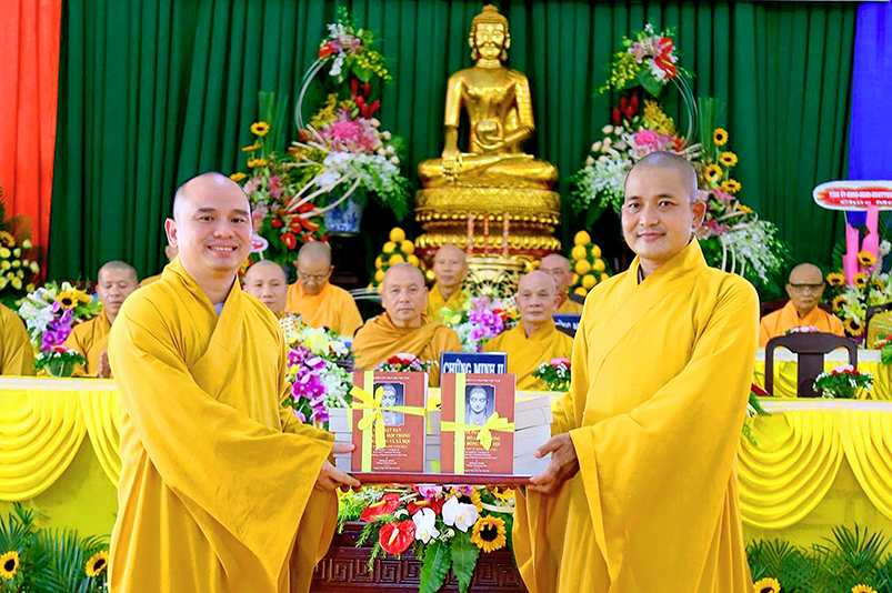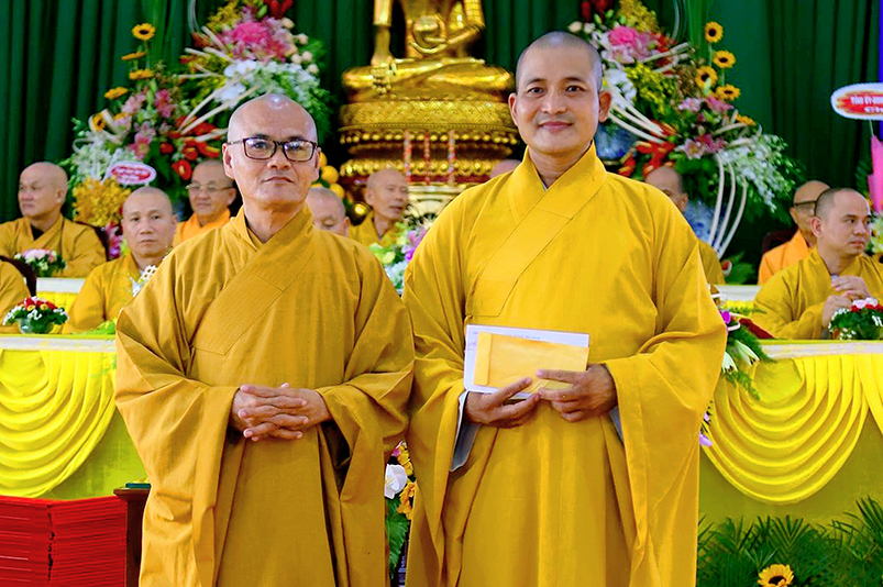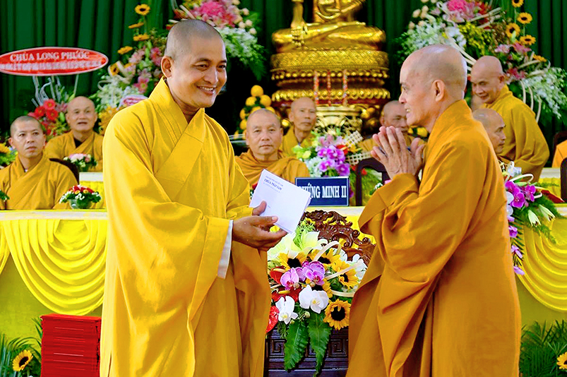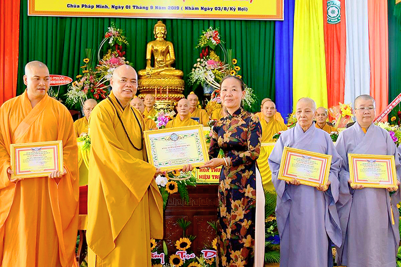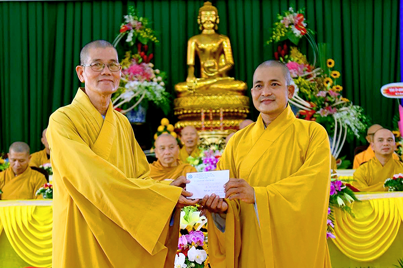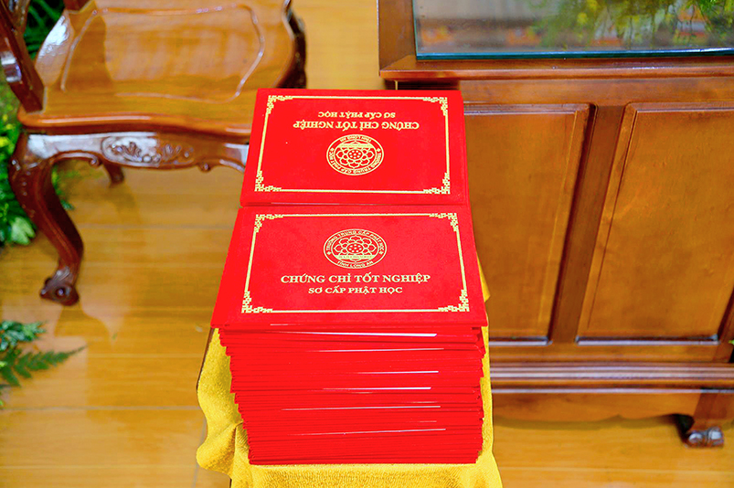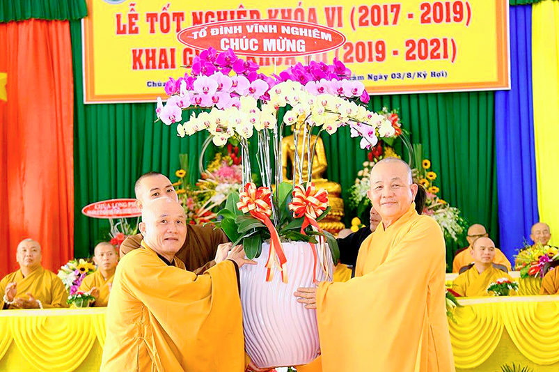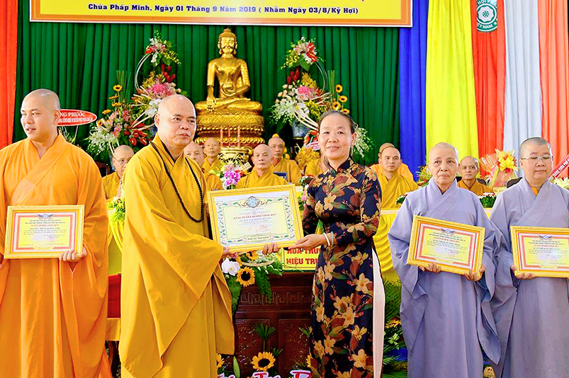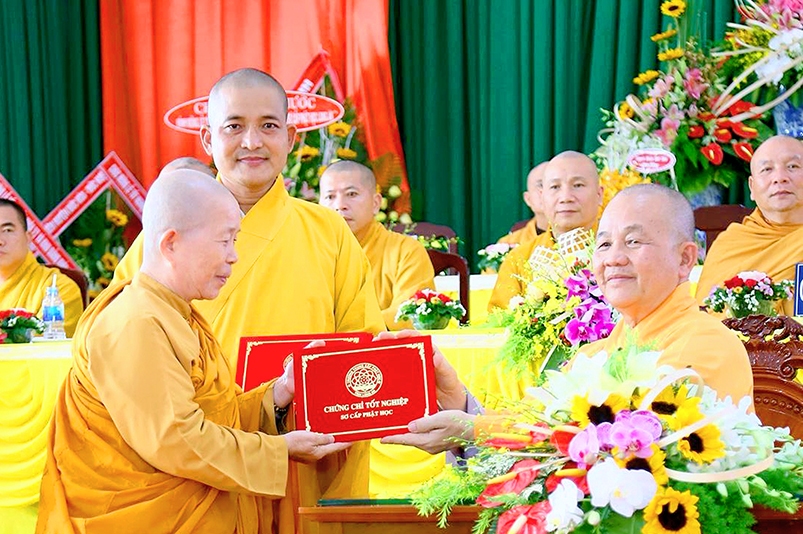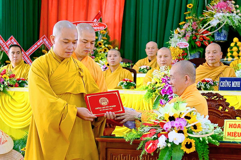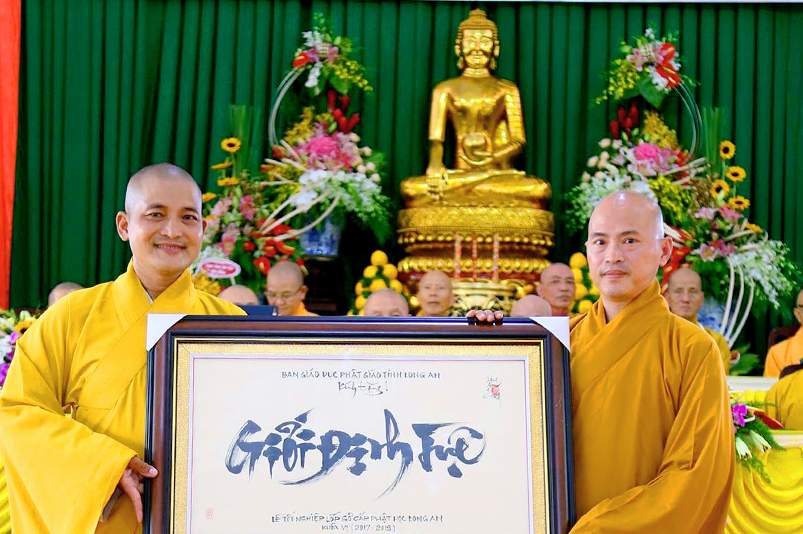 HT. Thích Minh Thiện: Hiệu Trưởng Trường Sơ Trung cấp Phật học Long An trao chứng chỉ tốt nghiệp cho các em tăng ni sinh sau những năm miệt mài đèn sách.