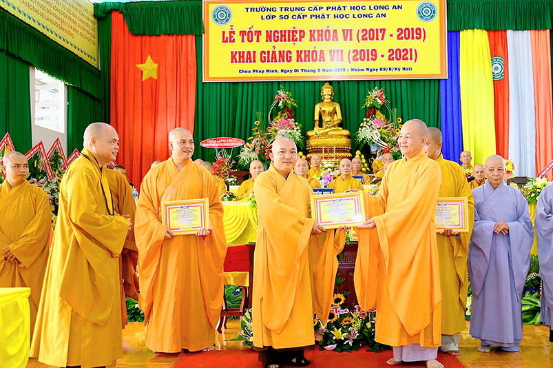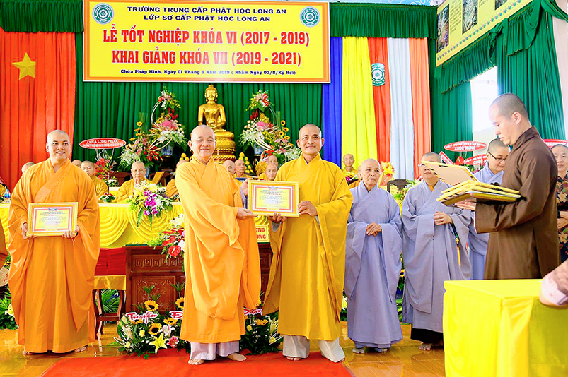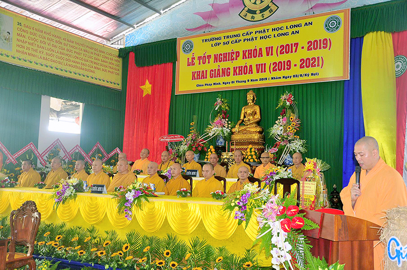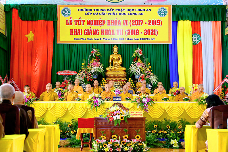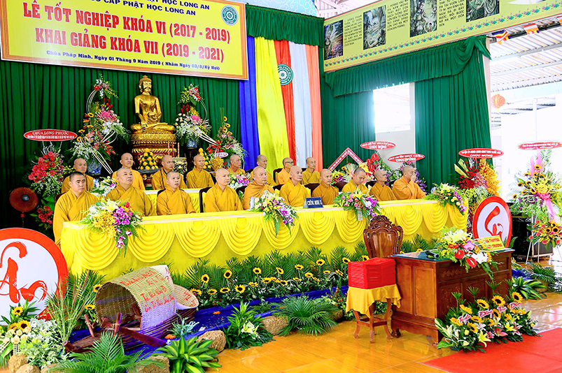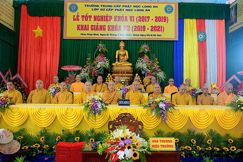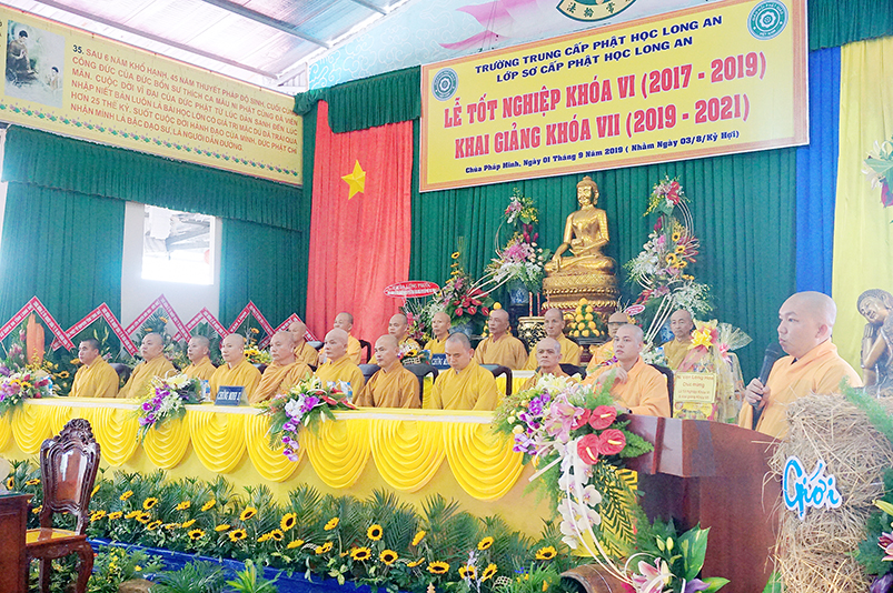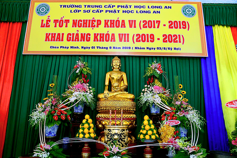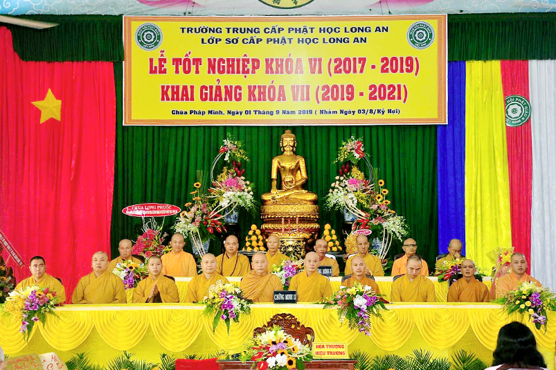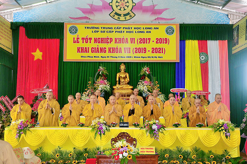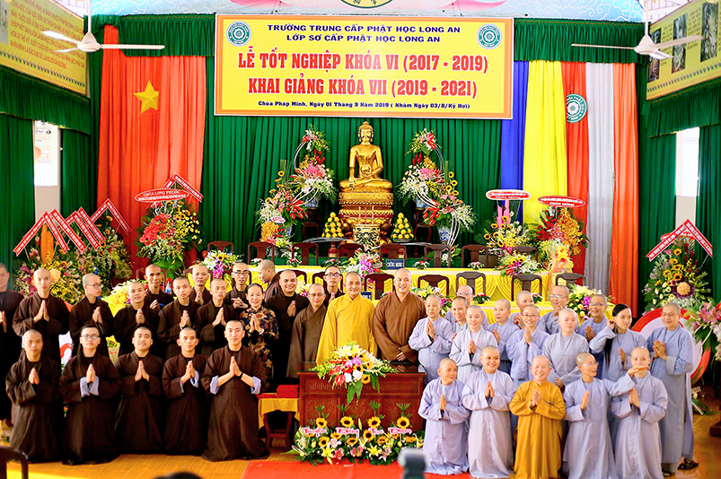 Sáng ngày 01/09/2019, tại chùa Pháp Minh ( ấp Giồng Lớn, xã Mỹ Hạnh Nam, tỉnh Long An), Ban Giám hiệu Trường Trung cấp Phật học tỉnh Long An trọng thể tổ chức lễ Tốt nghiệp lớp Sơ Cấp Phật học khóa VI, Khai giảng khóa VII (2019 – 2021) lớp sơ cấp Phật học.