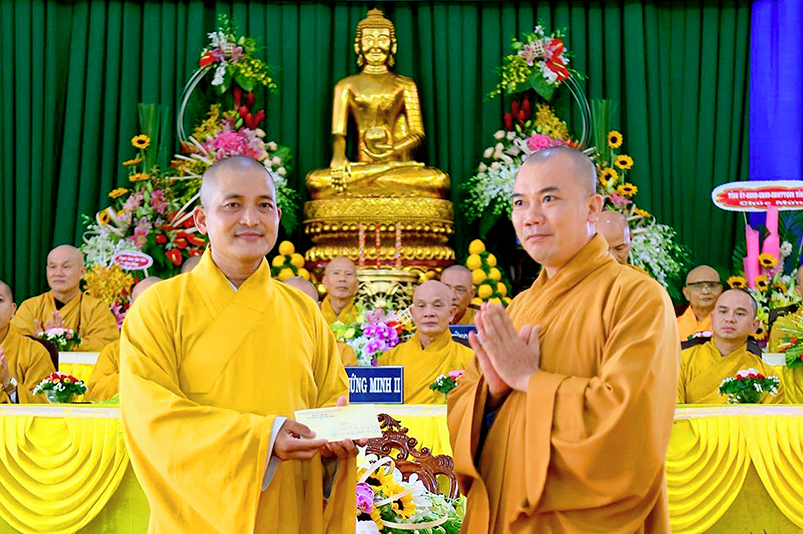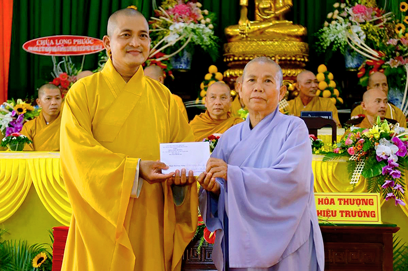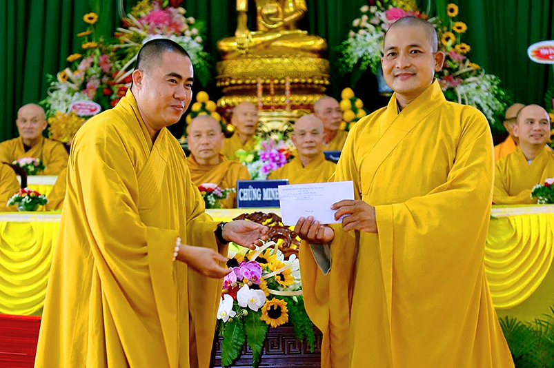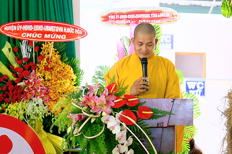 Tại buổi lễ, Ban Tổ chức đón nhận nhiều lẵng hoa, phần quà, tịnh tài… chúc mừng của Chư Tôn đức, Ban Trị sự tỉnh, Ban Tôn giáo tỉnh tỉnh Long An, UB MTTQVN tỉnh và BTS GHPGVN các huyện thị thành…