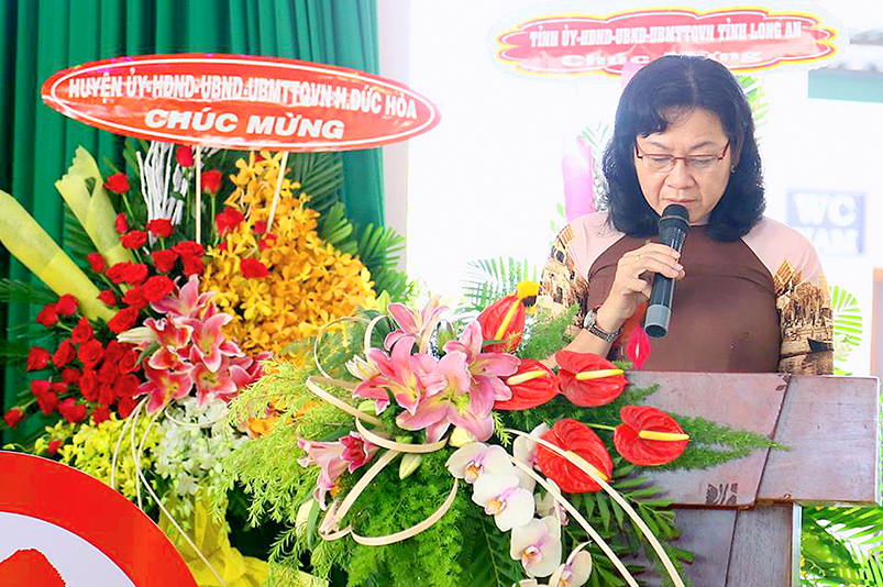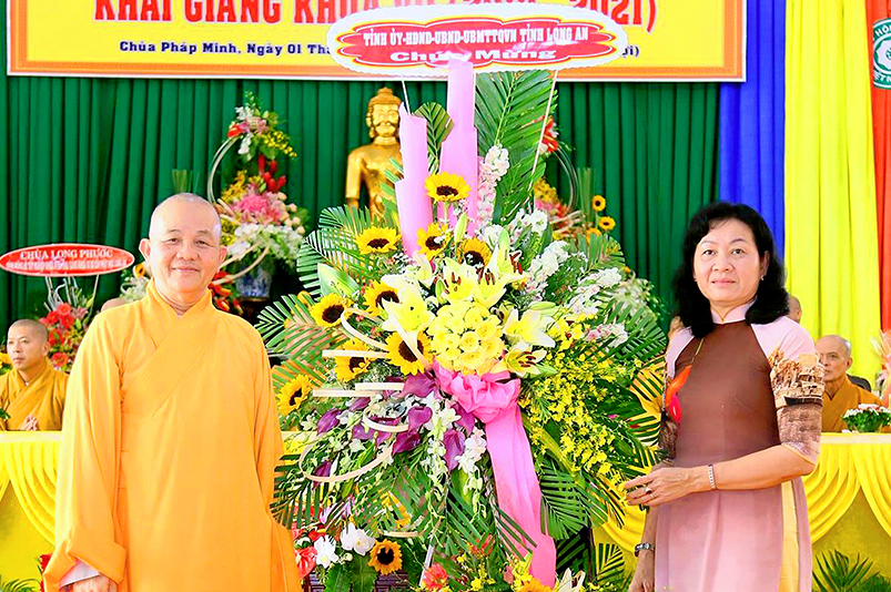 Đại diện các vị lãnh đạo chính quyền Bà Phạm Ngọc Tiệp, Phó chủ tịch UBMTTQVN tỉnh Long An, phát biểu chúc mừng lễ tốt nghiệp và khen tặng việc đào tạo giáo dục Tăng tài của Phật giáo tỉnh nhà có những thành tựu đáng kể.