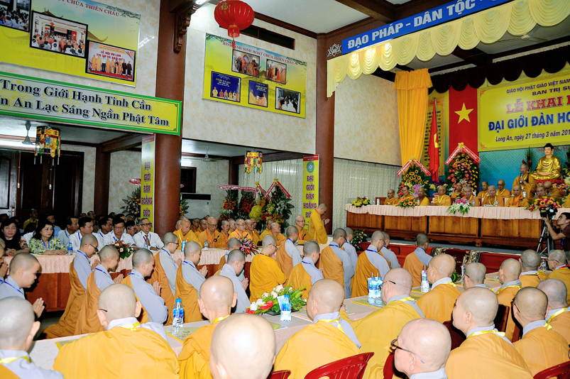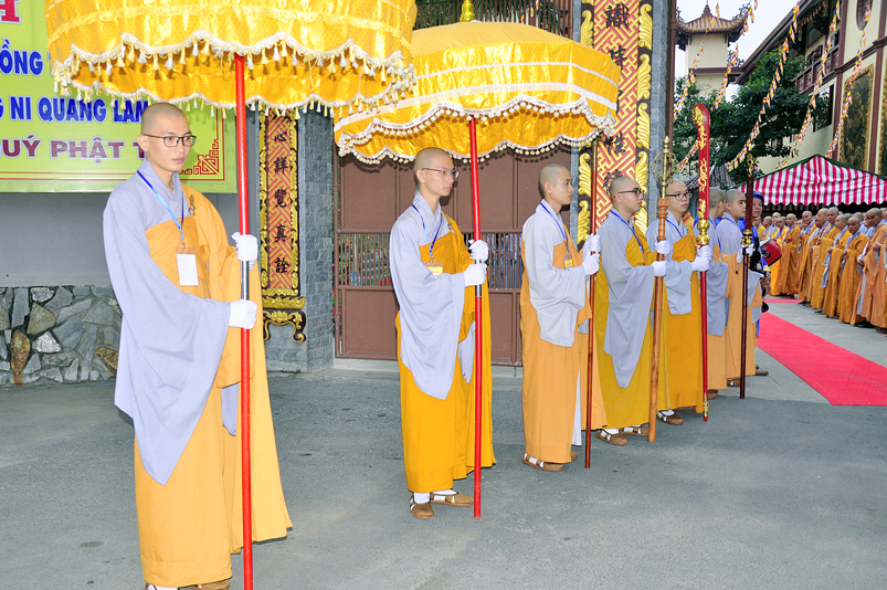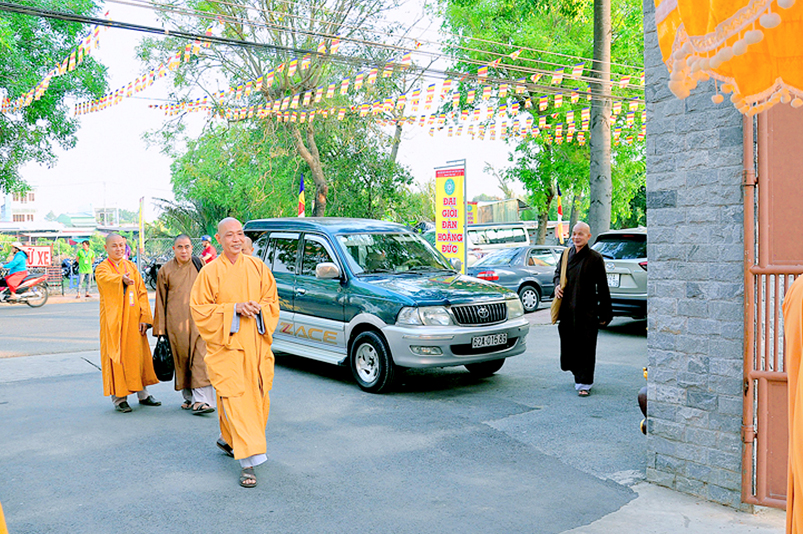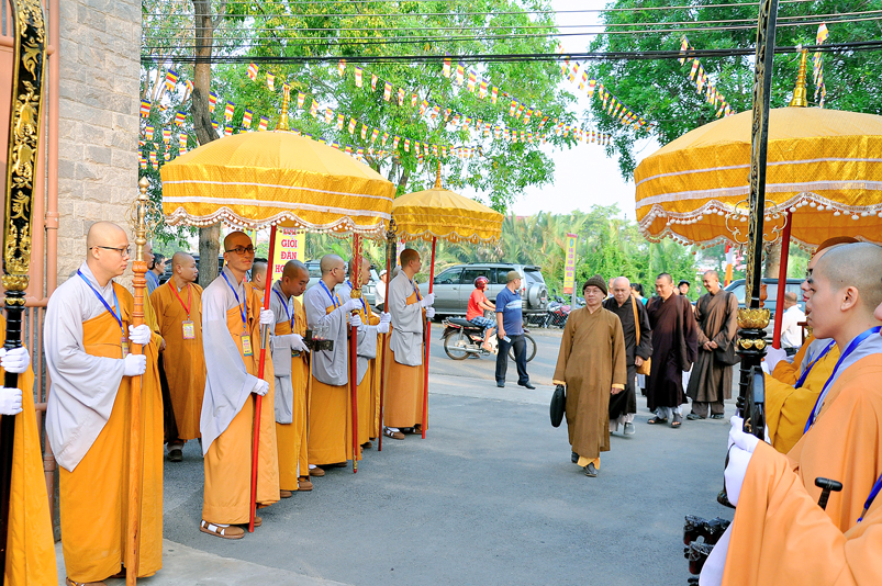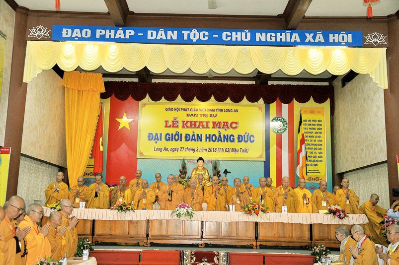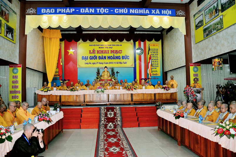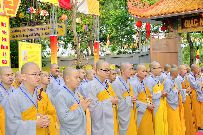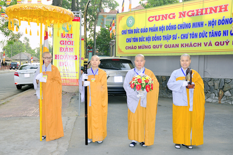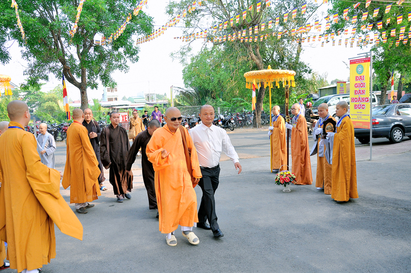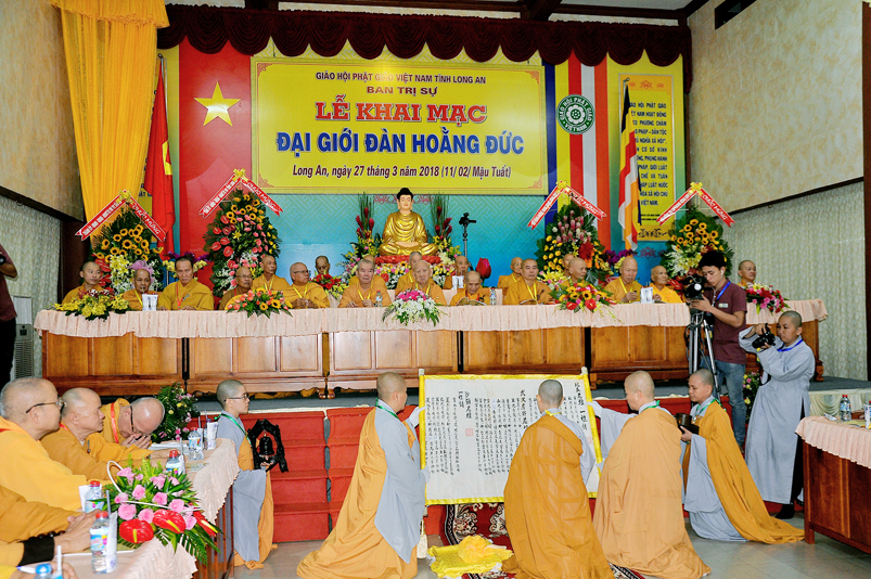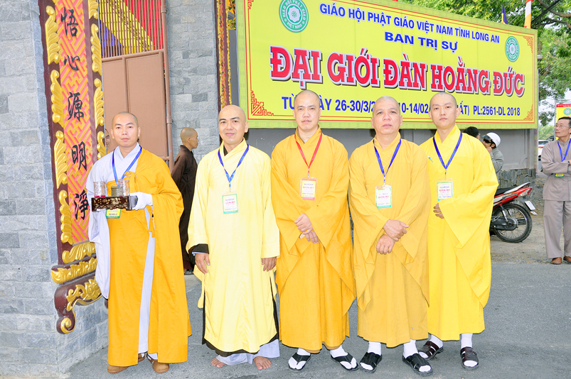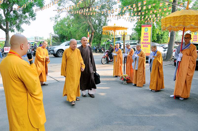 Vào lúc 7g, Ban Tổ chức đã trang nghiêm đàn tràng với hơn 800 giới tử nhất tâm cung đón chư Tôn đức Giáo phẩm TW, thành phố Hồ Chí Minh, chư Tôn đức Giáo phẩm tỉnh Long An, chư Tôn đức tỉnh thành bạn, chư Tôn đức Trưởng ban Trị sự liên huyện, chư Tôn đức trụ trì các tự viện trong và ngoài tỉnh, quý vị khách quý lãnh đạo các cấp chính quyền tỉnh quang lâm chứng dự Đại Giới Đàn.