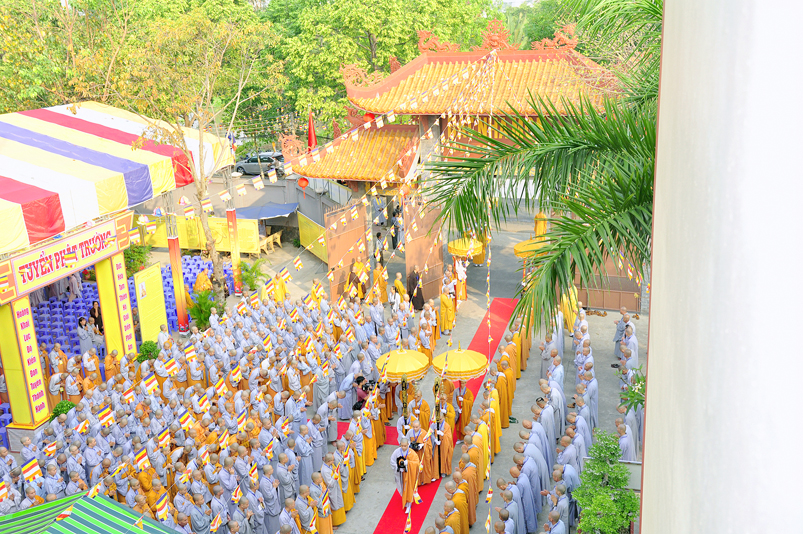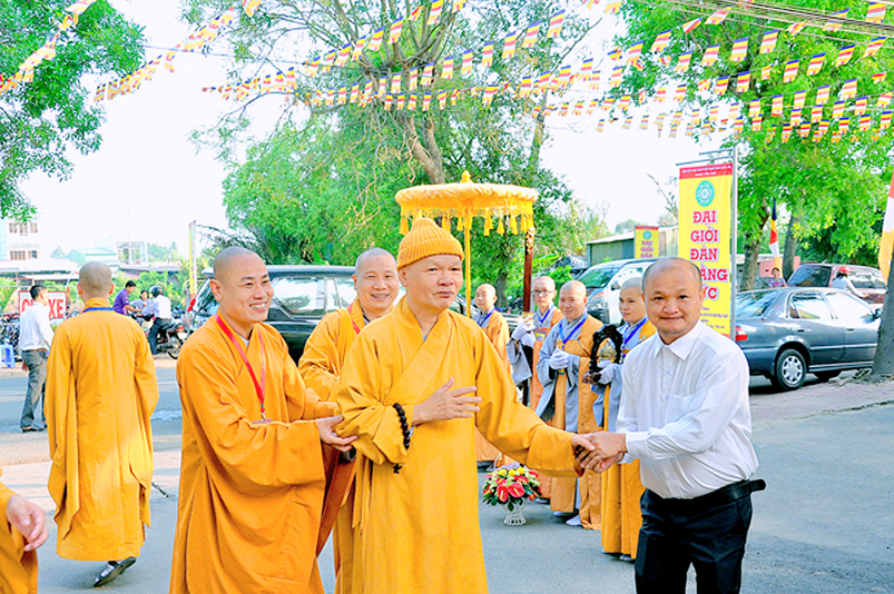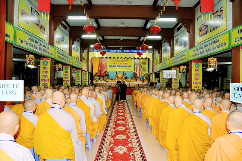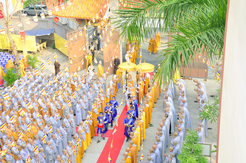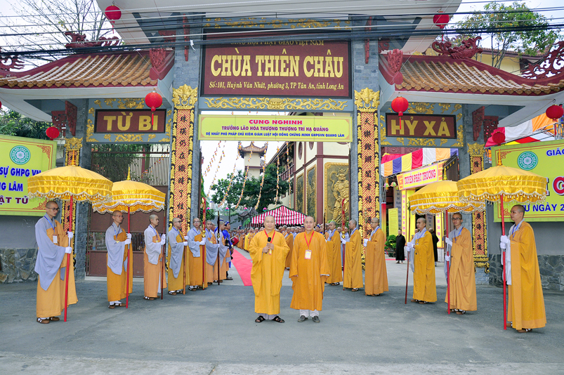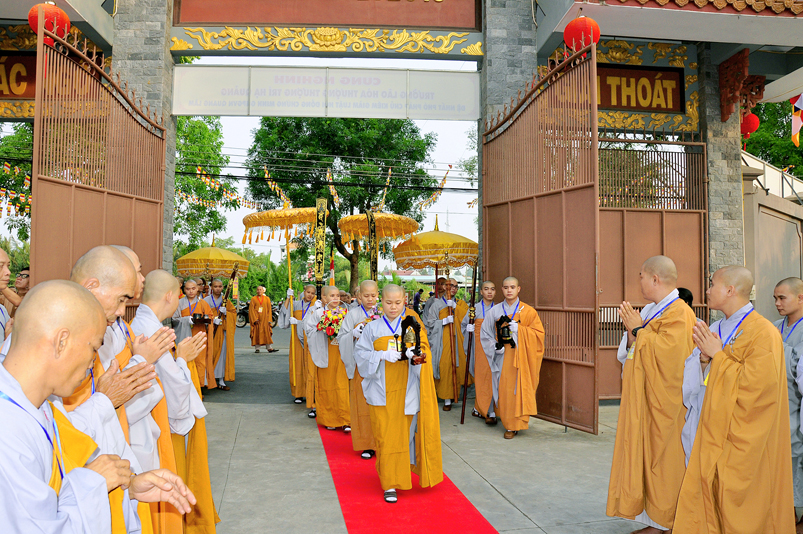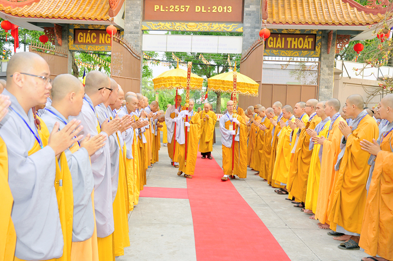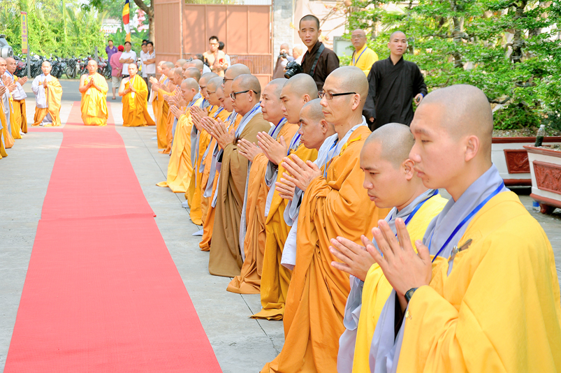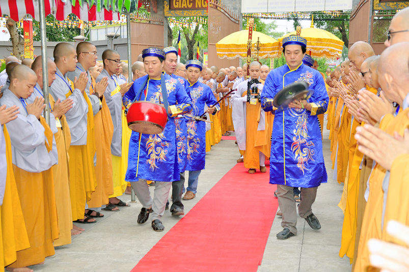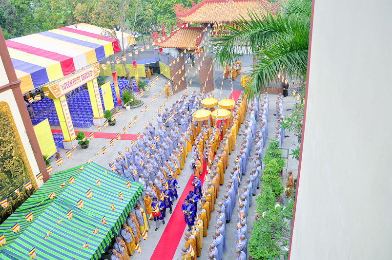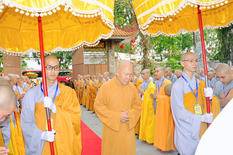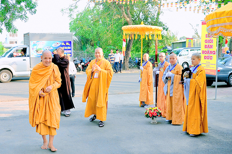 Vào lúc 7g, Ban Tổ chức đã trang nghiêm đàn tràng với hơn 800 giới tử nhất tâm cung đón chư Tôn đức Giáo phẩm TW, thành phố Hồ Chí Minh, chư Tôn đức Giáo phẩm tỉnh Long An, chư Tôn đức tỉnh thành bạn, chư Tôn đức Trưởng ban Trị sự liên huyện, chư Tôn đức trụ trì các tự viện trong và ngoài tỉnh, quý vị khách quý lãnh đạo các cấp chính quyền tỉnh quang lâm chứng dự Đại Giới Đàn.