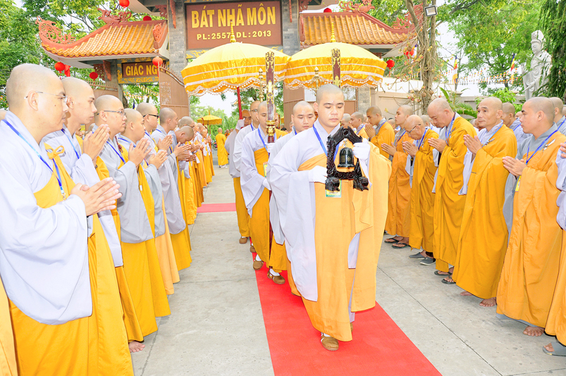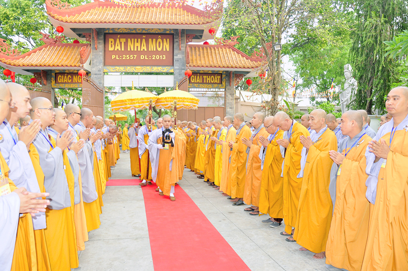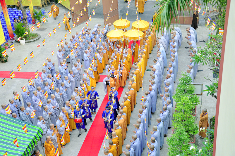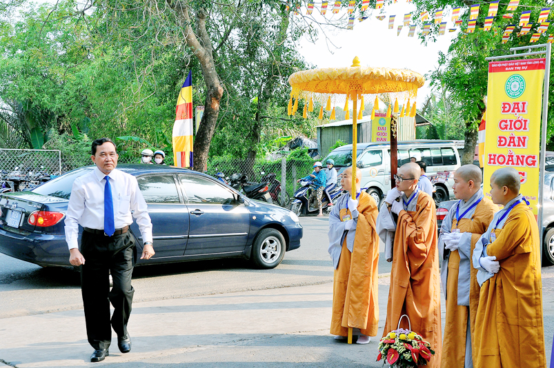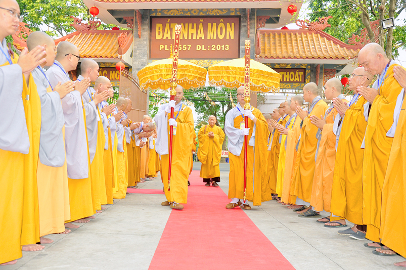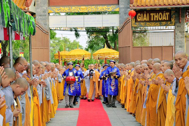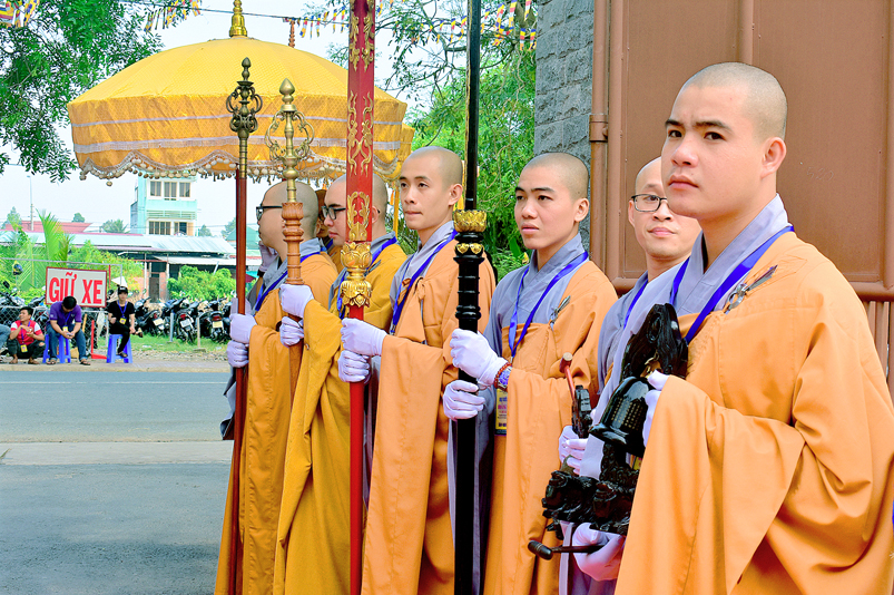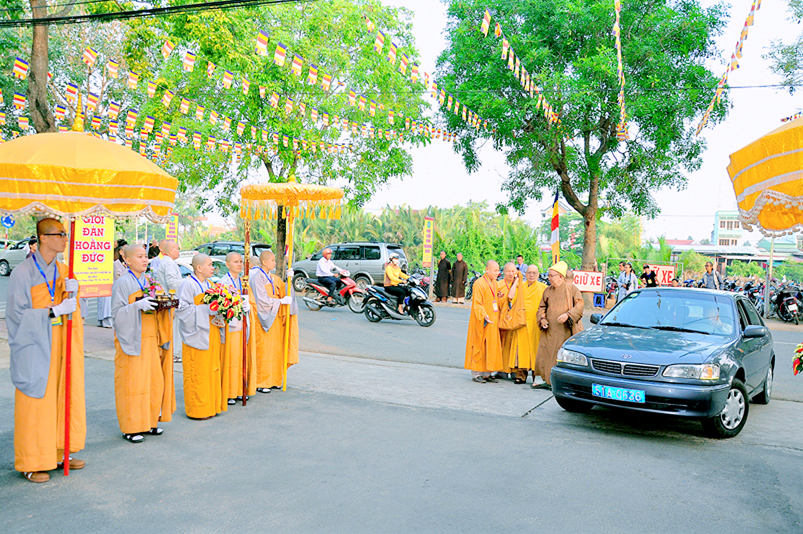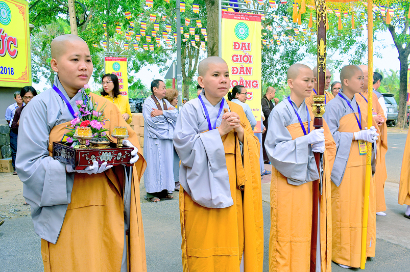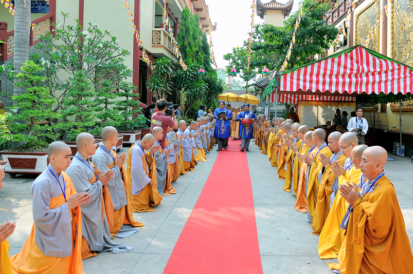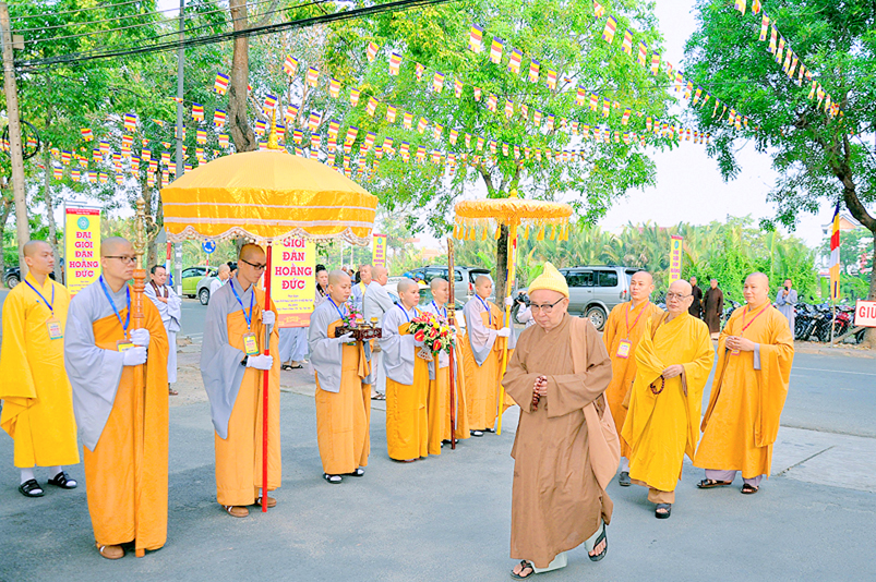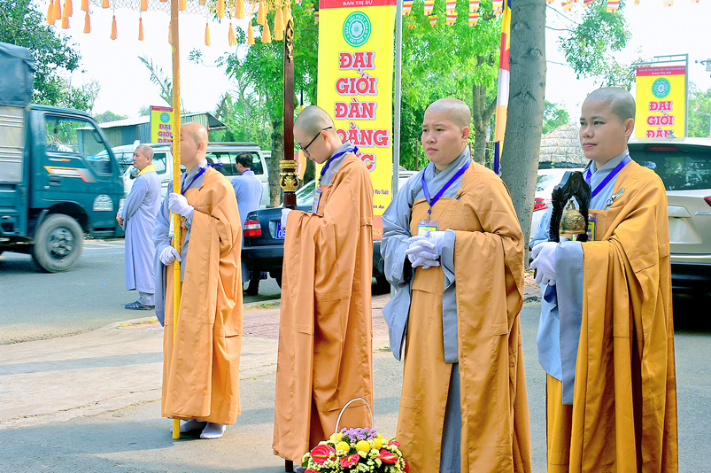Vào lúc 7g, Ban Tổ chức đã trang nghiêm đàn tràng với hơn 800 giới tử nhất tâm cung đón chư Tôn đức Giáo phẩm TW, thành phố Hồ Chí Minh, chư Tôn đức Giáo phẩm tỉnh Long An, chư Tôn đức tỉnh thành bạn, chư Tôn đức Trưởng ban Trị sự liên huyện, chư Tôn đức trụ trì các tự viện trong và ngoài tỉnh, quý vị khách quý lãnh đạo các cấp chính quyền tỉnh quang lâm chứng dự Đại Giới Đàn.