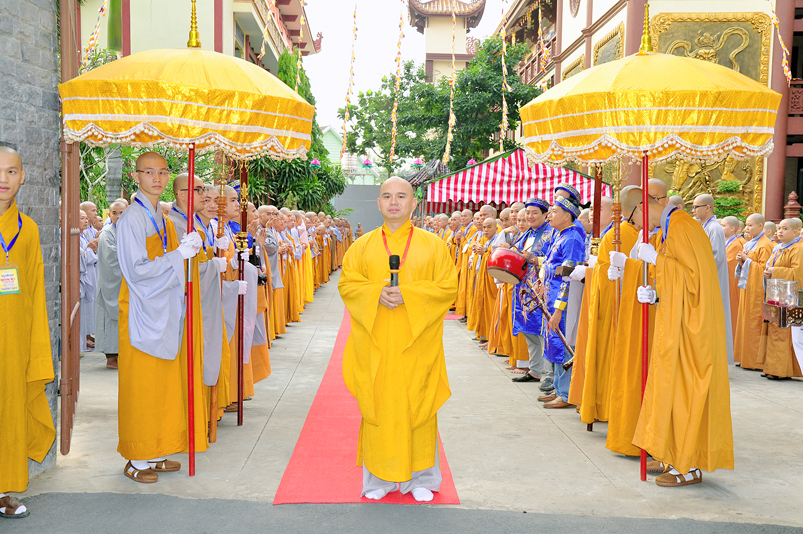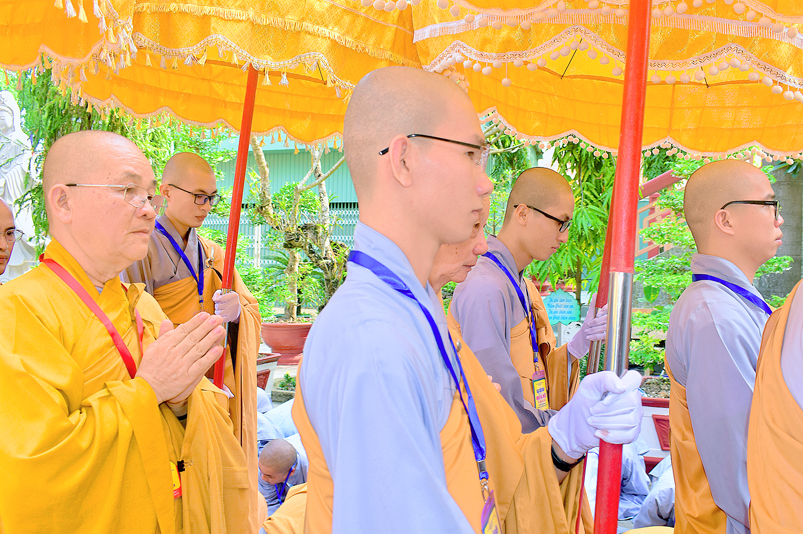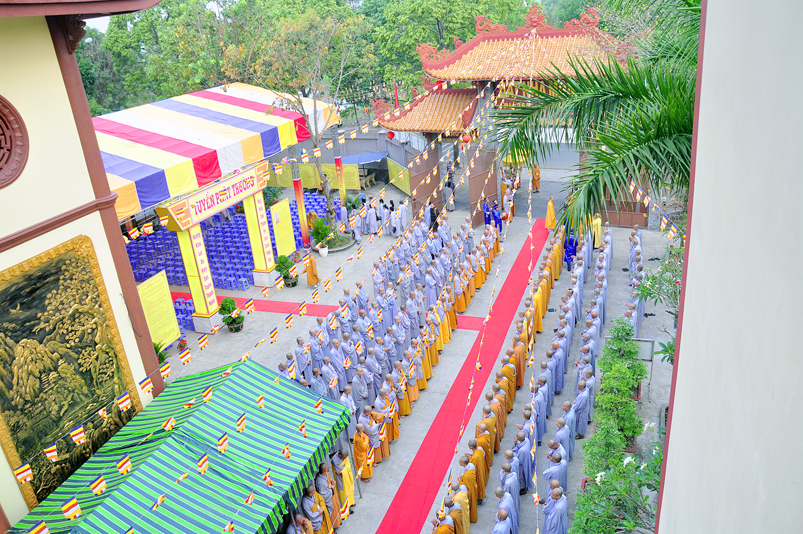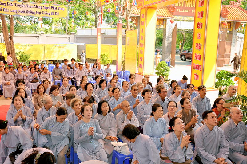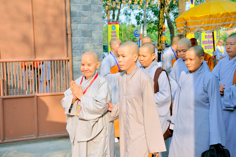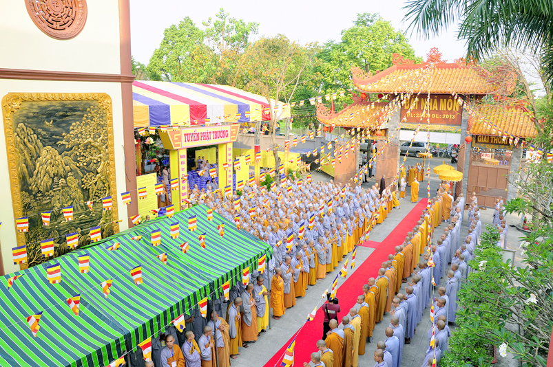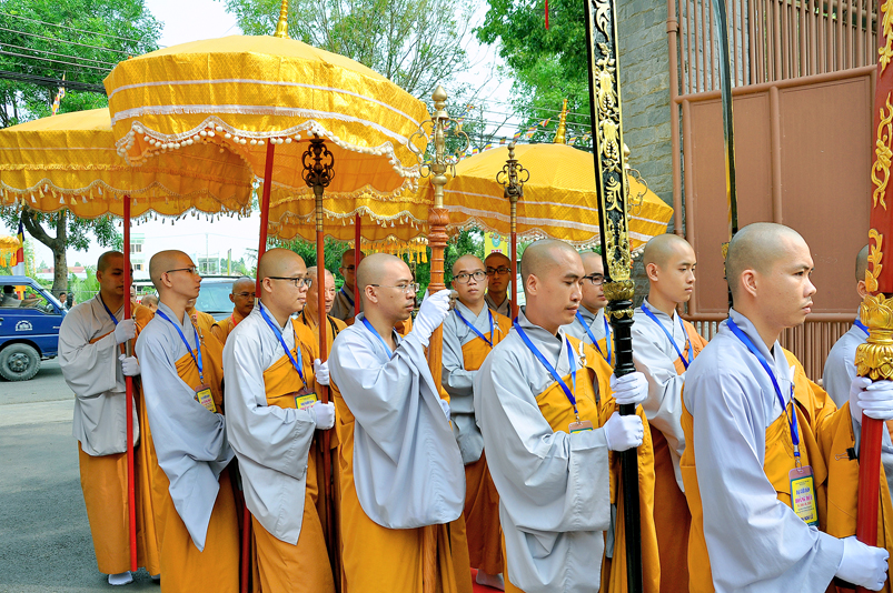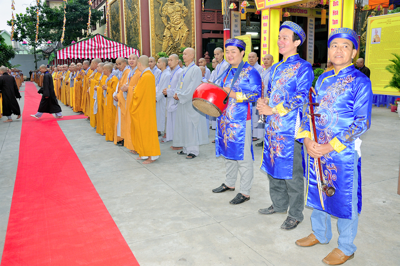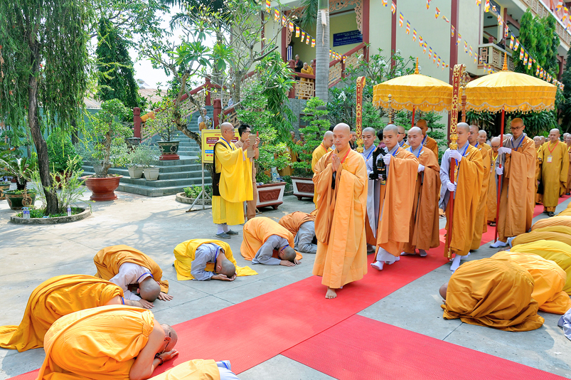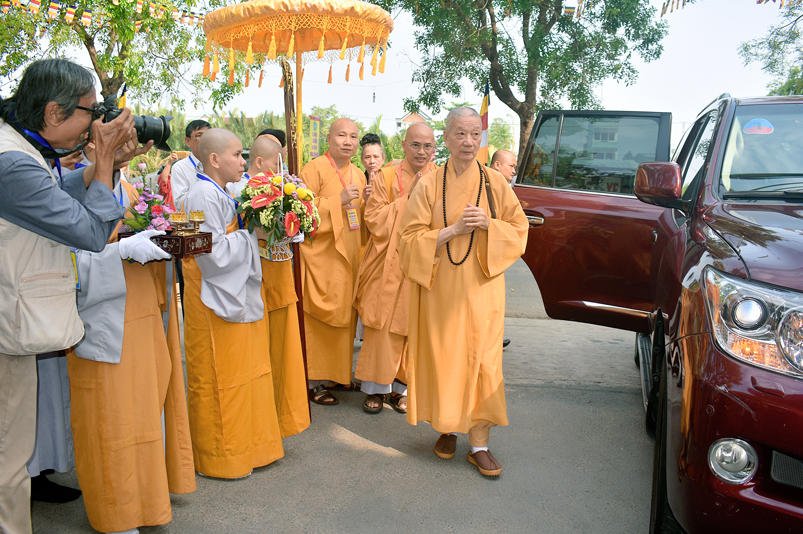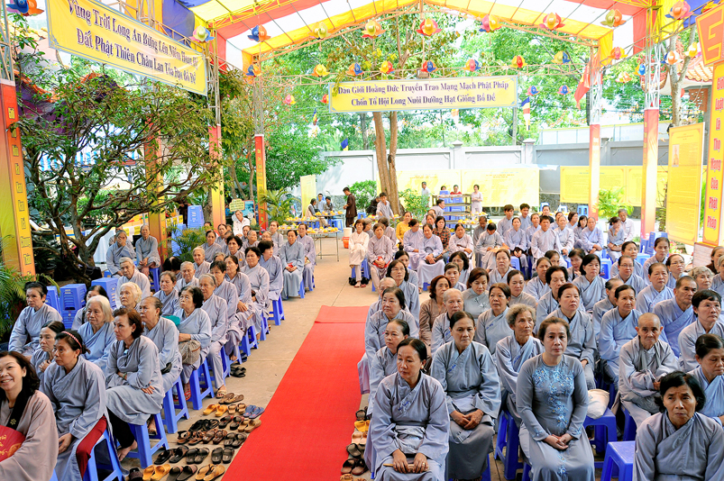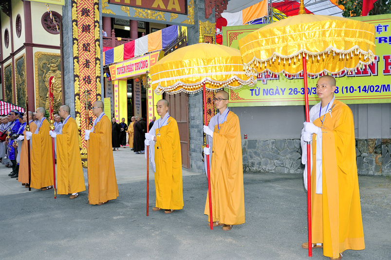 Vào lúc 7g, Ban Tổ chức đã trang nghiêm đàn tràng với hơn 800 giới tử nhất tâm cung đón chư Tôn đức Giáo phẩm TW, thành phố Hồ Chí Minh, chư Tôn đức Giáo phẩm tỉnh Long An, chư Tôn đức tỉnh thành bạn, chư Tôn đức Trưởng ban Trị sự liên huyện, chư Tôn đức trụ trì các tự viện trong và ngoài tỉnh, quý vị khách quý lãnh đạo các cấp chính quyền tỉnh quang lâm chứng dự Đại Giới Đàn.