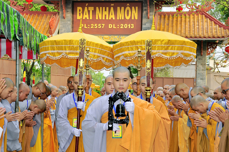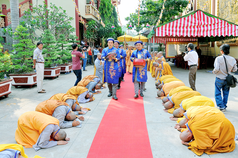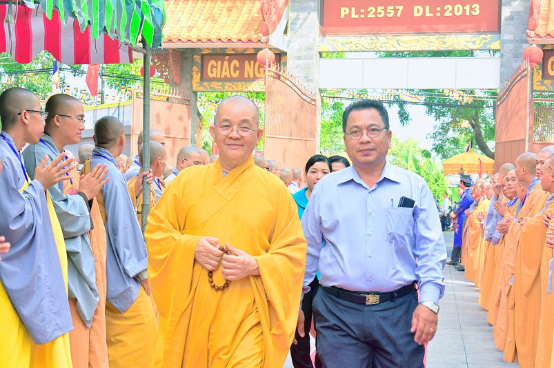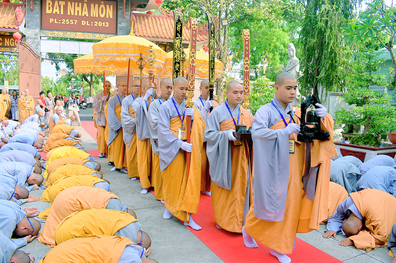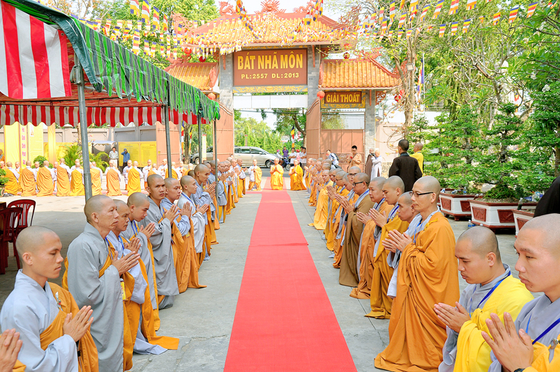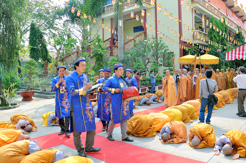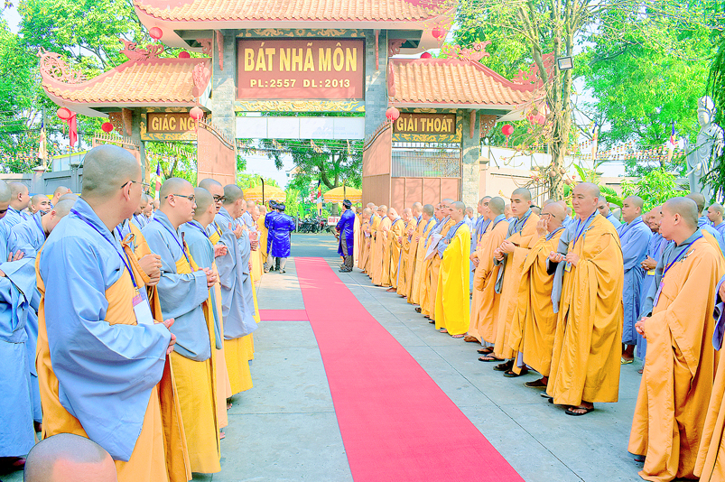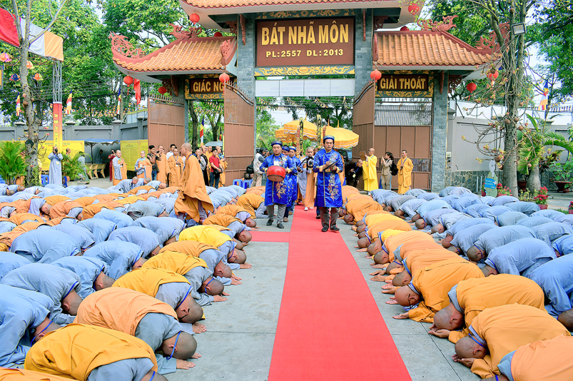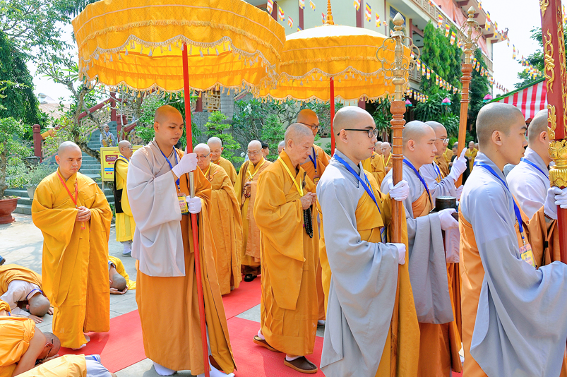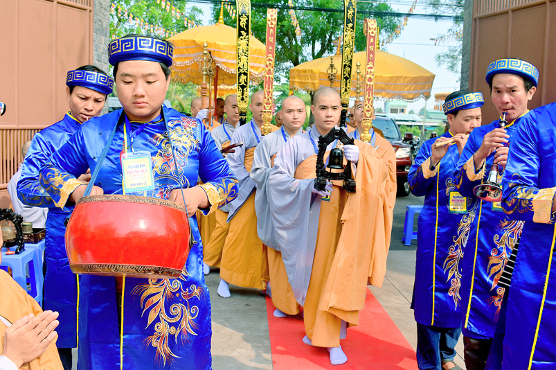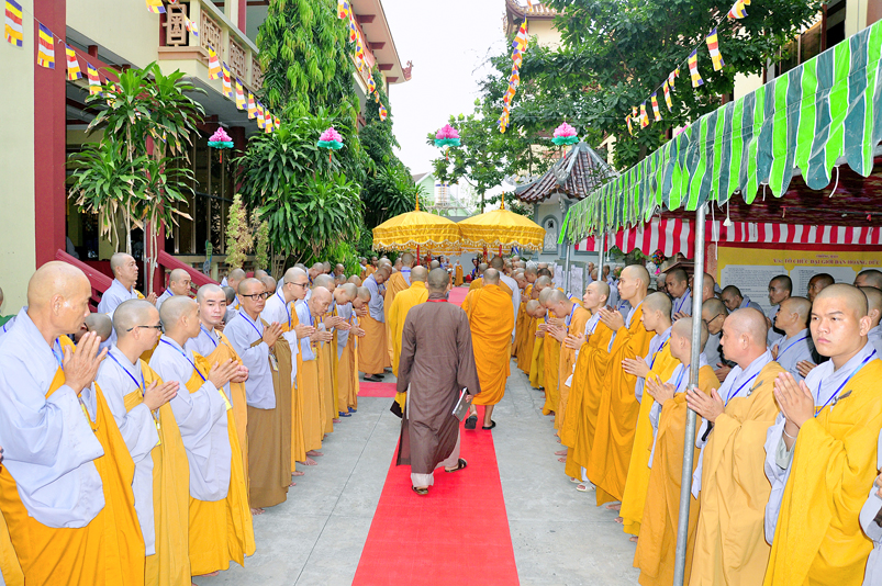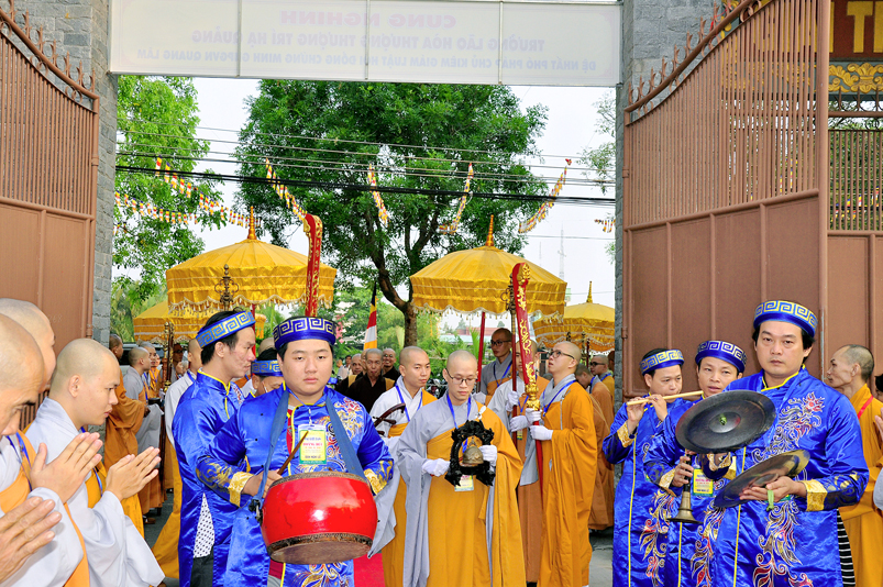 Vào lúc 7g, Ban Tổ chức đã trang nghiêm đàn tràng với hơn 800 giới tử nhất tâm cung đón chư Tôn đức Giáo phẩm TW, thành phố Hồ Chí Minh, chư Tôn đức Giáo phẩm tỉnh Long An, chư Tôn đức tỉnh thành bạn, chư Tôn đức Trưởng ban Trị sự liên huyện, chư Tôn đức trụ trì các tự viện trong và ngoài tỉnh, quý vị khách quý lãnh đạo các cấp chính quyền tỉnh quang lâm chứng dự Đại Giới Đàn.